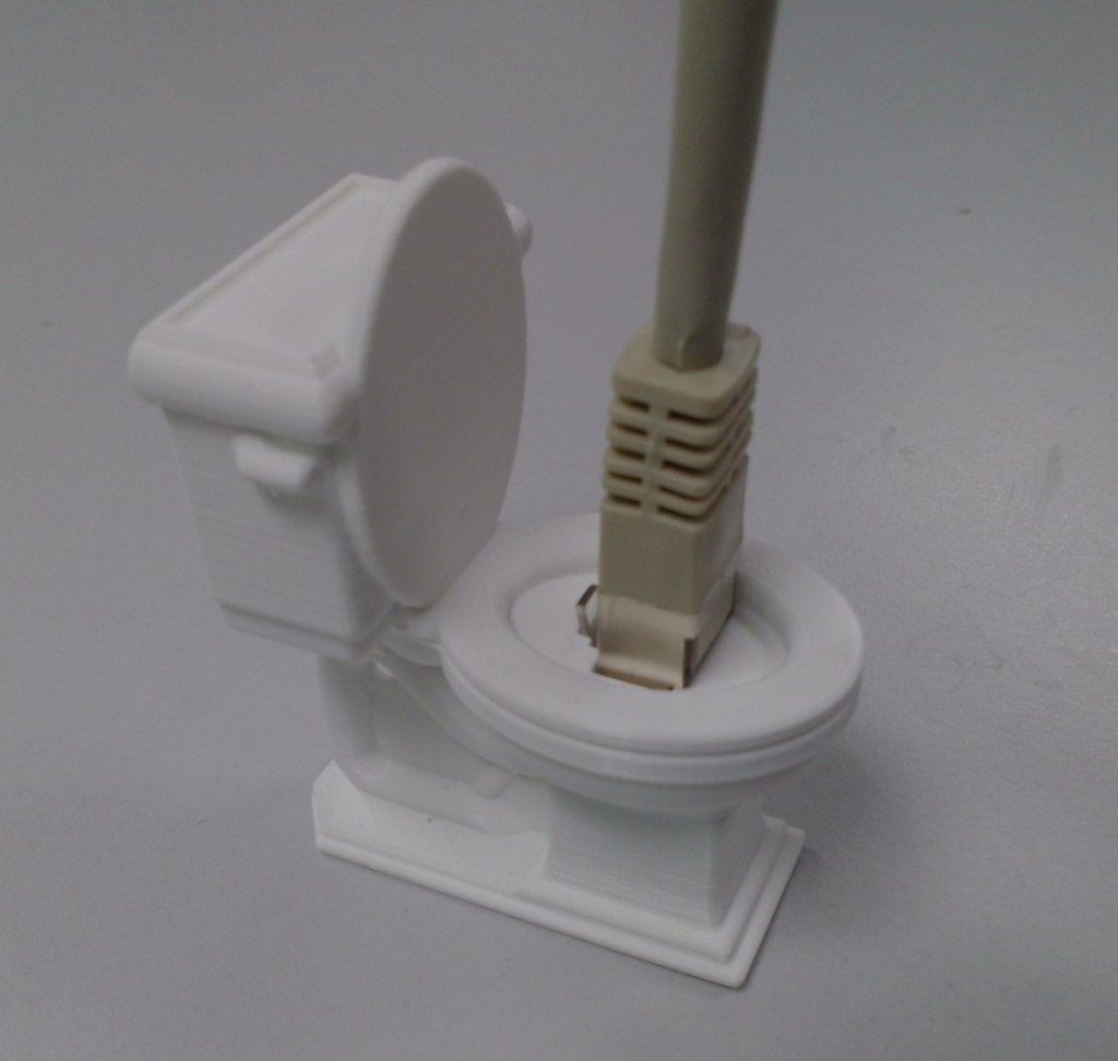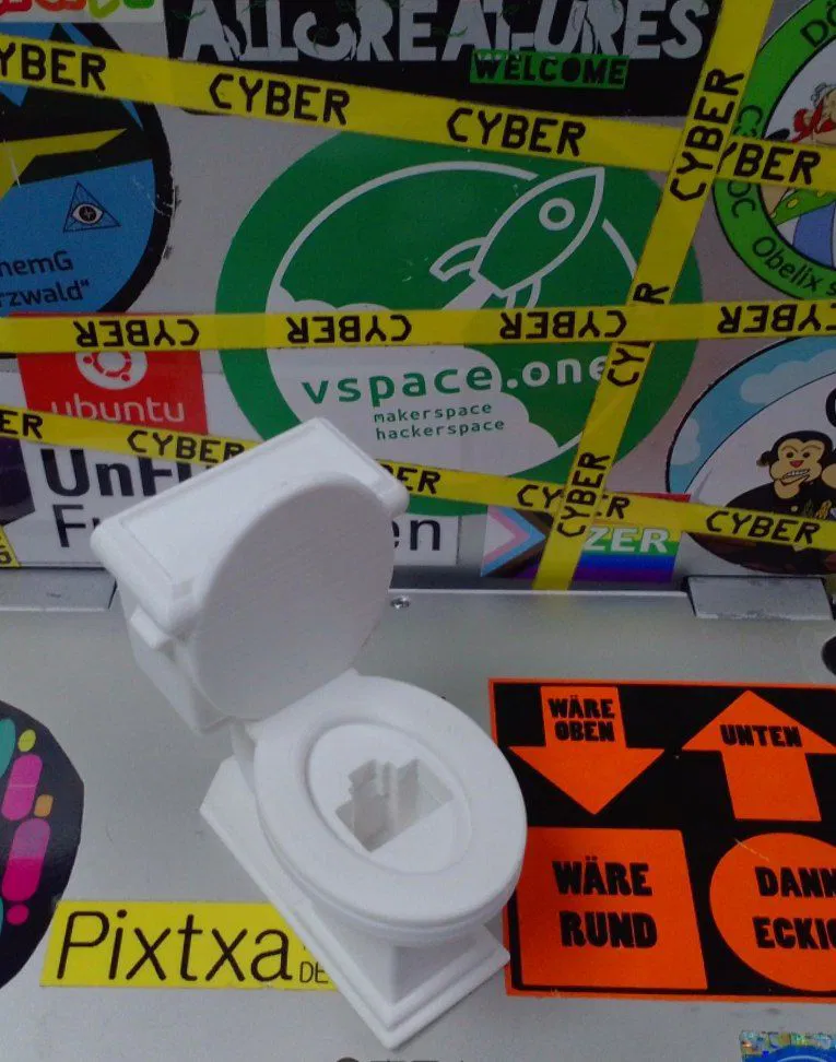 Không may là máy in 3D của trung tâm hacker/makerspace vspace.one ở đó không hoạt động. Tối thứ Ba ngày hôm sau tôi mới in được mô hình, nhưng dây LAN thì đã bị ai đó lấy đi mất rồi. Nhưng nếu họ có quay lại lần nữa, thì giờ đã có một cái "nhà vệ sinh dữ liệu" sẵn sàng cho họ rồi.