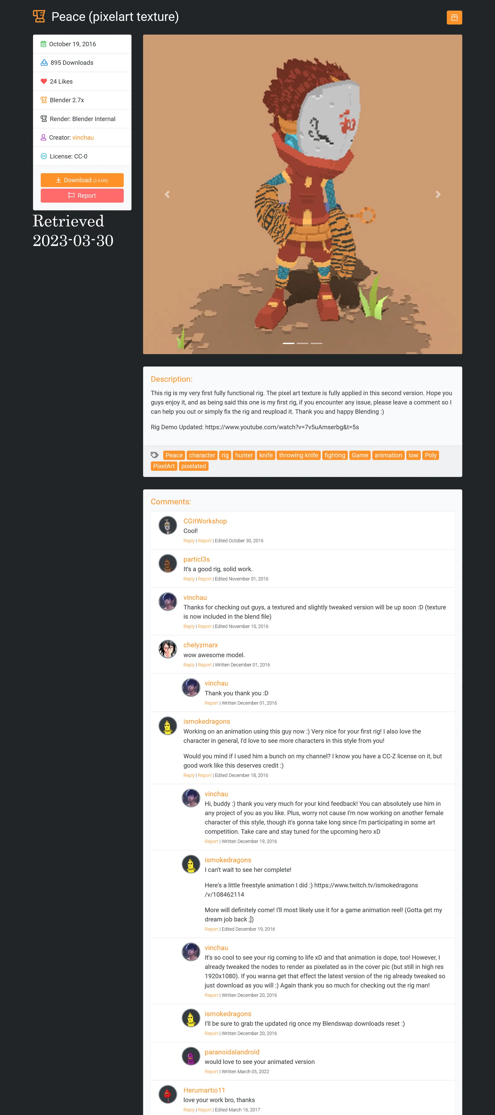 Mô hình thuộc phạm vi công cộng bởi vinchau. Phiên bản gốc được đăng tải trên Blend Swap. Thích hợp cho các dự án in 3D với phong cách nghệ thuật pixel độc đáo.