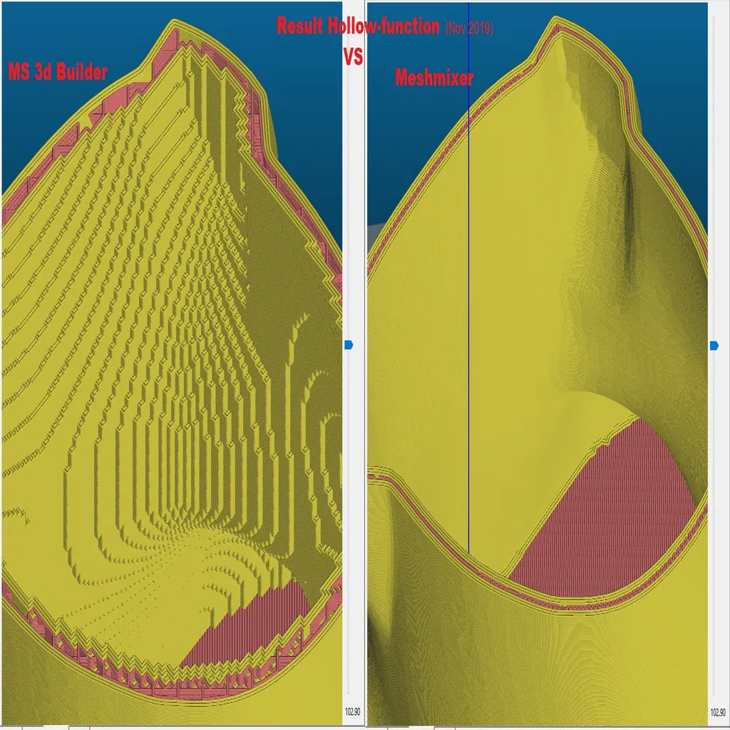 *Mặc dù tui có thể tạo ra cái này bằng cả hai phần mềm, nhưng kết quả của chức năng Hollow trong Meshmixer tốt hơn hẳn (xem hình). Nhưng mà, tui phải sửa file STL đó bằng 3d-builder trước khi nó có thể slice (slic3r) thành công. Hóa ra 3D Builder là công cụ sửa STL rất tốt.