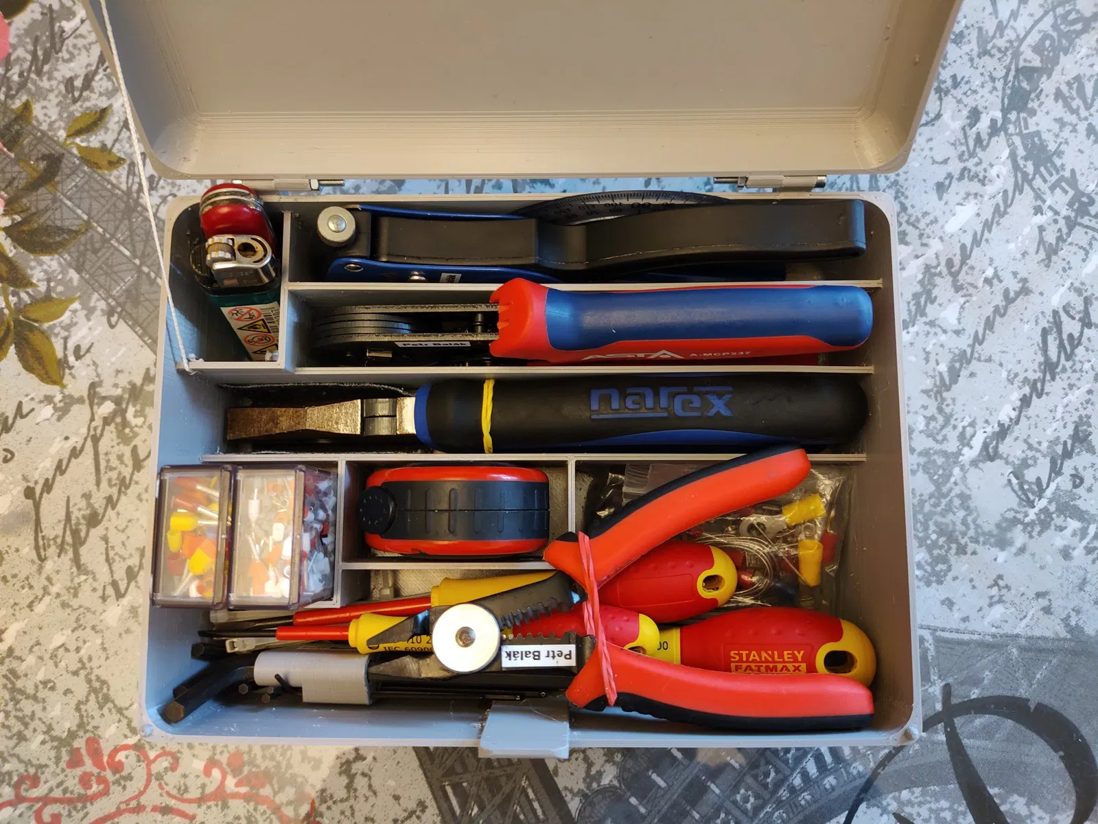 Cái vali nhỏ để dụng cụ (220x160x90mm). Nó chủ yếu dành cho bộ dụng cụ điện nhẹ 😼. Logo của tôi ở phía trên, đã được phóng to và in một phần như sau: (TRong các bức ảnh là phiên bản đầu tiên. Các bản lề đã được phóng to và dịch chuyển, nút mở là cố định và móc khóa đã được dịch chuyển)