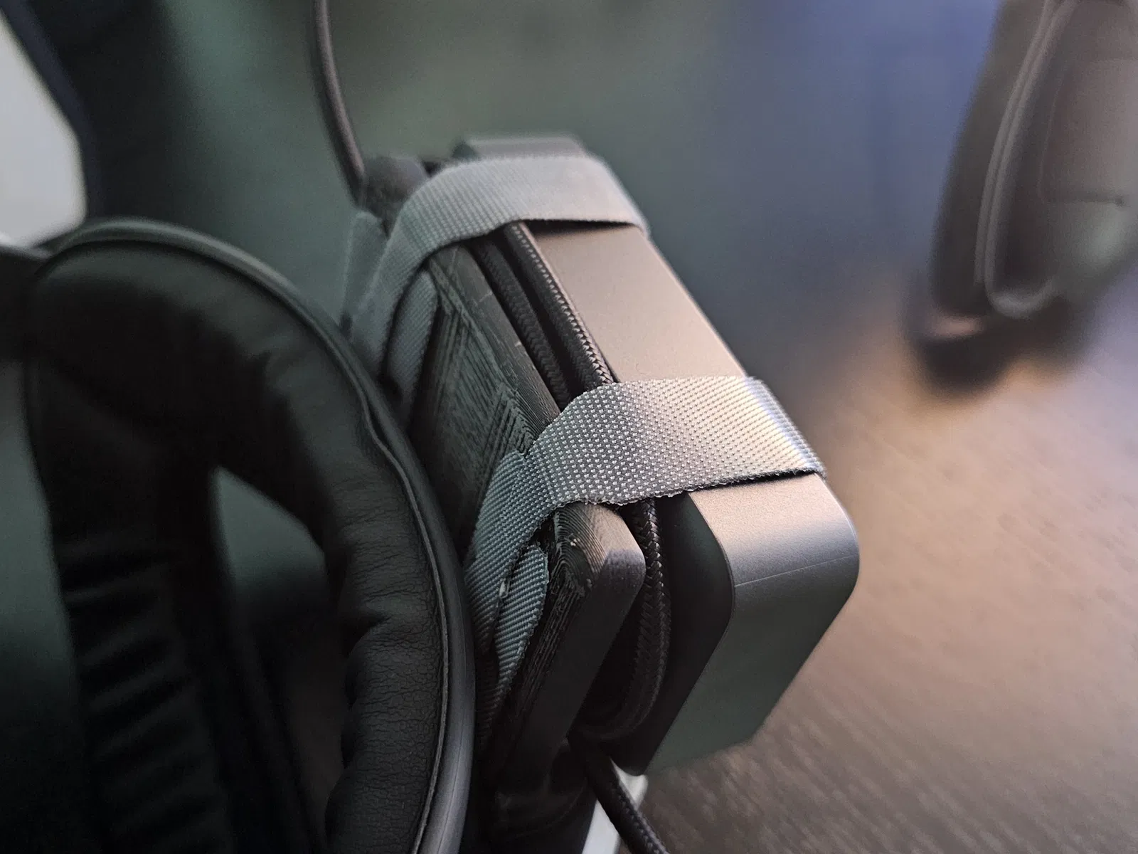 Thiết kế sử dụng dây đeo velcro để cố định đế thay thế vào dây đeo đầu vì tôi không tin tưởng ba ốc vít để chịu được trọng lượng của sạc dự phòng và các chuyển động quán tính lớn trong khi sử dụng tai nghe. Nếu muốn, bạn có thể sửa đổi mô hình để sử dụng ốc vít, nhưng hãy cẩn thận vì có thể cần in nhiều lần trước khi bạn có thể chỉnh sửa độ sâu của ốc vít cho phù hợp.