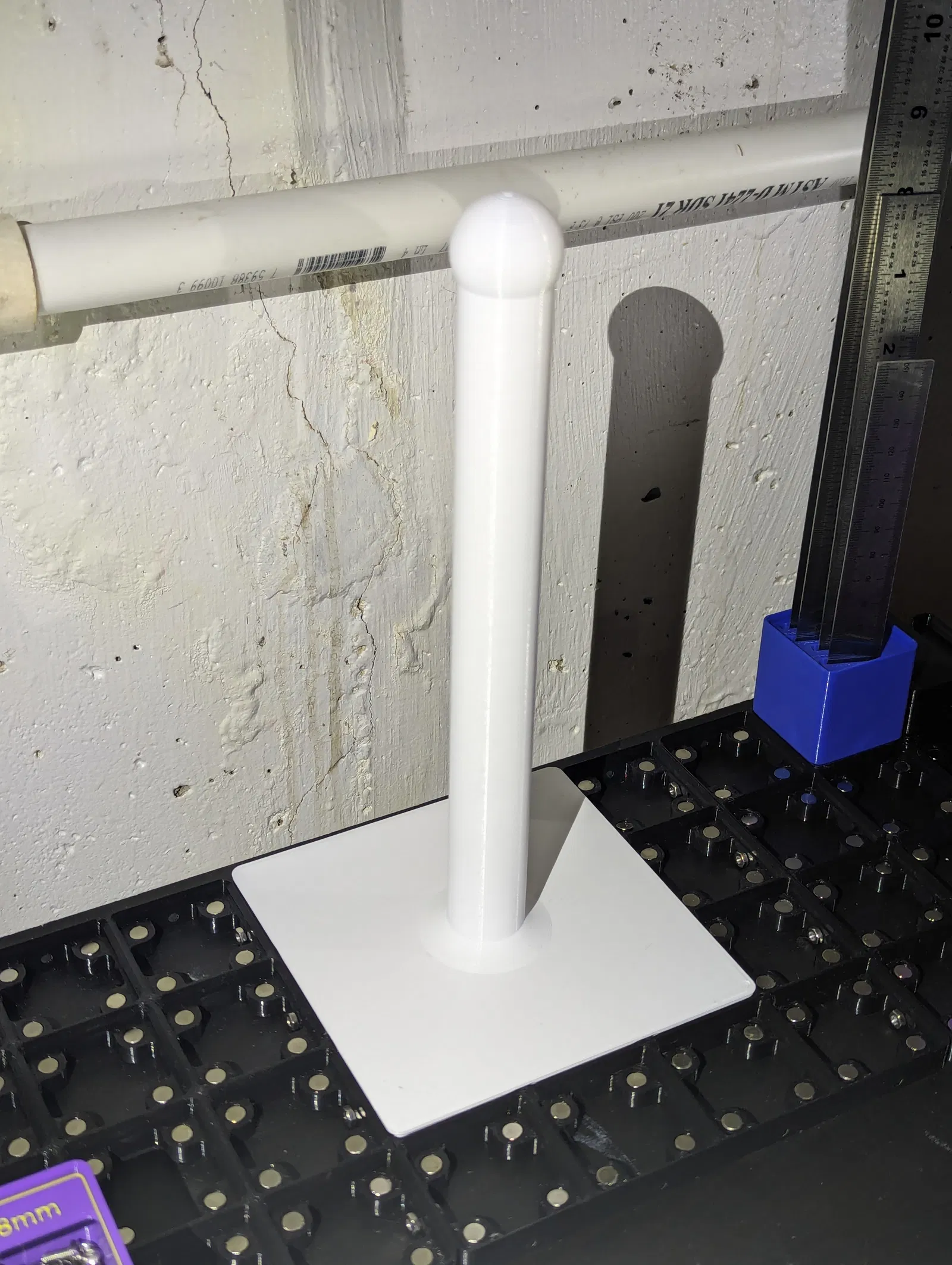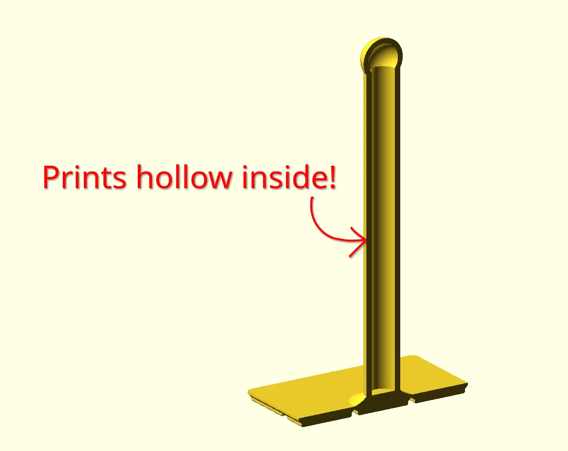 The paper towel rod may look solid, but it's designed hollow to minimize filament use. The bottom has 6x2mm magnet holes, courtesy of Gridfinity Rebuilt. These have a special design to assist with bridging, so the magnet holes print cleanly.