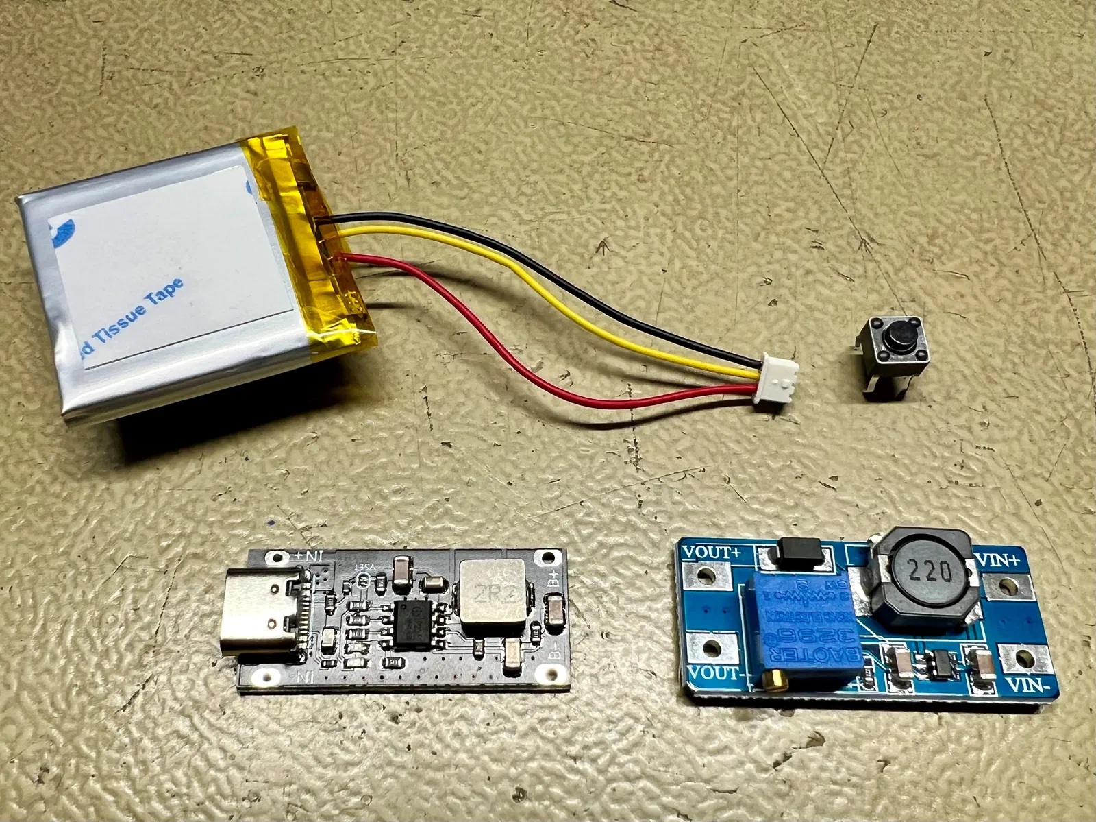 - 1 cục pin LiPo 4.2v 32x30x4 mm (phải gỡ bo mạch bảo vệ ra) [https://s.click.aliexpress.com/e/_DkvuQTf]
