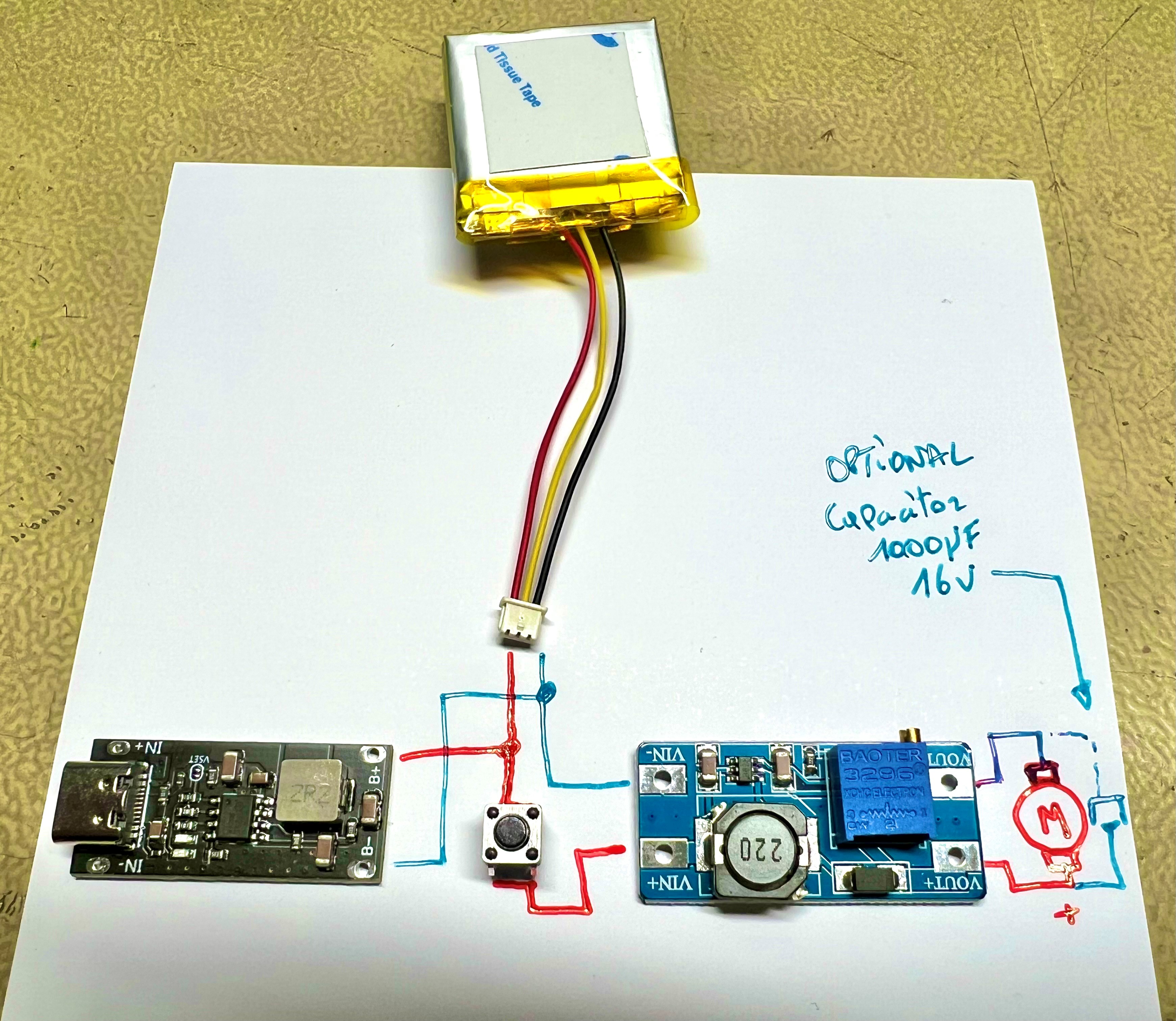 Có thêm một cái tụ 1000µF 16V tùy chọn sẽ giúp mô-tơ có thêm lực xay nha.