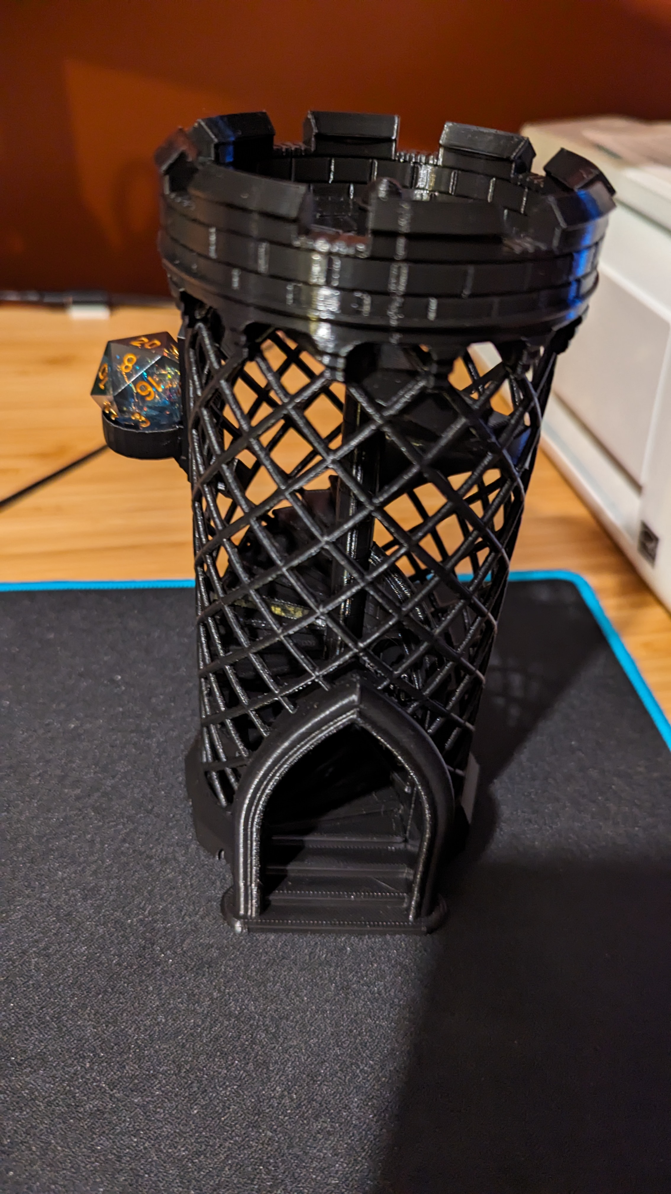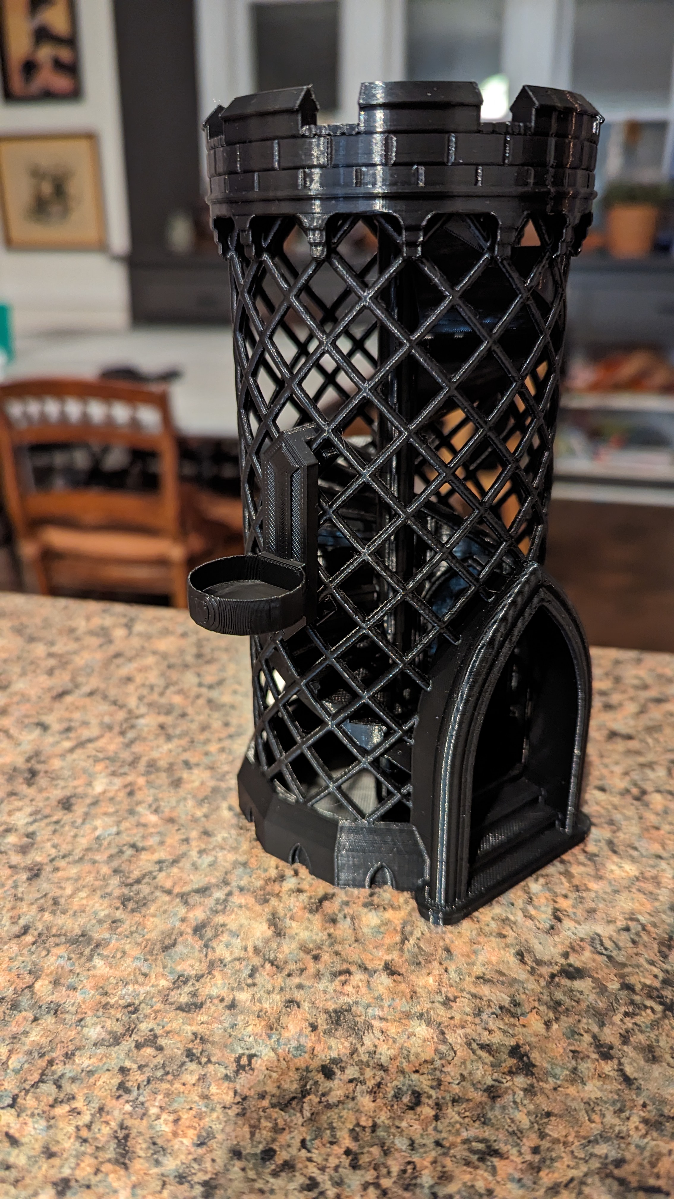 Cốc đựng xúc xắc gắn được vào Tháp Xúc Xắc In Nhanh (Print in Place Dice Tower). Nó khớp vào các khe hình kim cương trên lưới tháp và giữ cố định. Đủ lớn cho xúc xắc D20 hoặc các loại tiêu chuẩn. Có mẹo khắc phục lỗi in và gợi ý phát triển thêm.