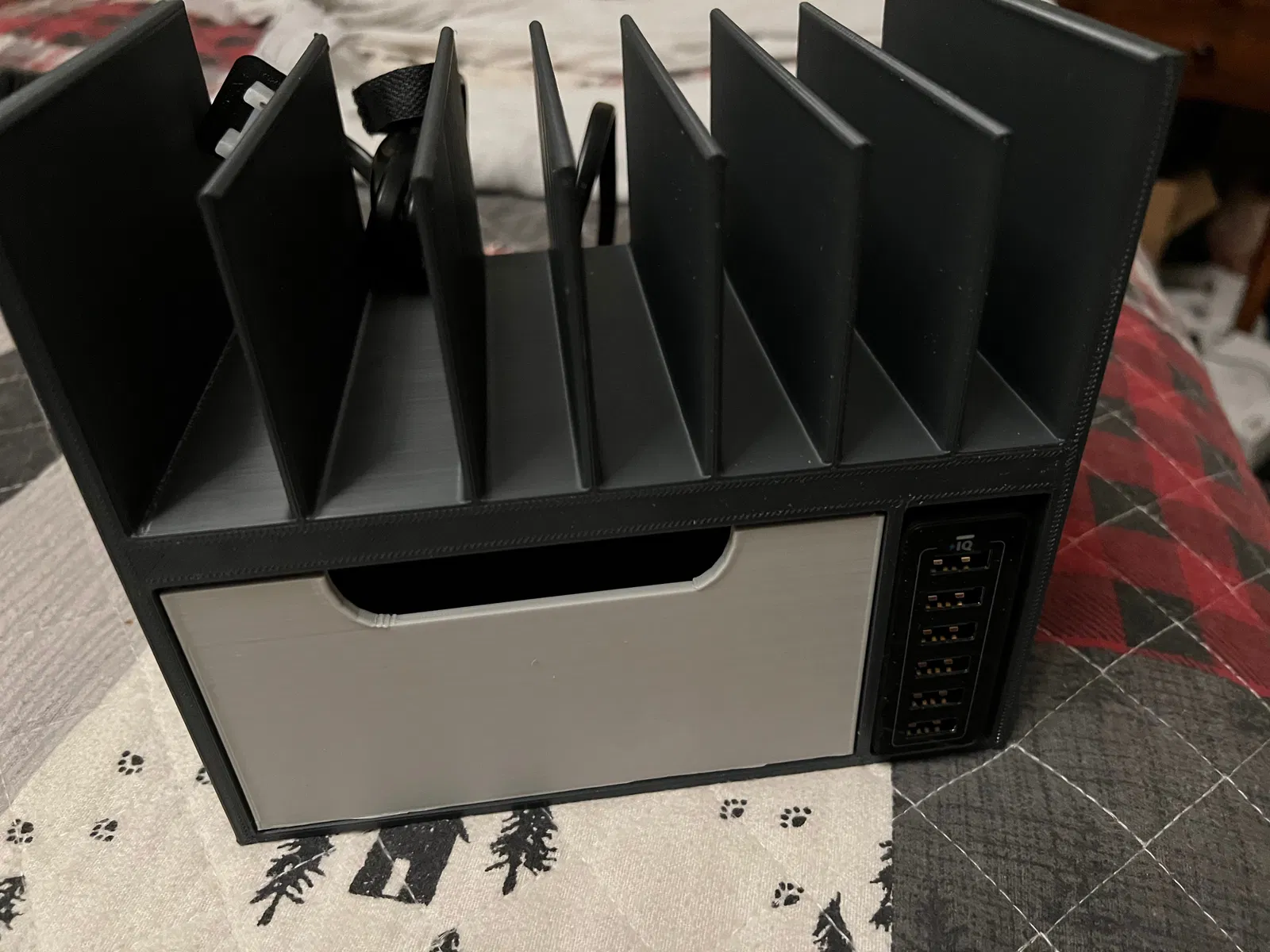 Phiên bản làm lại của Trạm sạc máy tính bảng, được tùy chỉnh để phù hợp với bộ sạc nhỏ hơn và có thêm ngăn kéo tiện lợi. Được in bằng PLA+ trên máy Ender3Pro với thông số kỹ thuật chi tiết, mang đến giải pháp lưu trữ và sạc hiệu quả cho máy tính bảng của bạn.