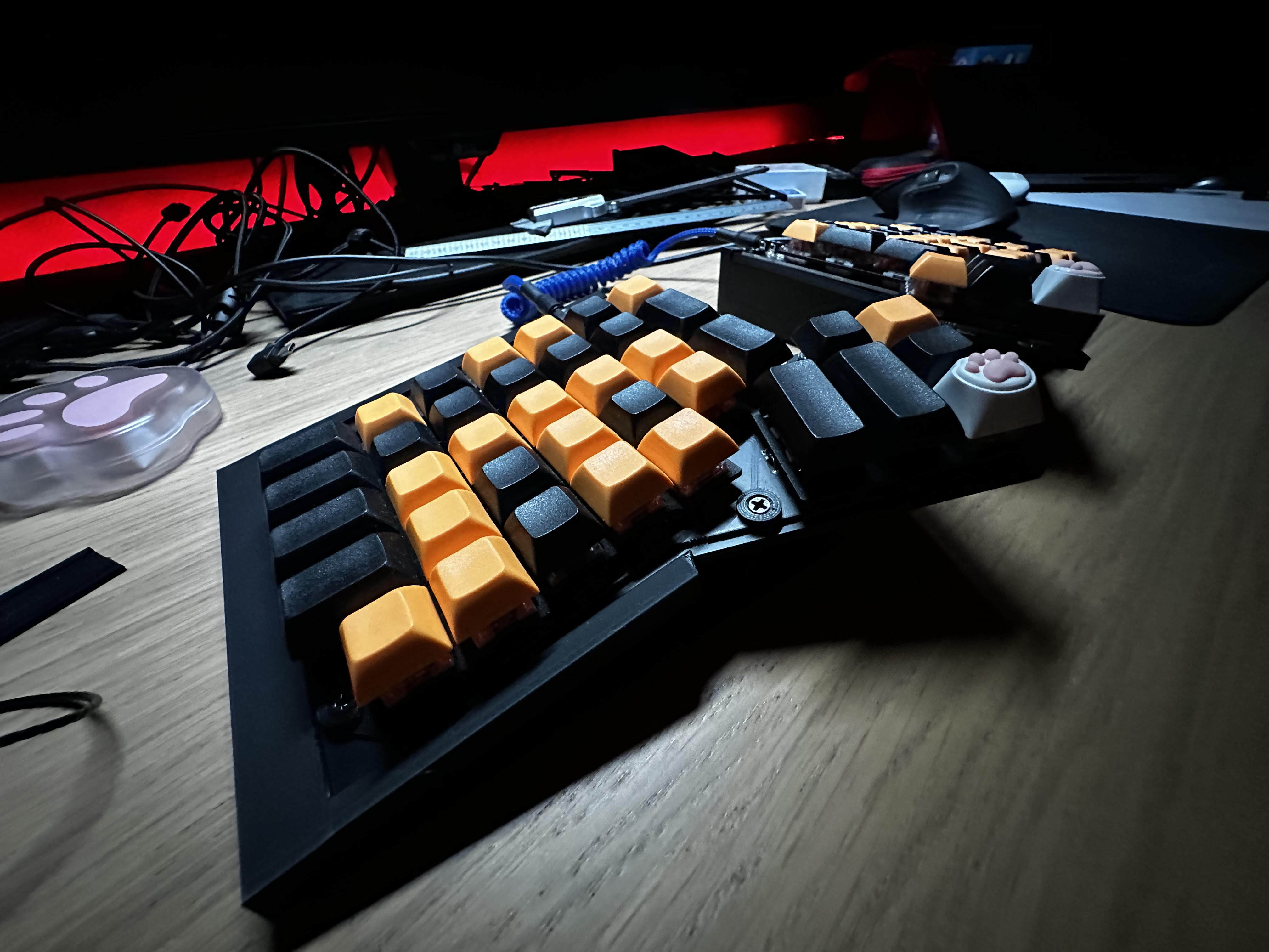 Tui muốn cái bàn phím nó nghiêng nghiêng cho nó ngon á. Nên tui tự làm cái mẫu này. Cái hay nữa là nó có thể thay đổi độ nghiêng dễ dàng – nếu muốn nghiêng nhiều hơn, chỉ cần in cái đế khác rồi gắn cái phần trên vô. Hai cục này nó ăn khớp với nhau chắc lắm. Tui còn nhét mấy miếng bông trang điểm vô cái đế để khỏi bị vang á, xài ngon lành cành đào, nghe âm thanh đã lắm.