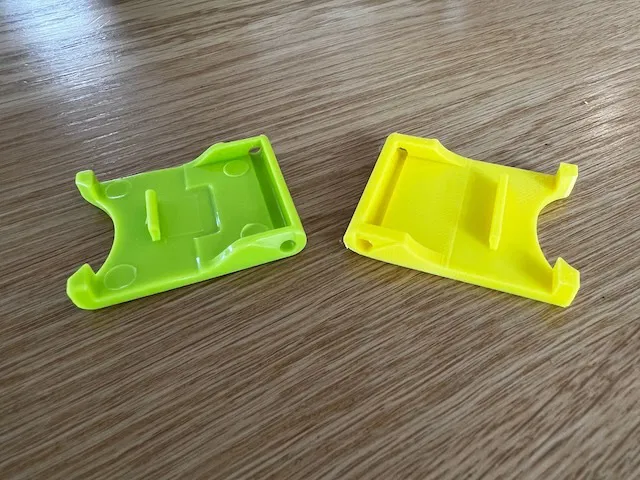 Hình ảnh cho thấy cái kẹp zin (màu xanh lá) và cái làm bằng máy in 3D (màu vàng). Tui có hơi lo là cái chốt nhỏ để gài vô hộp cơm sẽ dễ gãy khi in 3D, nên tui làm nó bự hơn chút. Cảm giác nó đủ chắc chắn và cái kẹp thay thế này gài vô cũng y như cái zin.