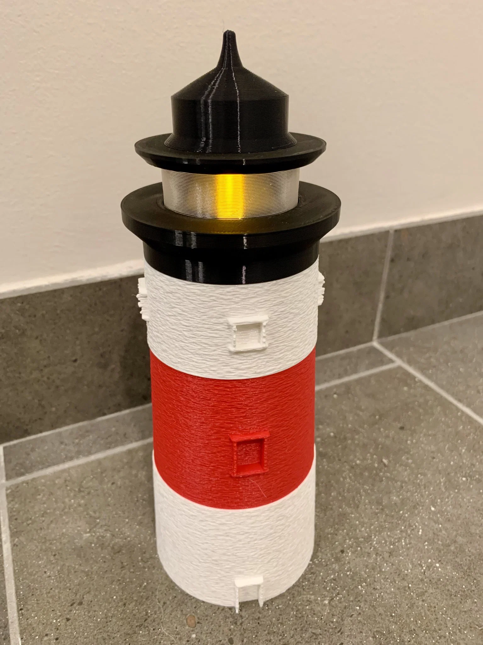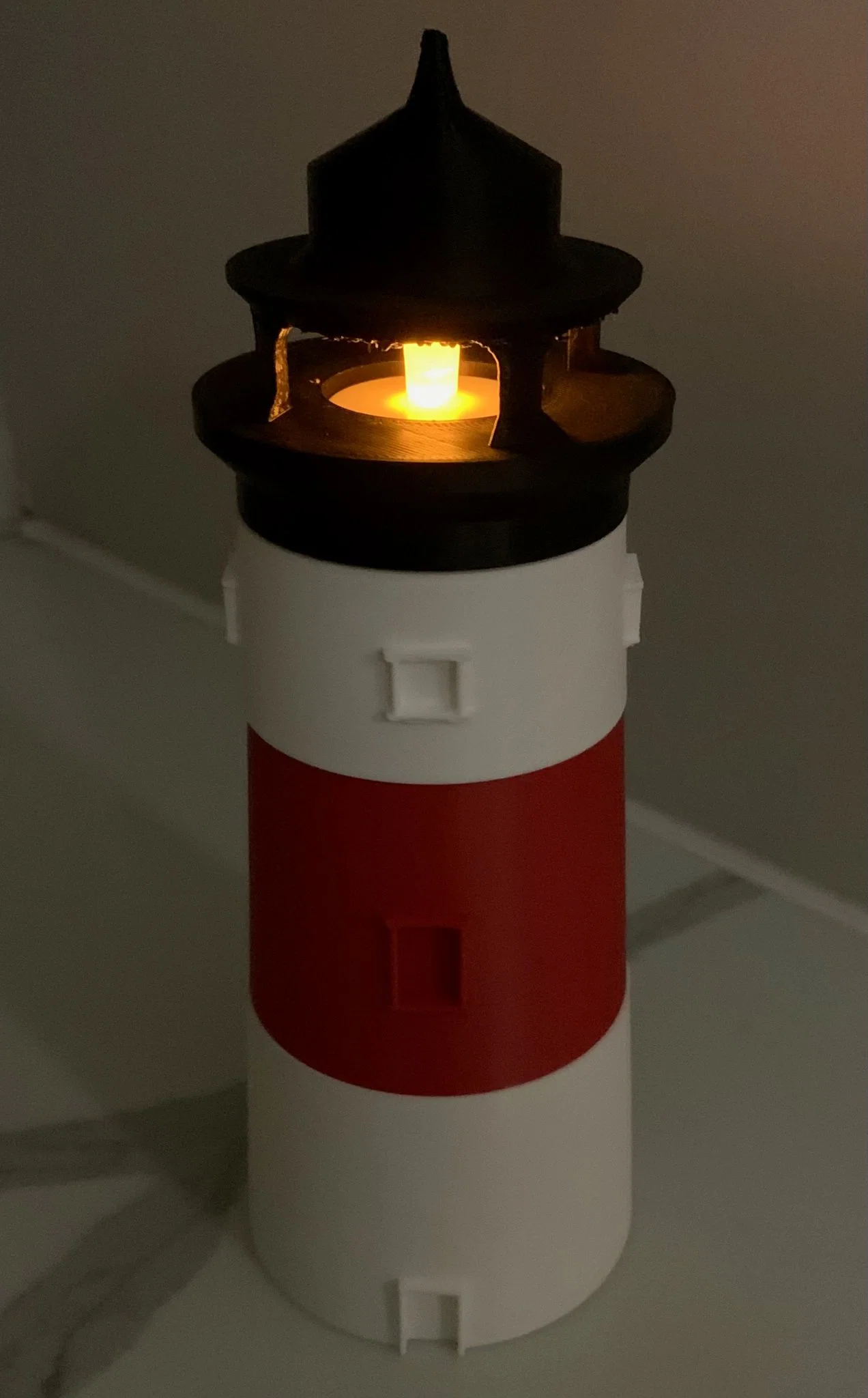 Đây là một mô hình của ngọn hải đăng có một chỗ ở trên cùng để một ngọn nến có thể ngồi. Điều này cho phép ánh sáng phát ra từ đỉnh của ngọn hải đăng. Những ngọn nến mà tôi sử dụng có đường kính đáy là 1. 4in và chiều cao là 1. 6in. Tôi đã in các bộ phận 1-3 với một bộ điều chỉnh da mờ với các cài đặt mặc định. Đối với tất cả các bộ phận, tôi đã sử dụng PLA, một vòi phun 0. 6mm, và chiều cao lớp 0. 3mm. Đối với cửa sổ trong suốt ở trên cùng, tôi đã sử dụng PETG trong suốt, và in ở chế độ bình hoa với chiều cao lớp 0. 45mm và quạt làm mát tắt. Nếu bạn không có bất kỳ vật liệu trong suốt nào, tôi đã tải lên một phần trên cùng là một khối, nhưng nó yêu cầu hỗ trợ dưới phần nhô ra. Tôi đã sử dụng keo siêu dính để gắn các mô hình 1-3, và cũng đã sử dụng keo siêu dính để gắn các bộ phận 4-6. Tất cả các mô hình đều có các bộ phận căn chỉnh nên chúng sẽ căn chỉnh với nhau mà không gặp vấn đề gì. Ngọn hải đăng này được mô phỏng theo Ngọn hải đăng Sankaty Head trên đảo Nantucket, Hoa Kỳ. Tea-Lighthouse 2: