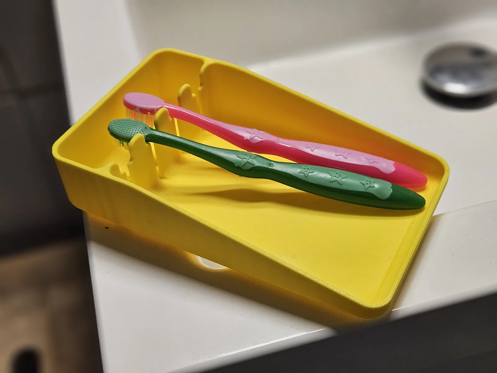 Kệ để bàn chải đánh răng được thiết kế để đặt trong ngăn kéo, giúp giữ cho bàn chải của bạn khô ráo và ngăn nắp. Các cạnh được làm mịn giúp dễ dàng vệ sinh, và thiết kế nghiêng giúp nước thoát đi, giữ cho bàn chải luôn sạch sẽ. Sản phẩm này có thể được in 3D mà không cần vật liệu hỗ trợ, rất tiện lợi.