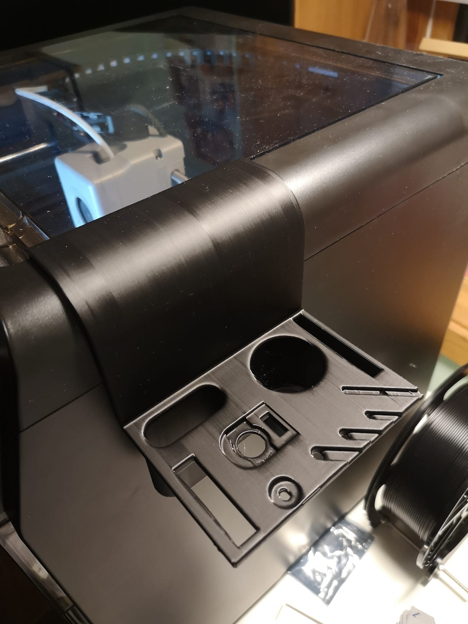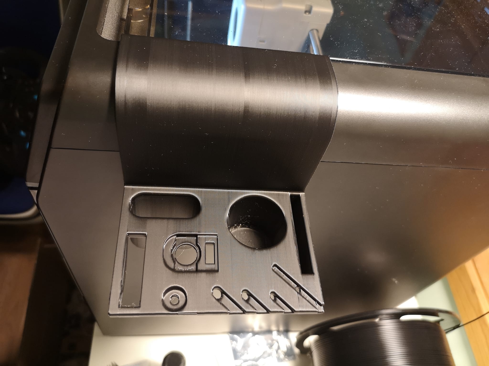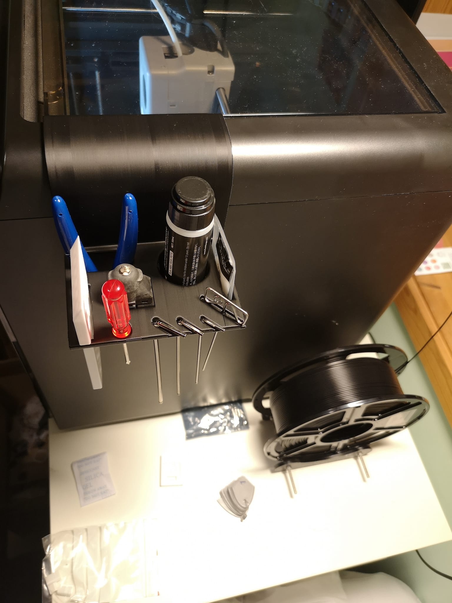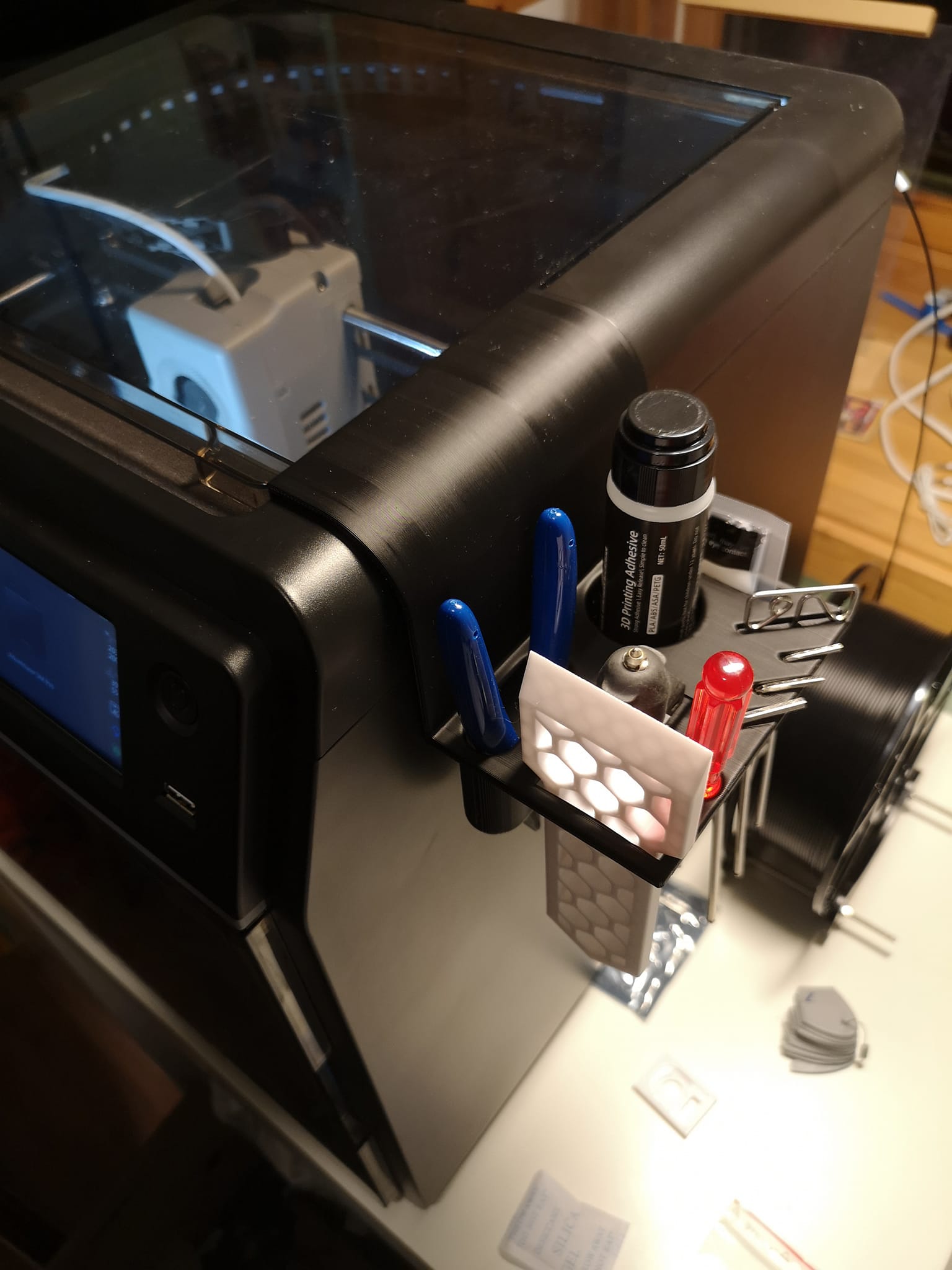 Tui đã làm cái mẫu này để gom hết mấy món đồ nghề theo máy FF ADV5M PRO nè: kềm cắt, tua vít, lục giác, keo hồ, mỡ bôi trơn, kim vệ sinh đầu phun, cụm đầu phun/vòi phun dự phòng và USB, còn có chỗ để gắn cái gạt mật ong bằng nhựa in ra đi kèm máy nữa. Mấy tấm hình đính kèm là lúc mẫu chưa có khe cắm USB nha, tui mới thêm vô sau này đó.