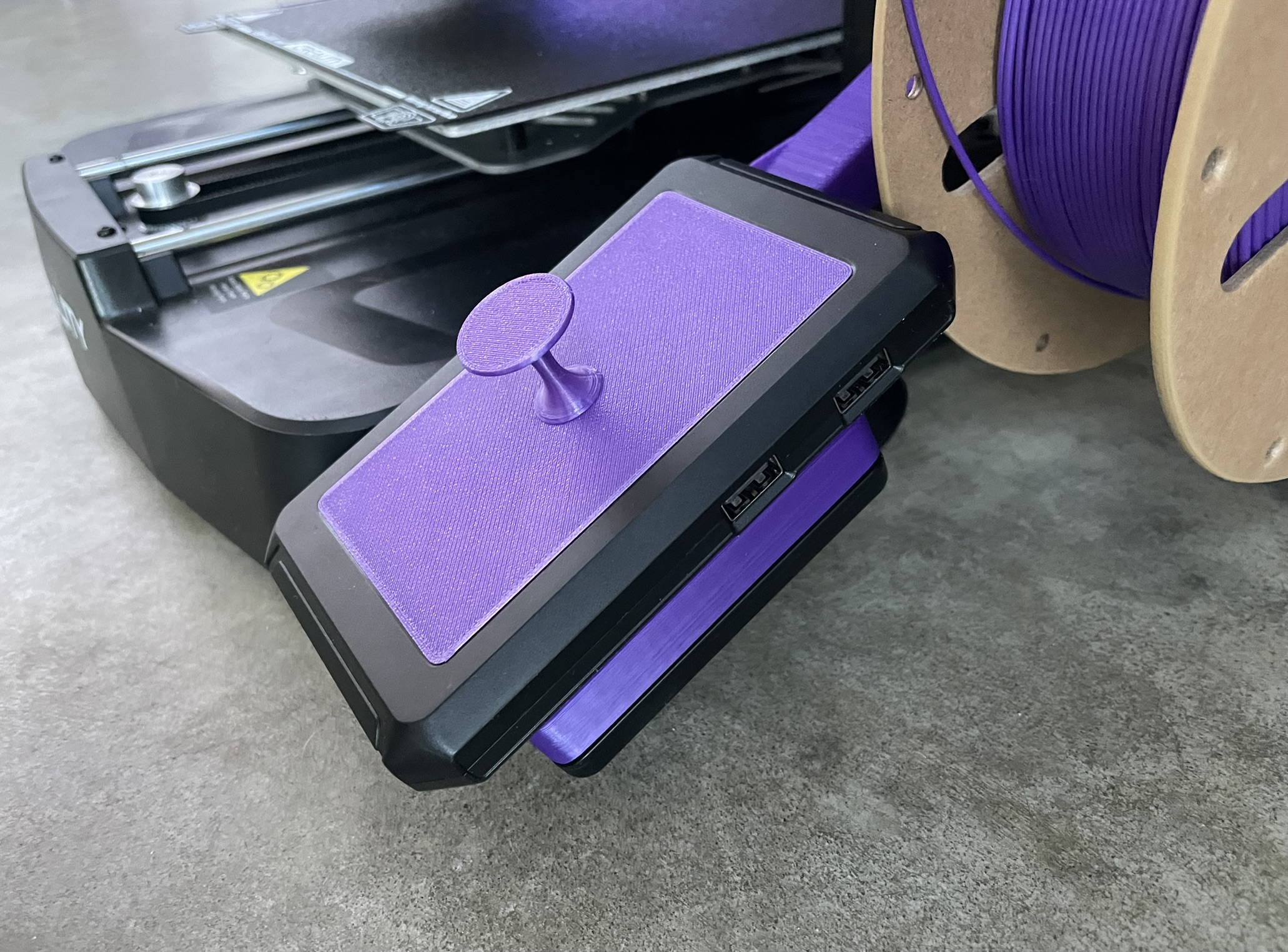 Máy in chạy khá xóc, nên tôi thiết kế giá đỡ cuộn dây gắn thẳng vào đế giúp máy ổn định hơn và thấp hơn. Giá đỡ tận dụng không gian phía sau Nebula Pad, lắp đặt dễ dàng không cần dụng cụ. Nó vừa một cuộn 20cm và có thể in không cần hỗ trợ.