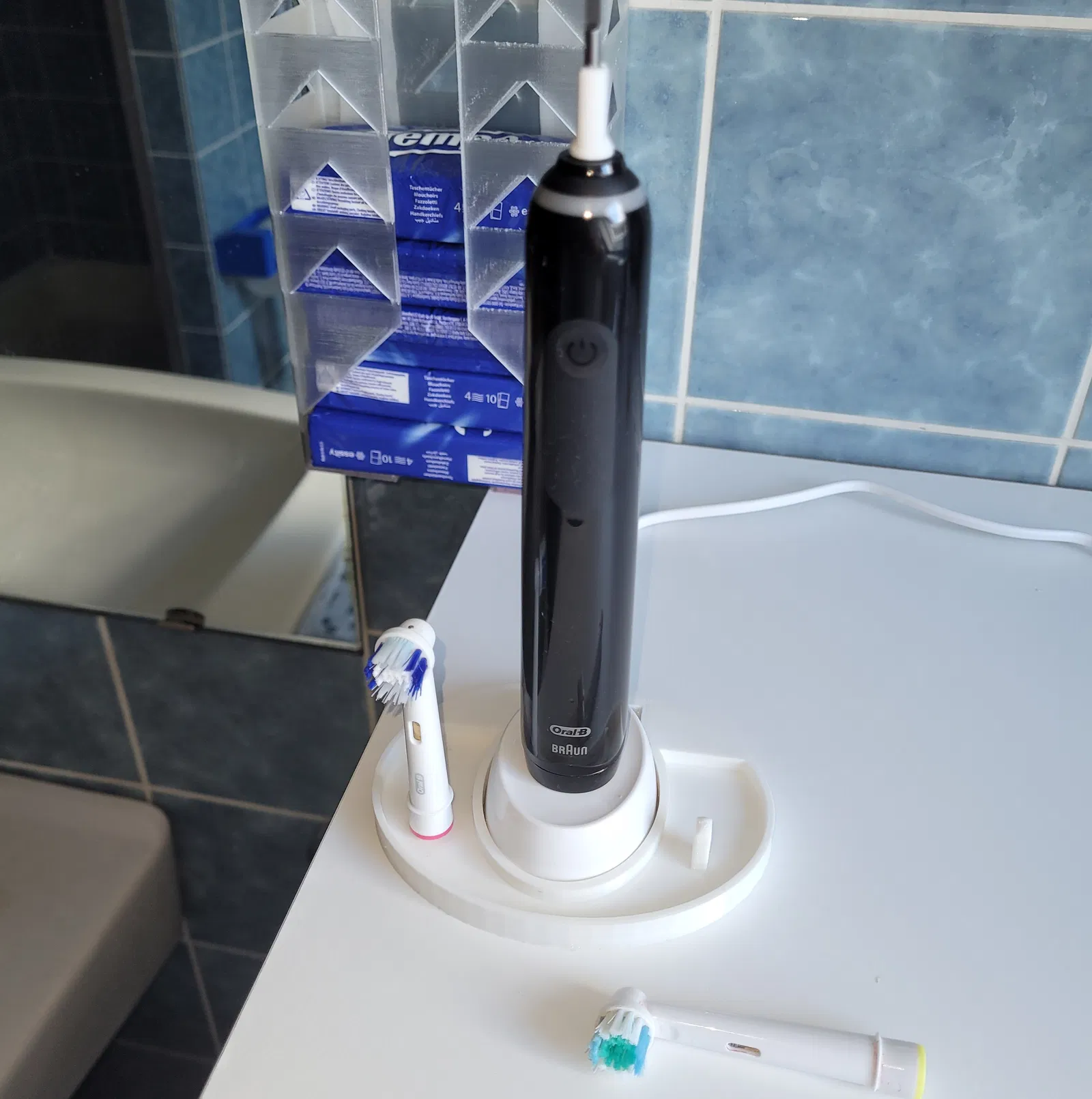Các giá đỡ bàn chải trước đây hơi rộng so với bàn chải mới và phần chân hơi yếu. Bây giờ chúng đã ổn định hơn và bàn chải không còn bị kẹt trên giá đỡ nữa. Tôi cũng đã tạo một phiên bản có đế được giữ cố định bằng nam châm (10x1,5mm). Điều này giúp giá đỡ ổn định hơn nhờ trọng lượng của sạc và motor.