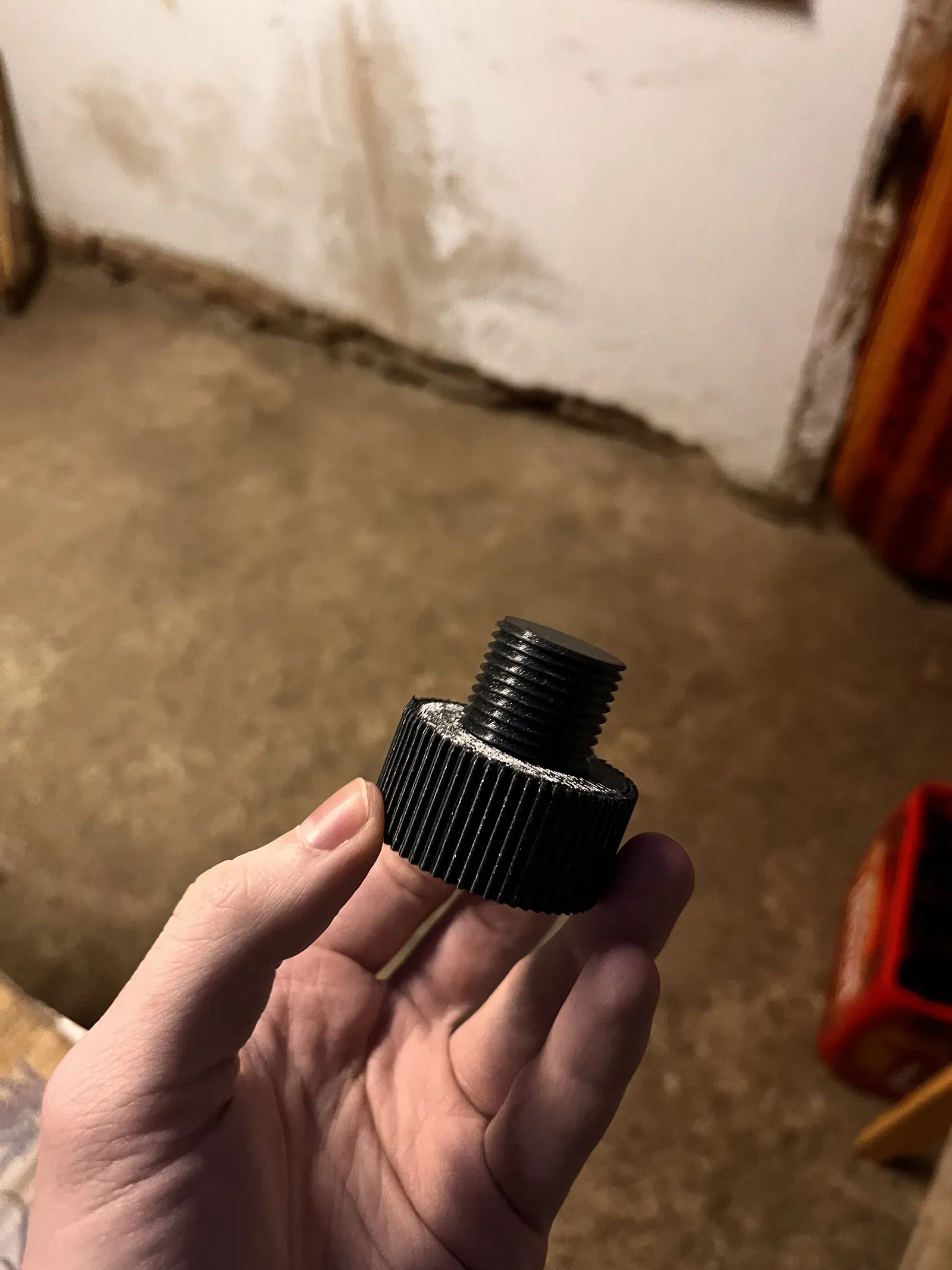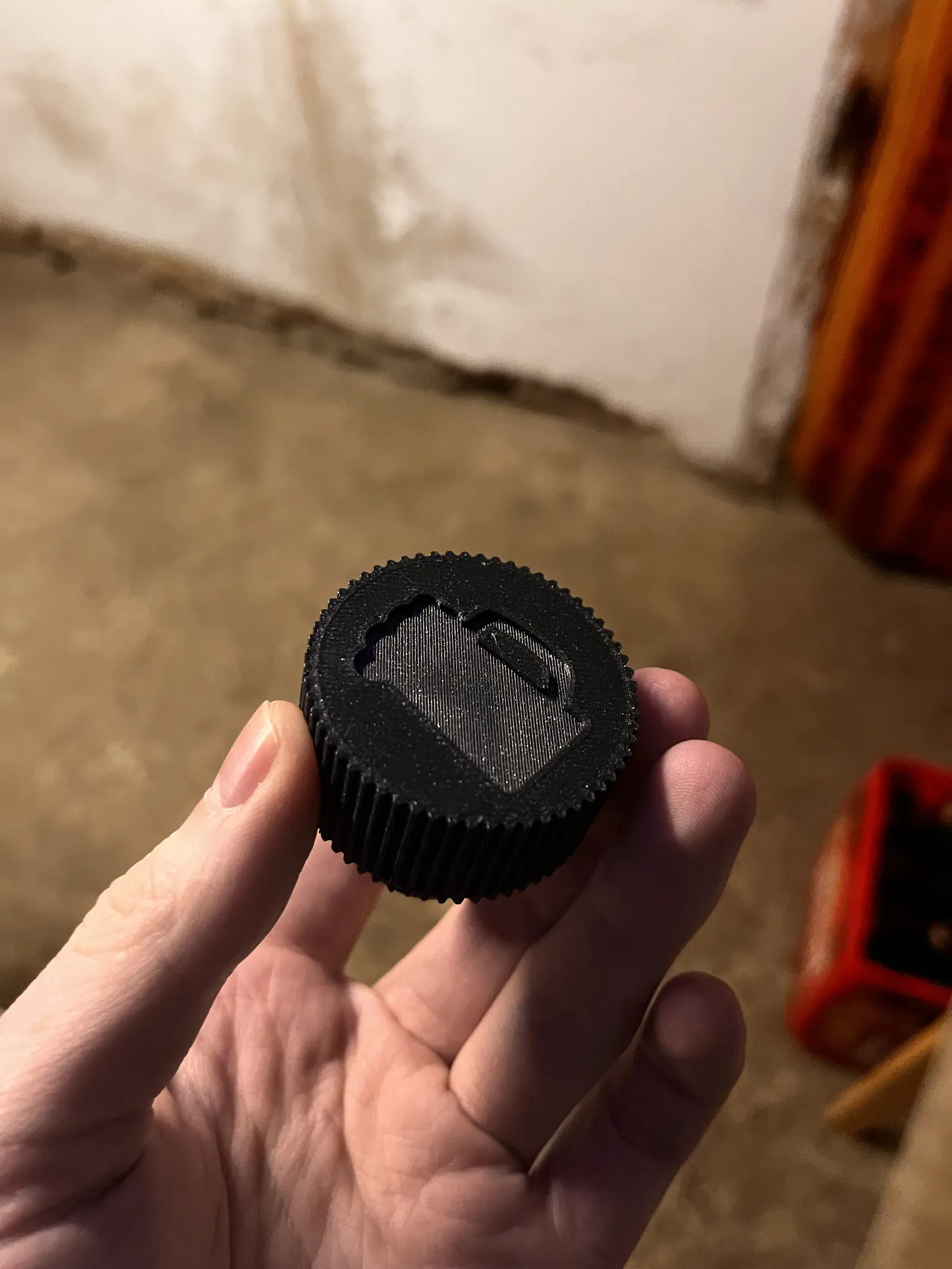Vít thay thế nút cao su cho thiết bị rót bia Lindr, giúp che lỗ hổng một cách chắc chắn và thẩm mỹ với biểu tượng bia. In bằng PLA, 10% độ điền đầy, không cần hỗ trợ.