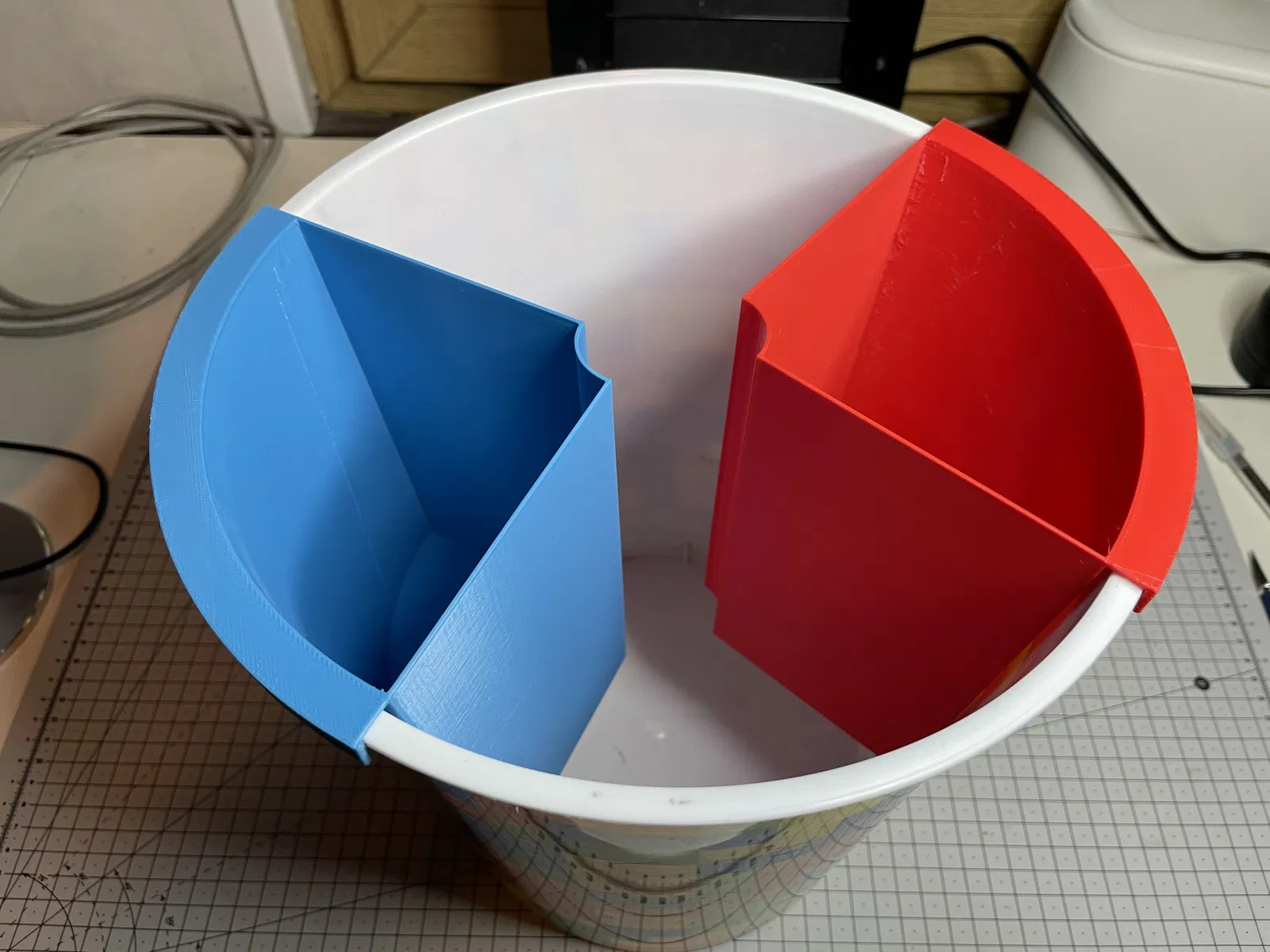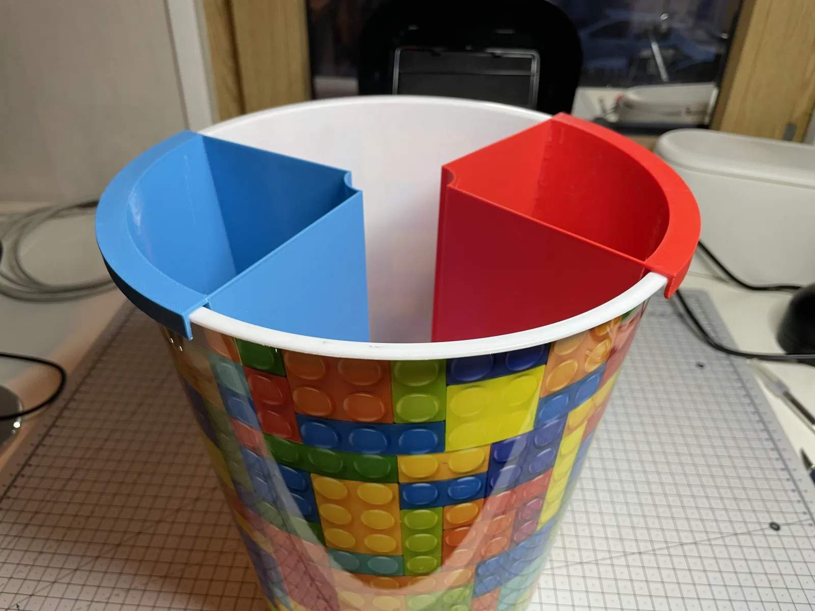 Tui đã tạo ra cái khay đựng rác cho thùng rác văn phòng của IKEA để hỗ trợ việc phân loại rác. Tui đã in 2 khay cho mỗi thùng rác với các màu khác nhau: một cái cho rác thải còn lại, một cái cho nhựa (và thùng rác thì cho giấy).
