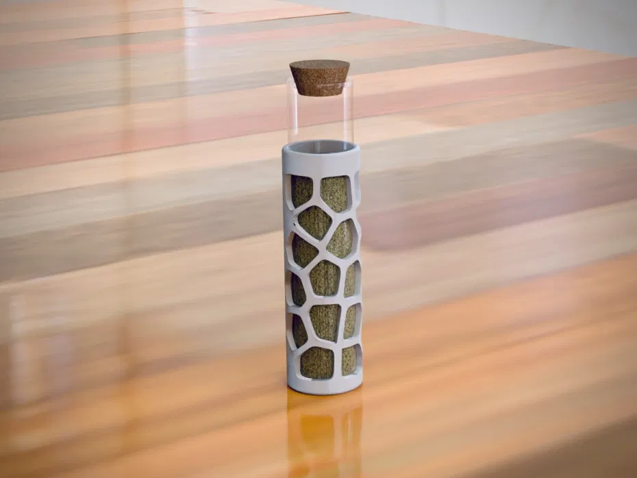 Giá đựng ống gia vị đẹp mắt với họa tiết voronoi. Sản phẩm này ôm rất chặt ống nghiệm, có thể cần điều chỉnh kích thước tùy loại nhựa in. Họa tiết voronoi bao phủ 2/3 bề mặt, tạo điểm nhấn độc đáo cho không gian bếp.