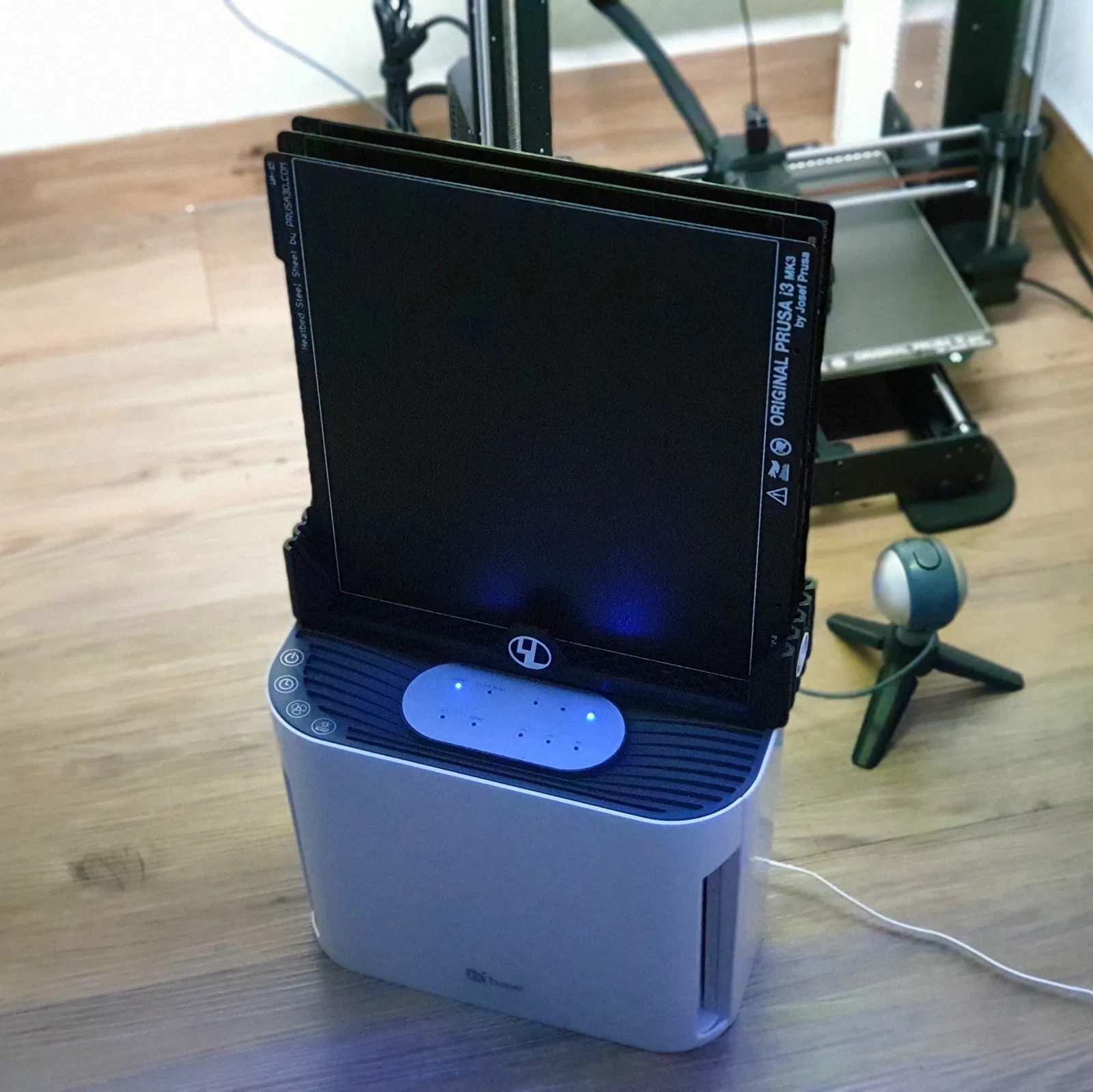 Từ khi có tấm phủ bột, tui phải kiếm chỗ để mấy tấm đó nên tui chế ra cái chỗ để tấm này. Có lỗ lục giác ở đáy để làm nguội tấm nhanh hơn. Chỗ để này có thể để được cả tấm PEI thường và tấm phủ bột.