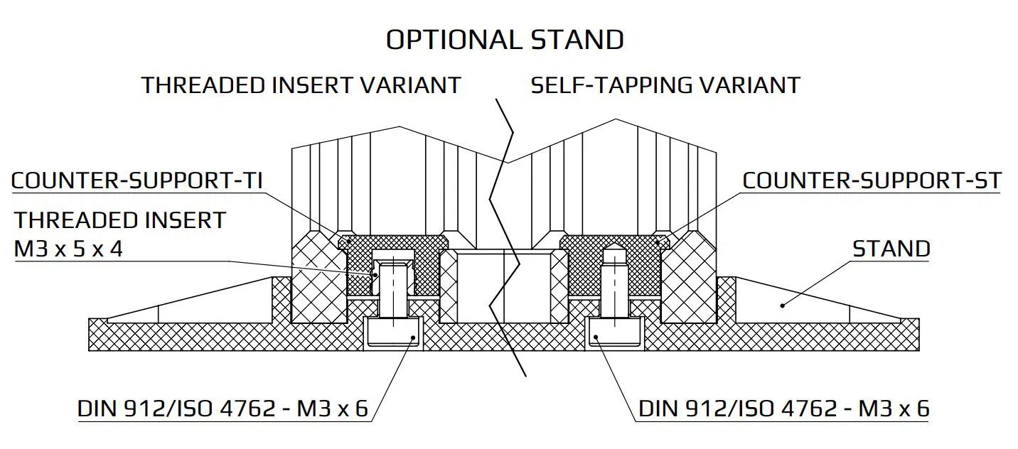4x DIN 912/ISO 4762 - M3 x 6 2x Bộ phận in - STAND.STL 4x Bộ phận in - COUNTER-SUPPORT-ST.STL 4x Miếng đệm cao su tự dính (tùy chọn) Lưu ý: Nên sử dụng mũi khoan ren M3.