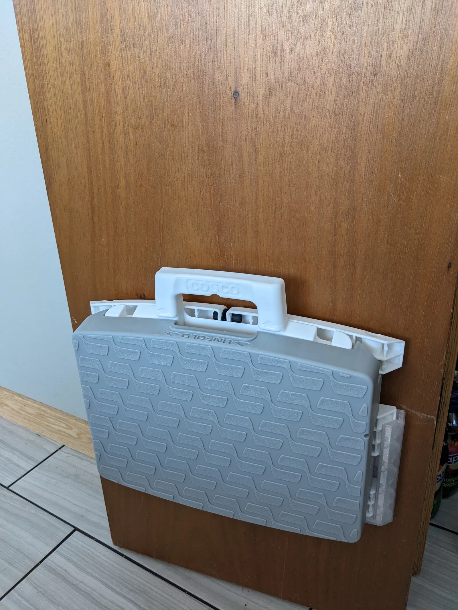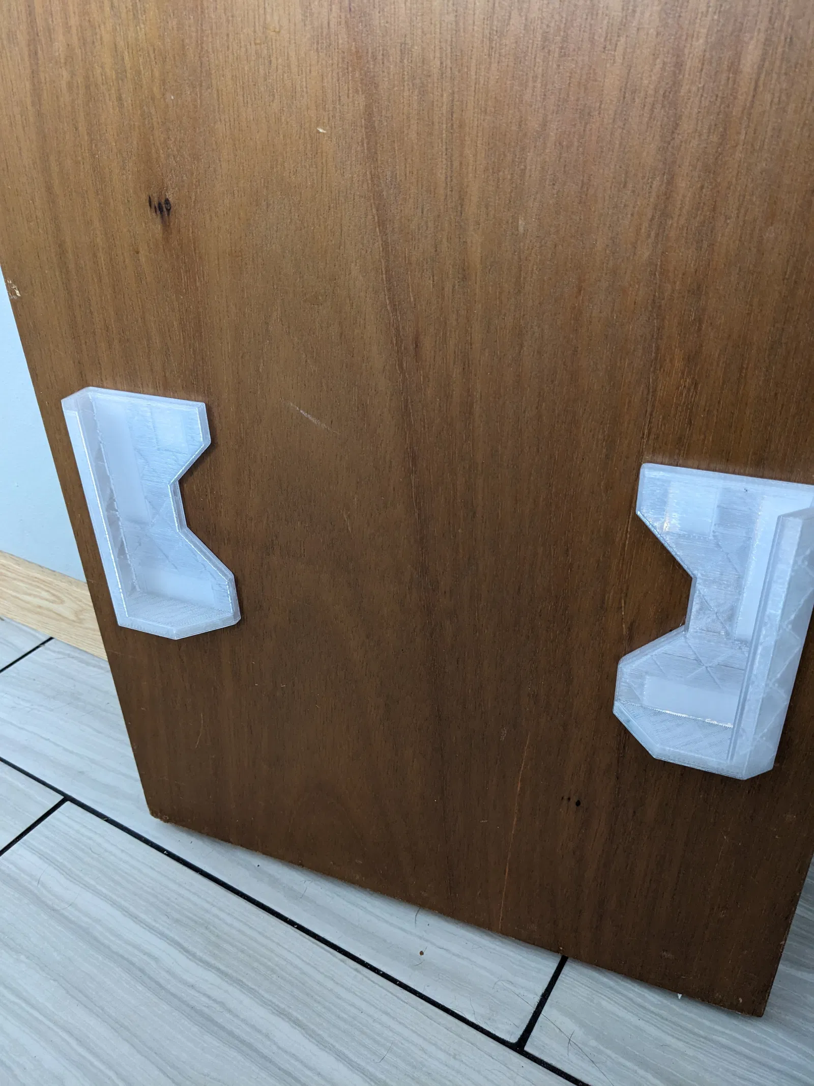 Giá đỡ dán mặt sau tủ hoặc cửa để cất bàn học. Sử dụng miếng dán Command velcro để dính vào mọi bề mặt. Không cần khoan lỗ. In bằng PETG trong suốt với vòi phun 0.8mm và chiều cao lớp 0.55mm.