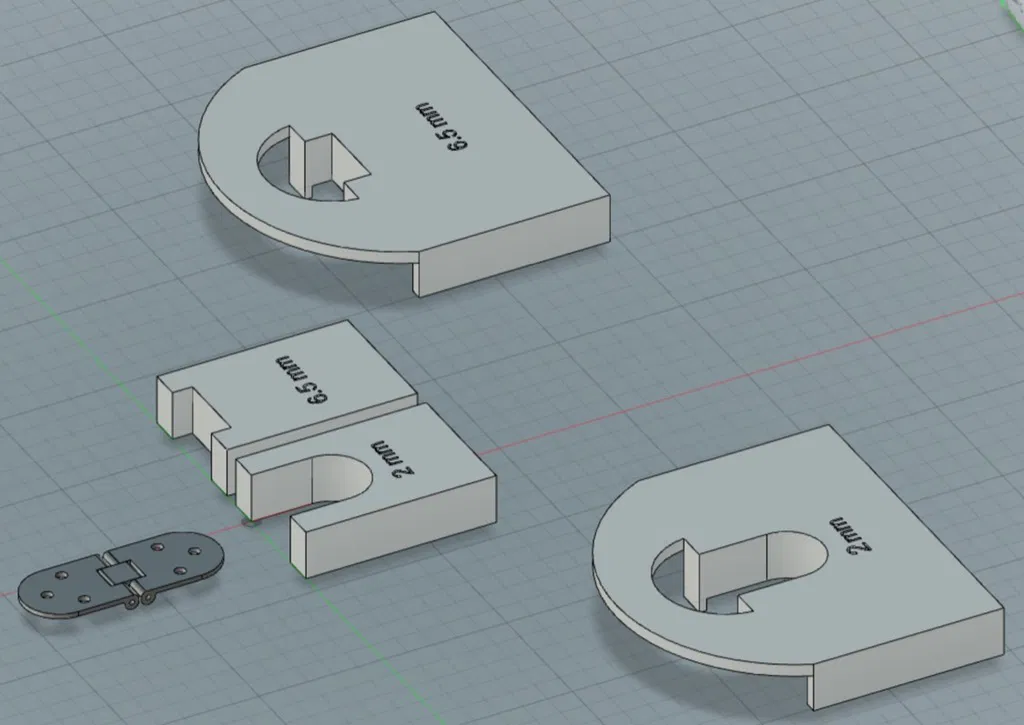 Bạn cần cả hai yếu tố của một trong hai phiên bản. Giữ chúng cố định trên bàn bằng băng dính hai mặt. Độ sâu cần thiết cho các mẫu bản lề của tôi là 2 và 6.5 và đó là lý do tại sao bạn tìm thấy các giá trị đó trên các mẫu. Điều này có thể khác đối với bản lề của bạn, vì vậy hãy đo đạc cẩn thận.