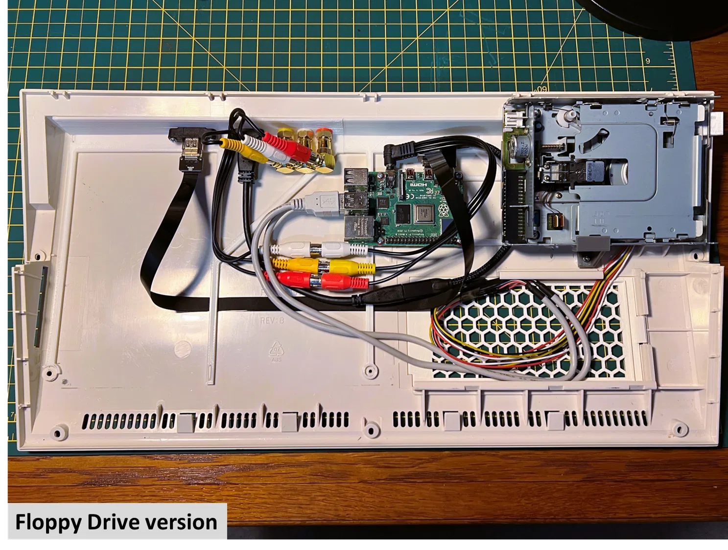 Các điểm gắn cho Pi đã được di chuyển sâu hơn vào giữa vỏ máy và Pi cần được xoay 180 độ so với vị trí trong ảnh gốc của mình để tạo không gian cho các kết nối video/âm thanh RCA.
