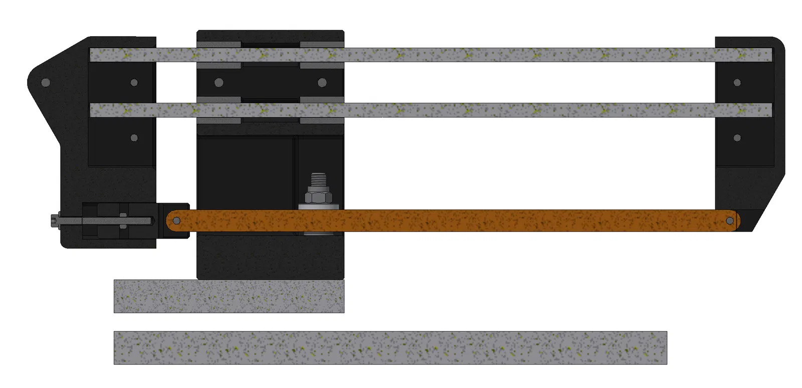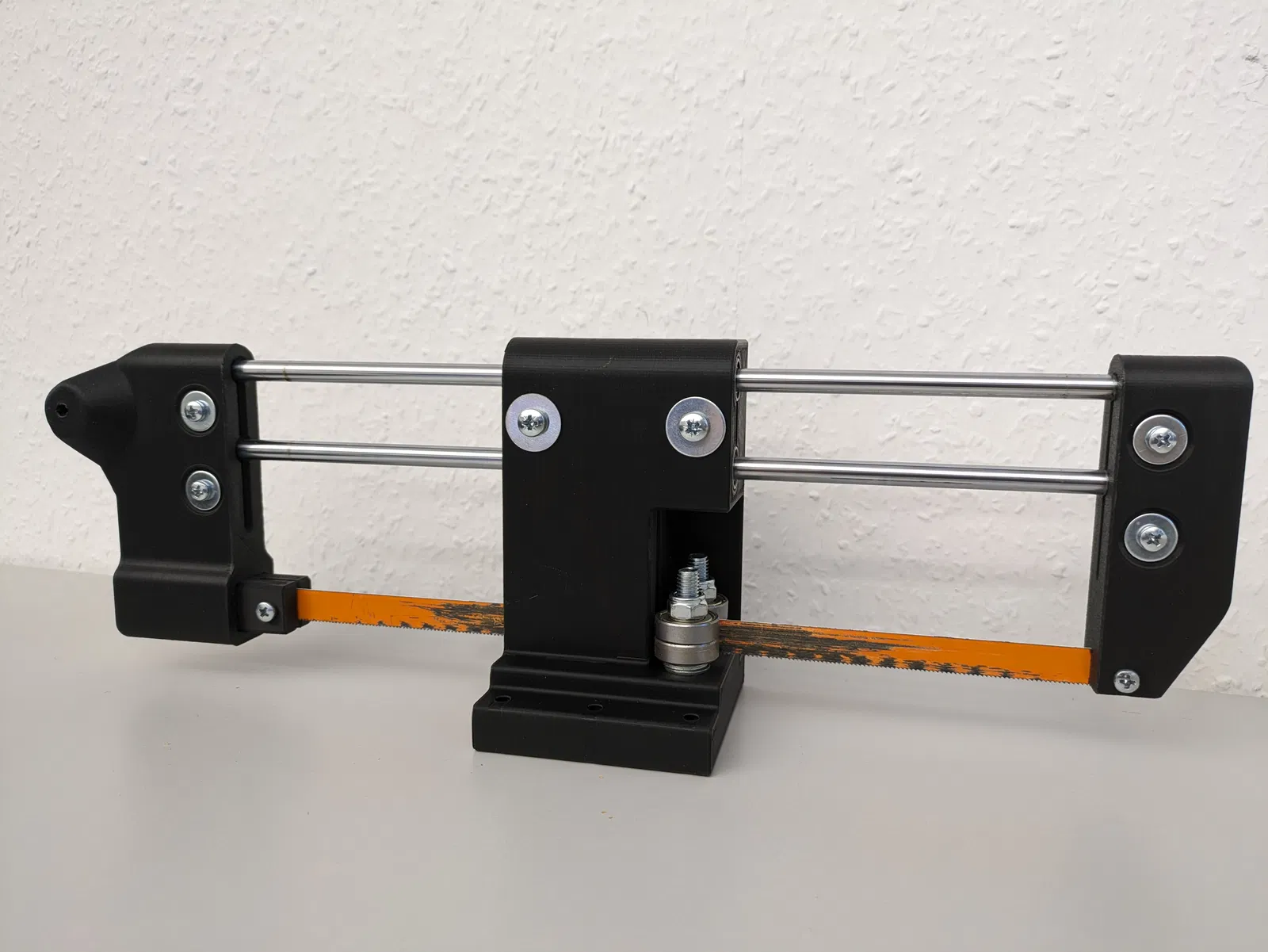 Phiên bản tùy chỉnh của cưa sắt máy 'Power Hack Saw' dựa trên mẫu của Tomlie_Xie. Sử dụng động cơ FC-555 12V, ổ bi LM8UU, 608, 625, bản lề kim khí, mỏ kẹp Röhm 80mm và rơ le 12V để tự động ngắt.