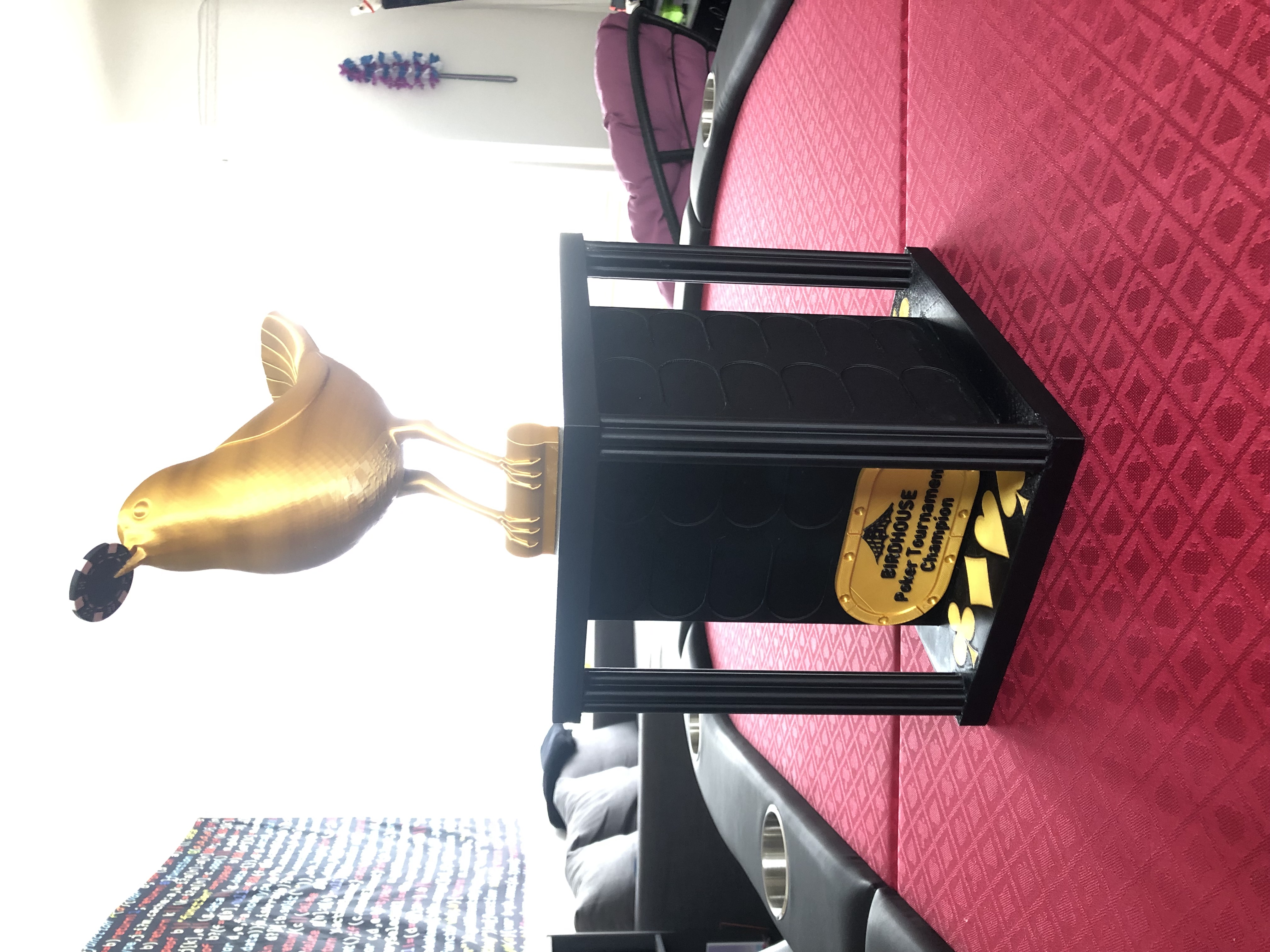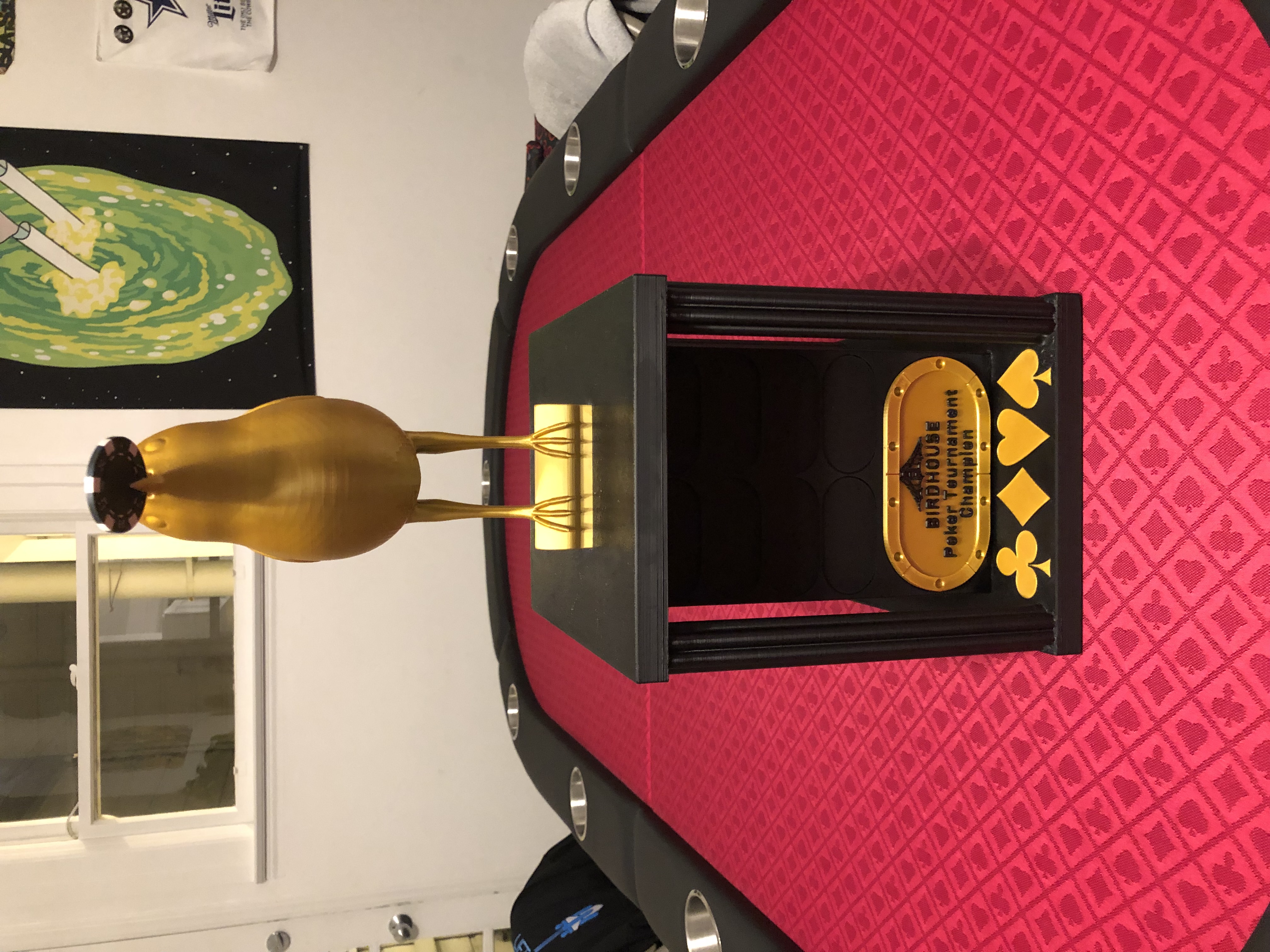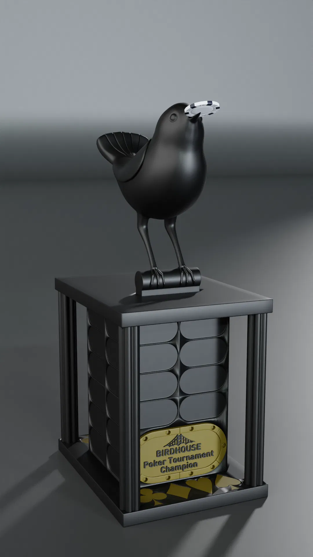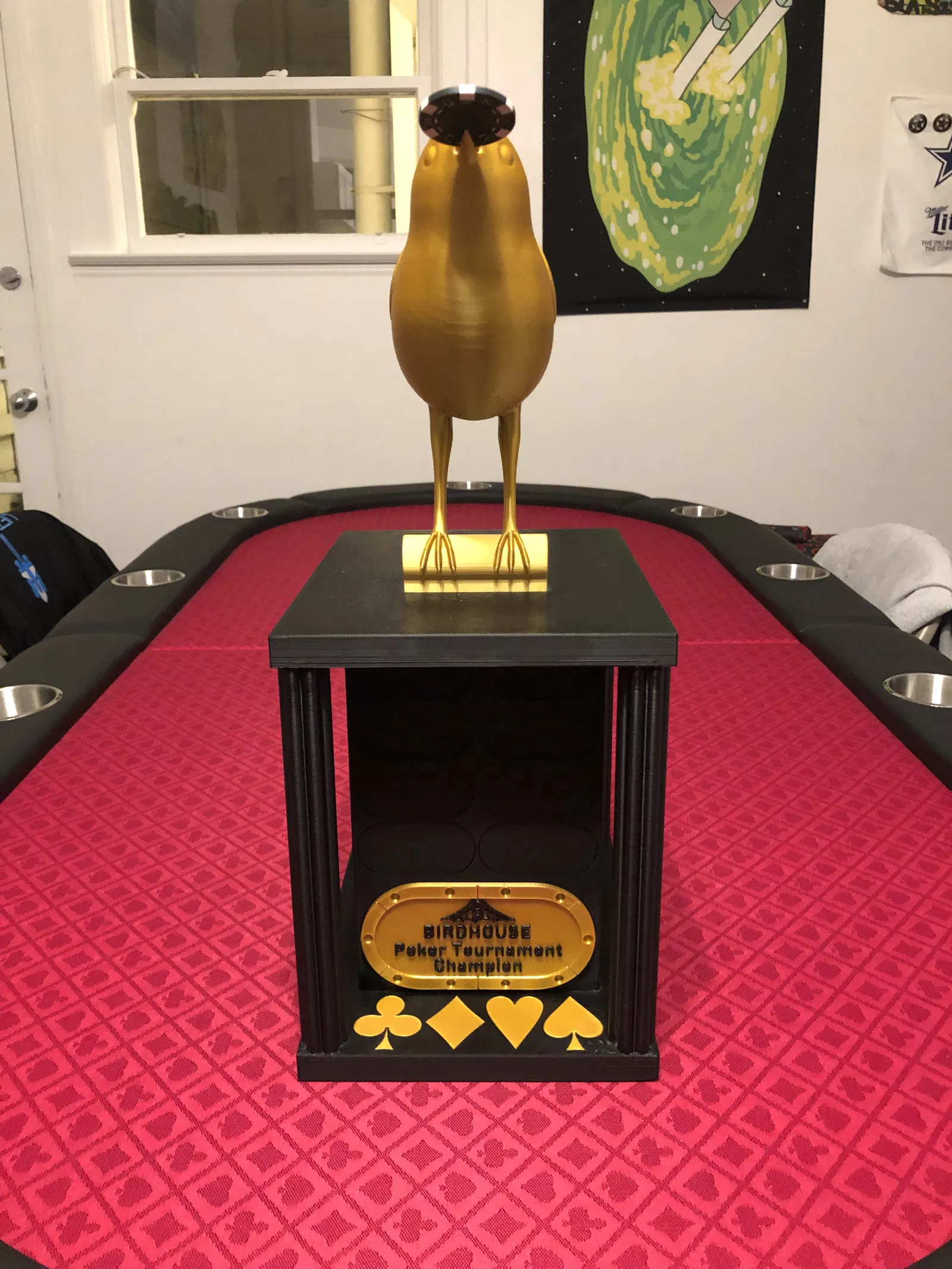 Chiếc cúp Poker này có thể vinh danh 44 người chiến thắng, với kích thước 7.75" x 10" x 19". Bạn có thể tùy chỉnh bảng tên và logo. Hướng dẫn in chi tiết các bộ phận, vật liệu và cài đặt, cùng lưu ý khi in phần chim.