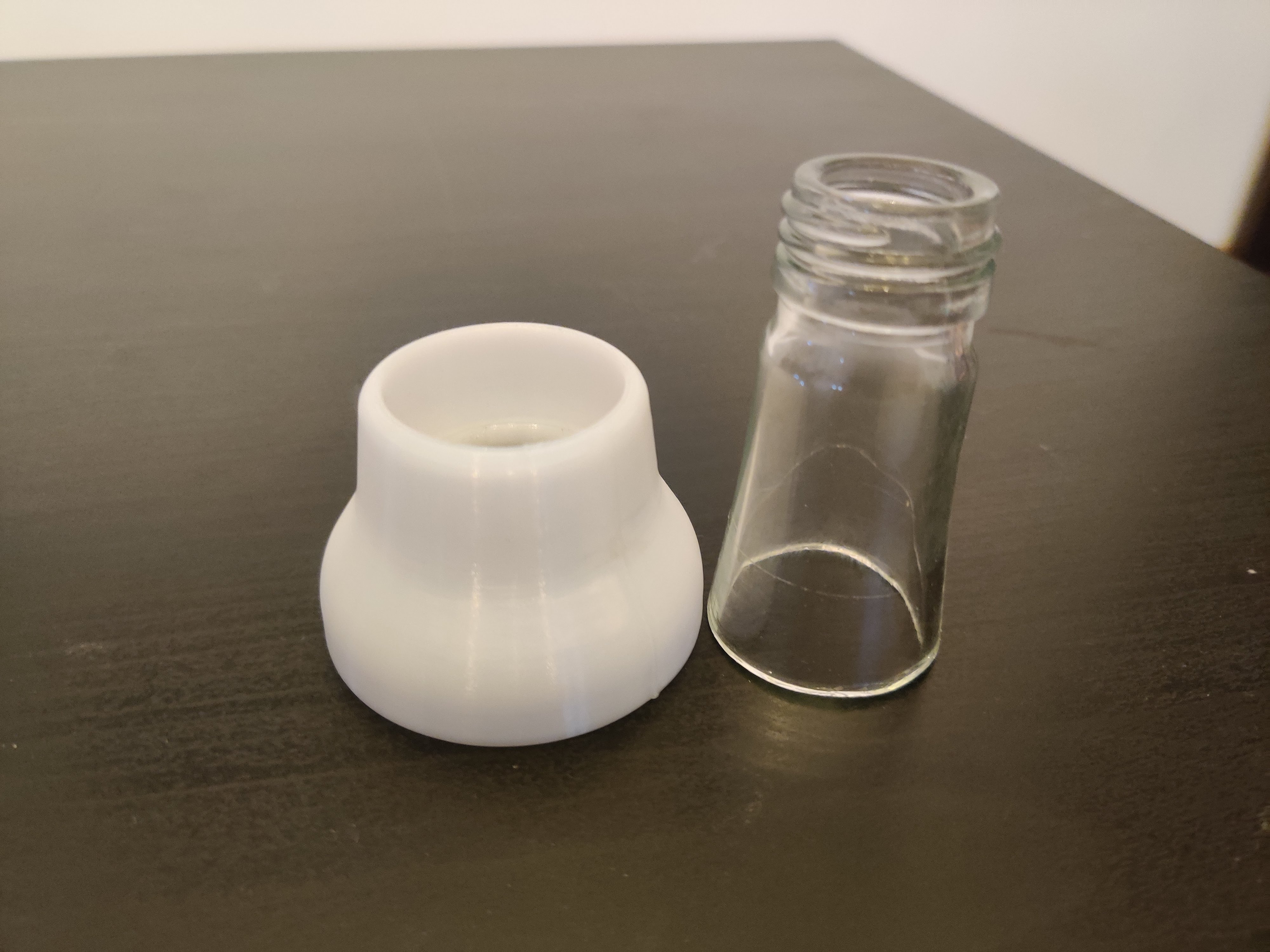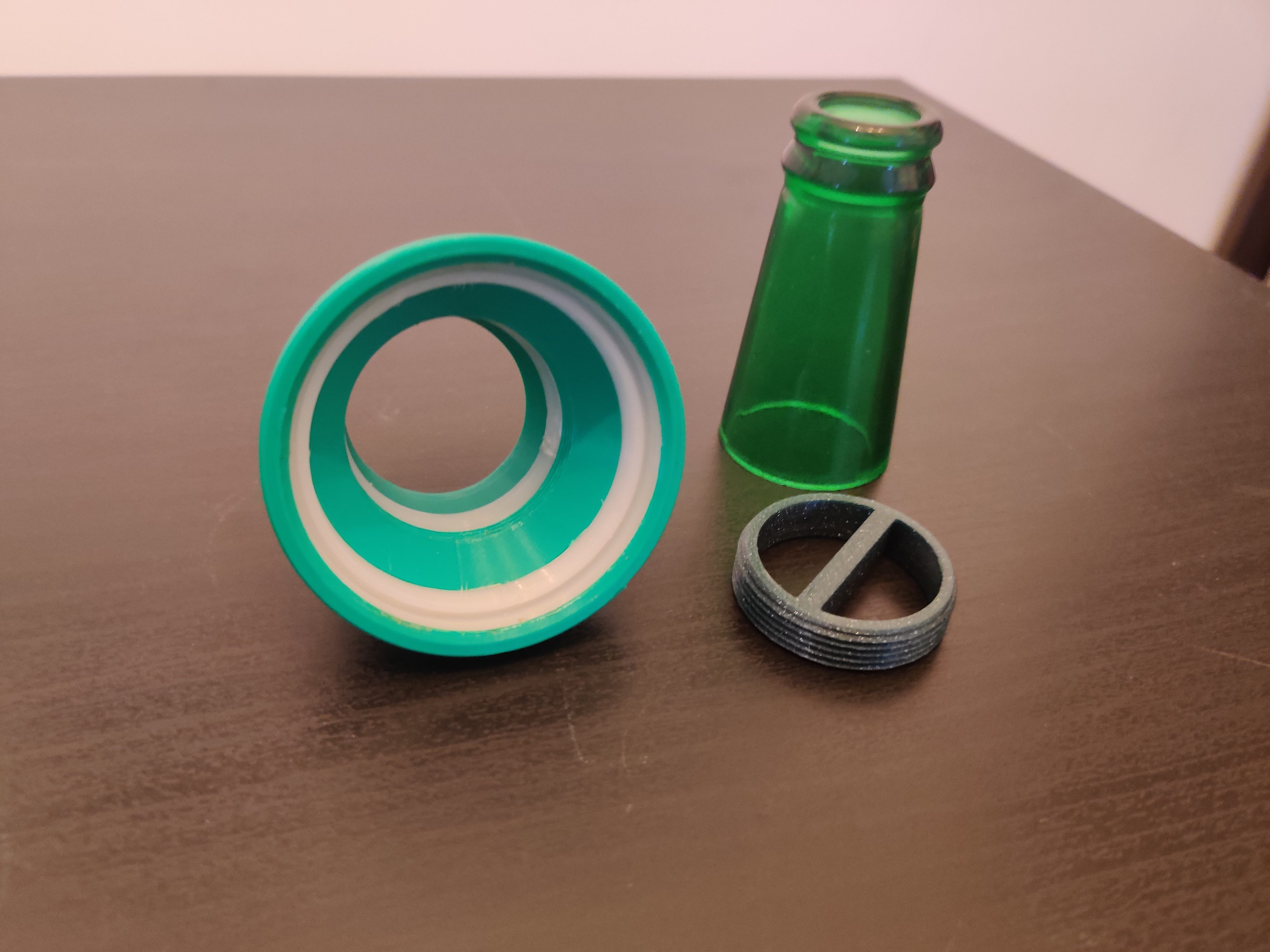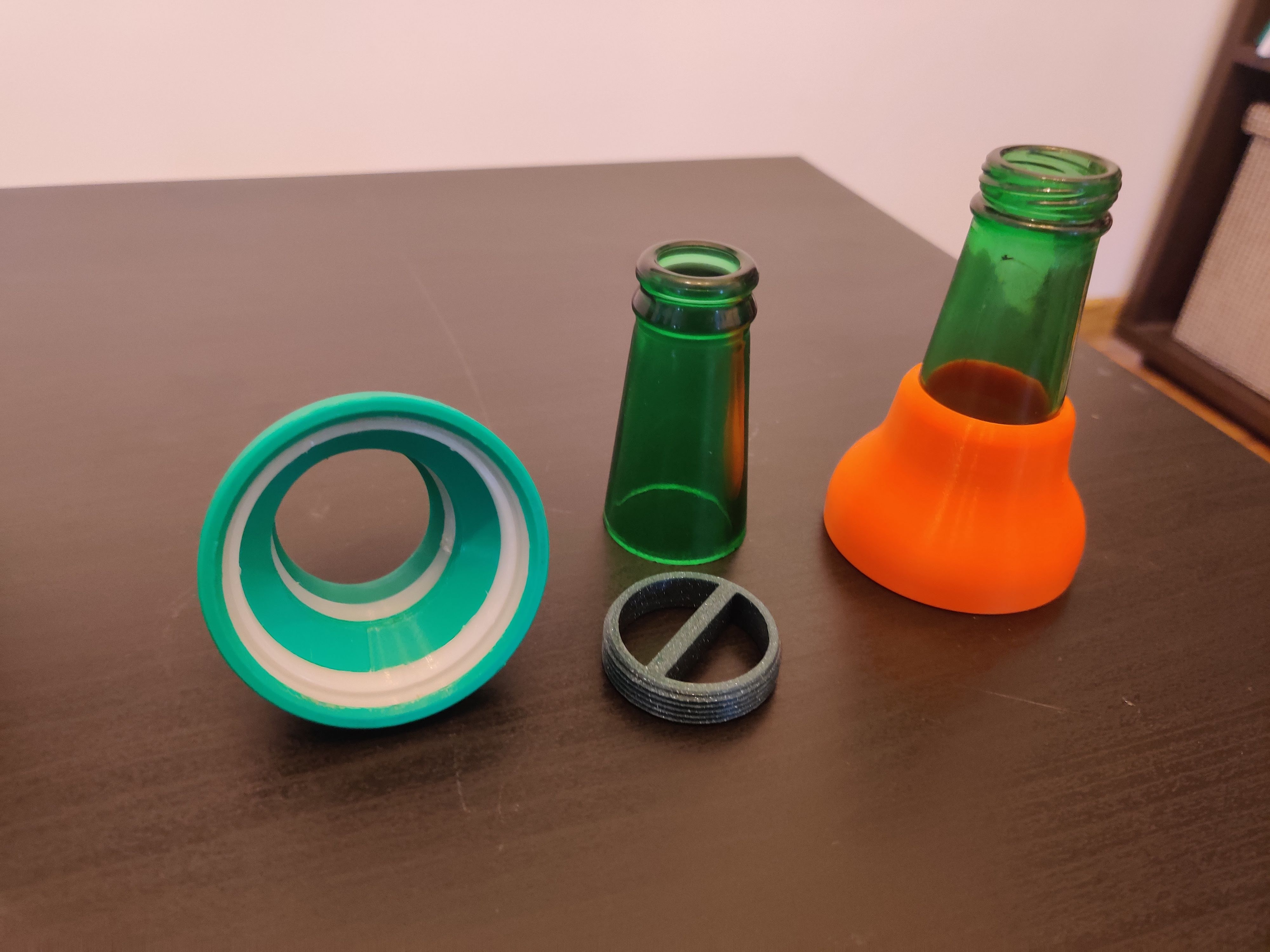 Đối với những ai không muốn cắt chai thủy tinh, tôi đã tạo một mẫu tương tự như phần cổ chai và có thể in từ bất kỳ loại vật liệu cứng nào có thể dùng trong thực phẩm (tôi đã làm nó từ PLA).