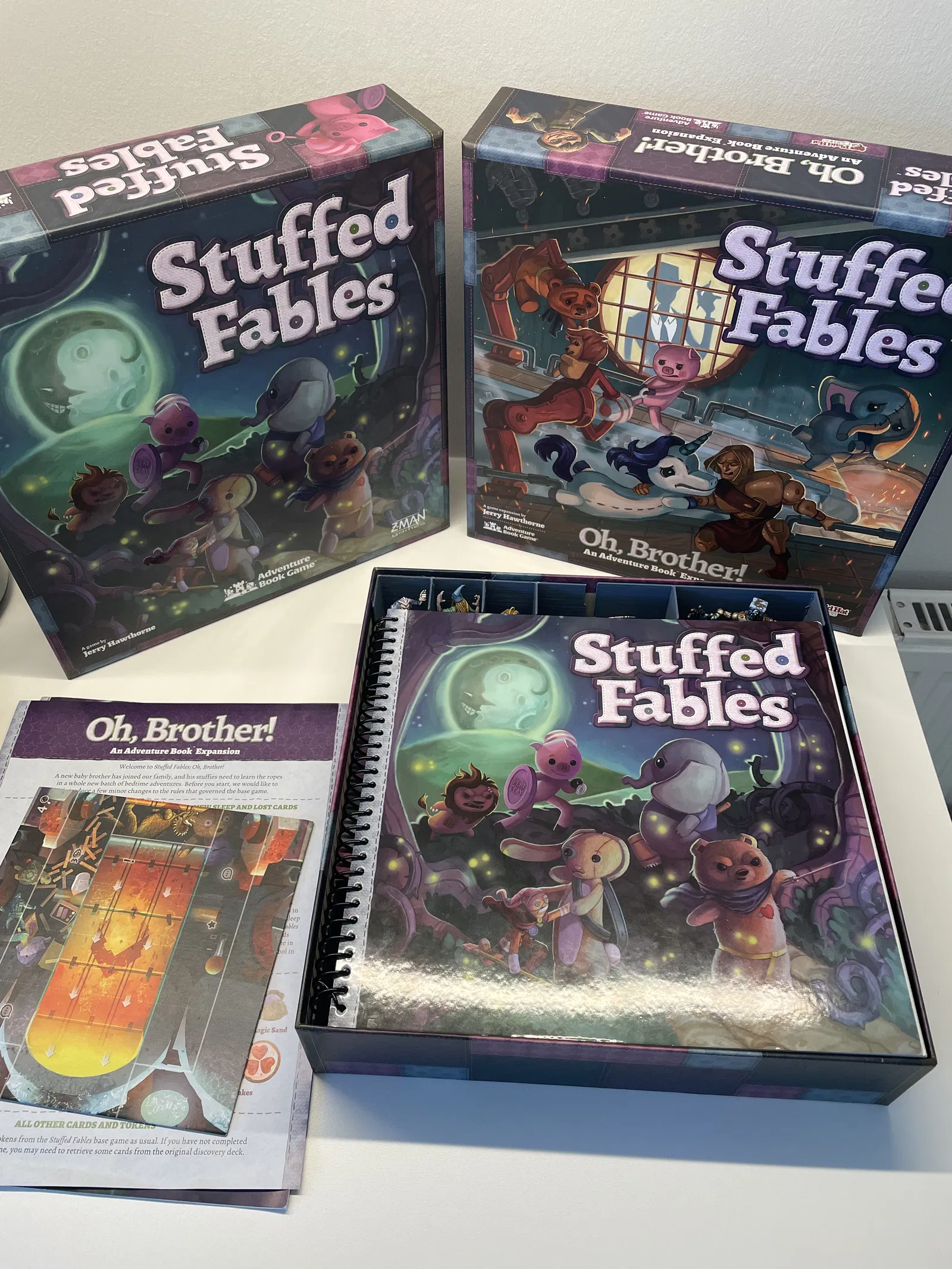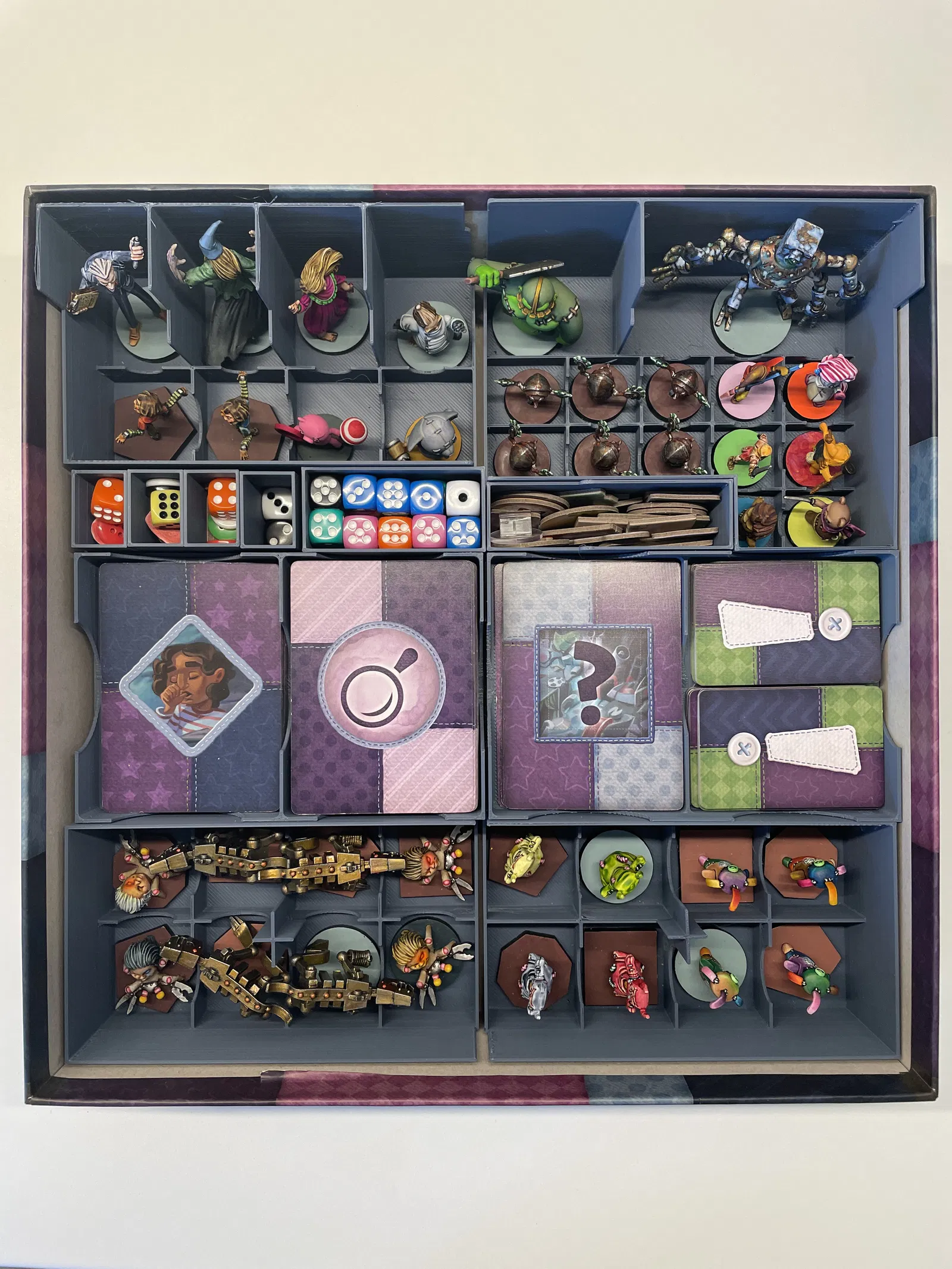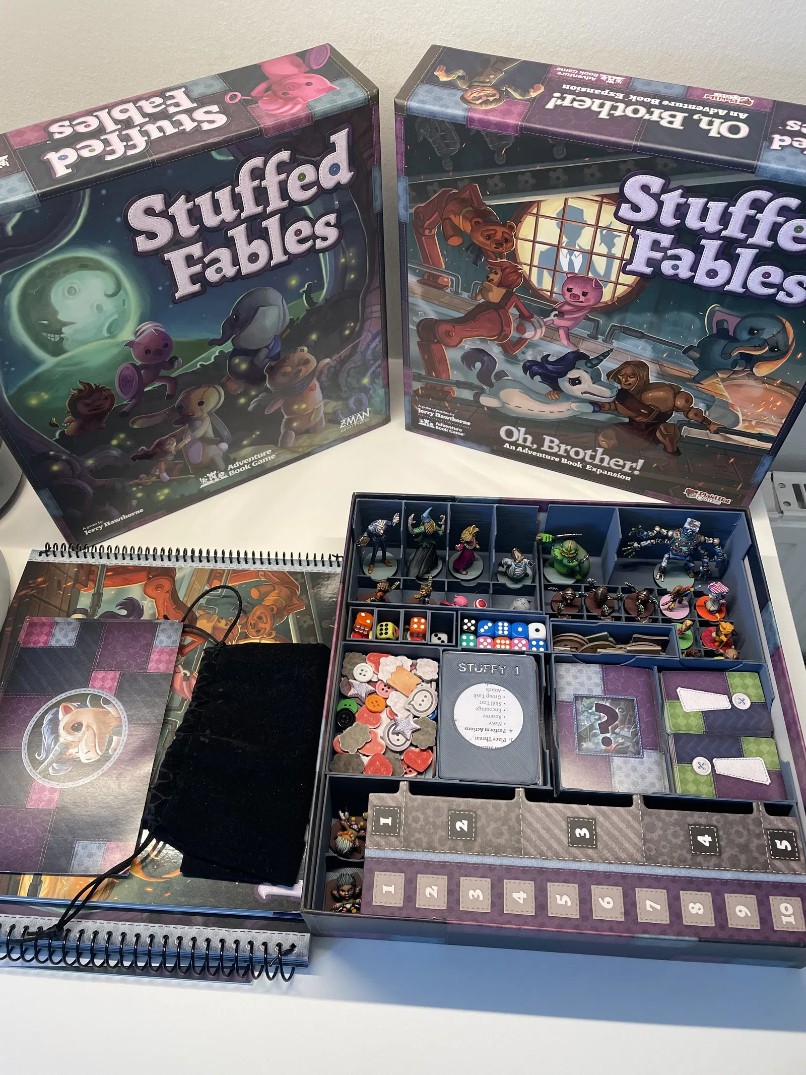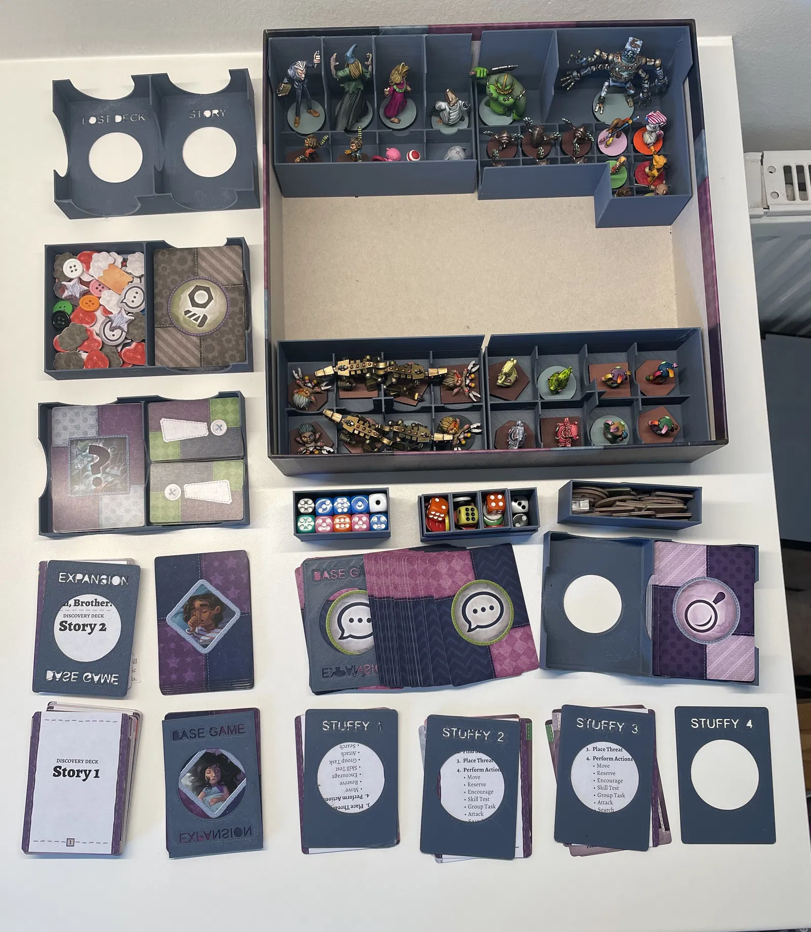 Con tôi và tôi thích chơi Stuffed Fables (và giờ có cả bản mở rộng Oh, Brother nữa). Tôi cũng thích sơn mấy con mini. Vấn đề là game setup với cất vào rất phiền phức, cộng thêm mấy con mini đã sơn xong bị va đập lung tung trong cái hộp độn lót tệ hại của mấy hộp gốc. Đây là phiên bản hộp độn lót theo module của tôi cho game Stuffed Fables và bản mở rộng Oh, Brother - mọi thứ đều nằm gọn trong một hộp. Tất cả các bộ phận đều tương thích với khay dựng 220 x 220. Để trải nghiệm trọn vẹn, hãy in 1 bộ mỗi loại. CẬP NHẬT 14/10/2023: STL hiện đã có cho từng thành phần. Xin cảm ơn @TabithaFlatt_1300091 rất nhiều vì đã tạo và chia sẻ các file STL để đăng tải tại đây. Tất cả các miniatures đều có thể đứng thẳng. Có đủ khoảng trống cho sách và luật chơi nằm trên bộ đồ độn lót mà không chạm vào các con mini. LƯU Ý: Khi đóng gói sách game - hãy cho sách mở rộng vào trước để phần gáy xoắn của sách gốc có đủ khoảng trống cho nắp hộp đóng lại hoàn toàn. Bạn có thể gắn nam châm vào mấy con mini - chỉ cần vài cái vòng đệm và keo 2 thành phần là đủ để nâng cấp. Hãy chú ý khoảng trống với mấy con mini, đặc biệt là Crepitus, Manny và Compliance Officer. Hộp riêng cho đồ mang theo, tim, cúc áo, xúc xắc. Các thẻ bài mang theo đặt dưới các bộ chia thẻ bài tương ứng. Hộp đựng thẻ bài cần được đặt theo cách riêng để mấy tấm thẻ người chơi lớn có khoảng trống phù hợp. Hộp thẻ bài được đánh số 1, 2, 3: + hộp 1 sẽ chồng lên hộp 1 khác,