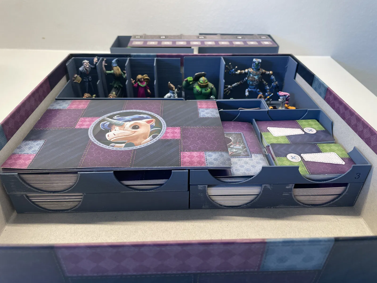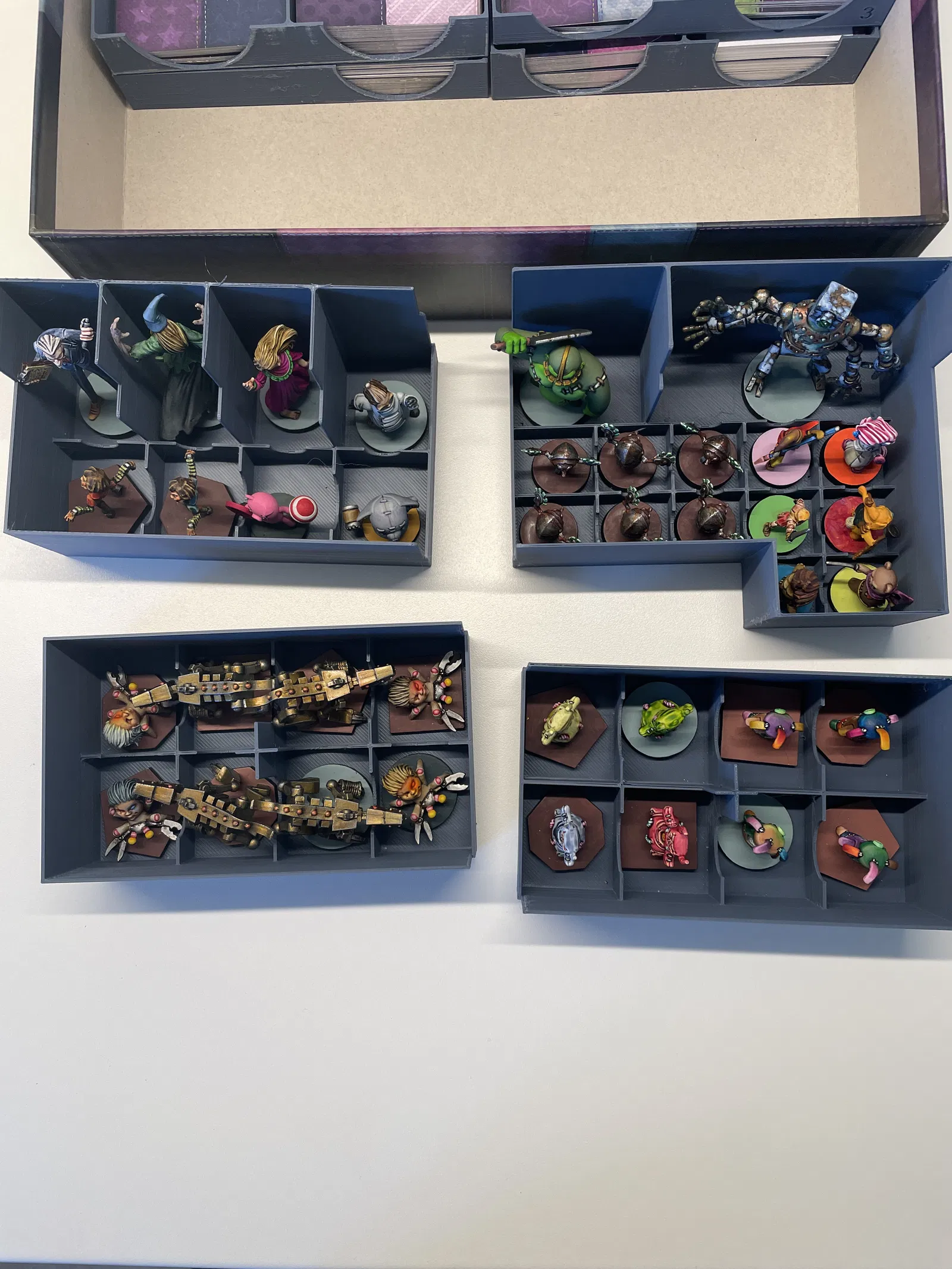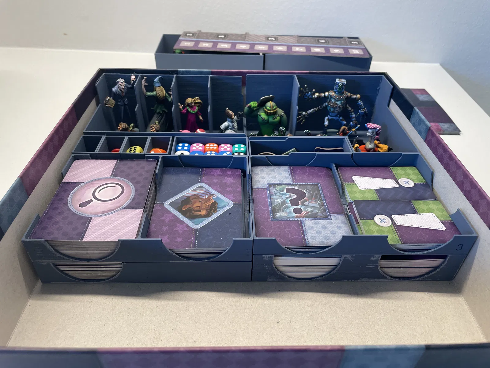 - Thẻ bài người chơi lớn đặt trên chồng hộp 1, và che phần thấp của hộp 3. Phần cao của hộp 3 nên bằng với mấy hộp miniature bên cạnh - xem 2 ảnh cuối để tham khảo. In bằng PLA, lớp dày 0.2, không cần hỗ trợ, có skirt. LƯU Ý: vâng, tất cả các bộ phận đều nằm trong 1 file 3mf duy nhất - sẽ làm file riêng cho từng đối tượng khi tôi biết cách làm.