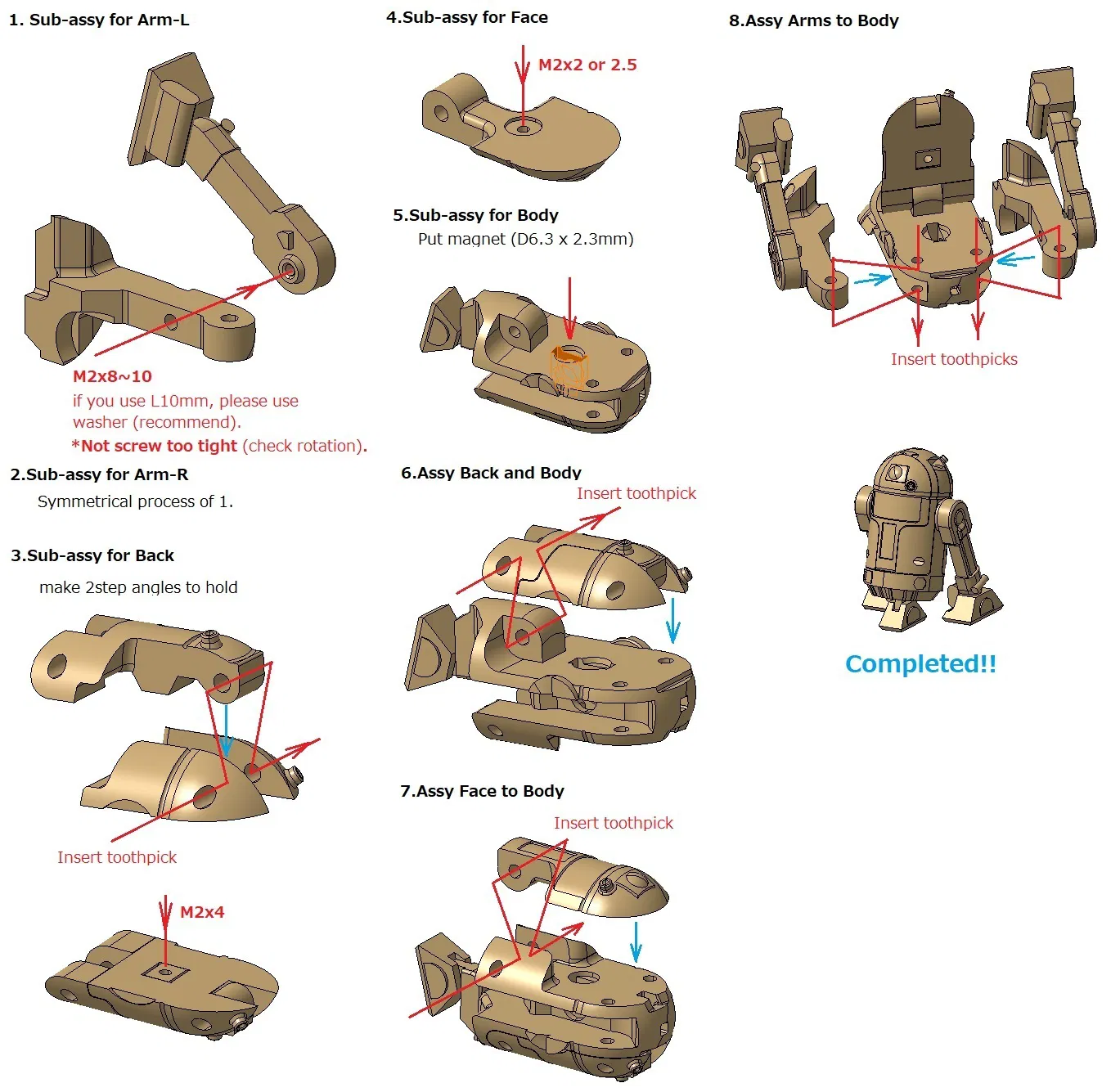 Để hoàn thiện sản phẩm, bạn cần tăm, ốc vít và nam châm để giữ cho đế đóng lại. Ốc vít: M2x2.5, M2x4, M2x10 (2 cái), vòng đệm Tuy nhiên, khoảng hở cài đặt khá nhỏ, nên bạn có thể không cần dùng nam châm.