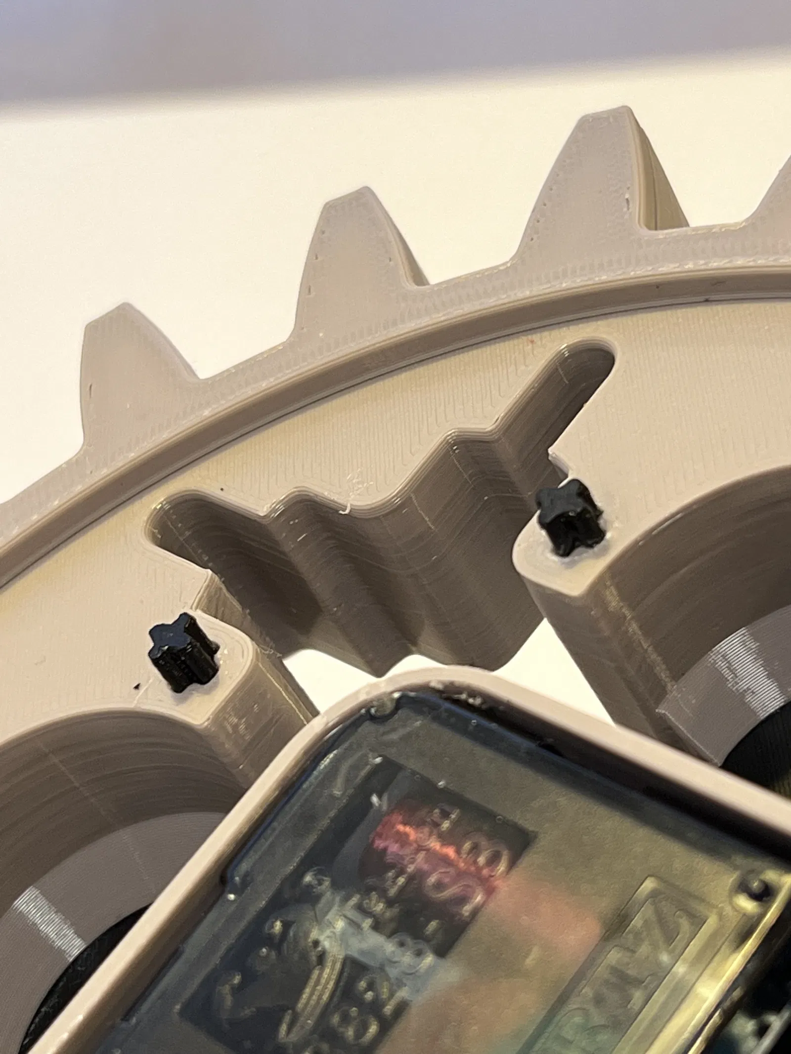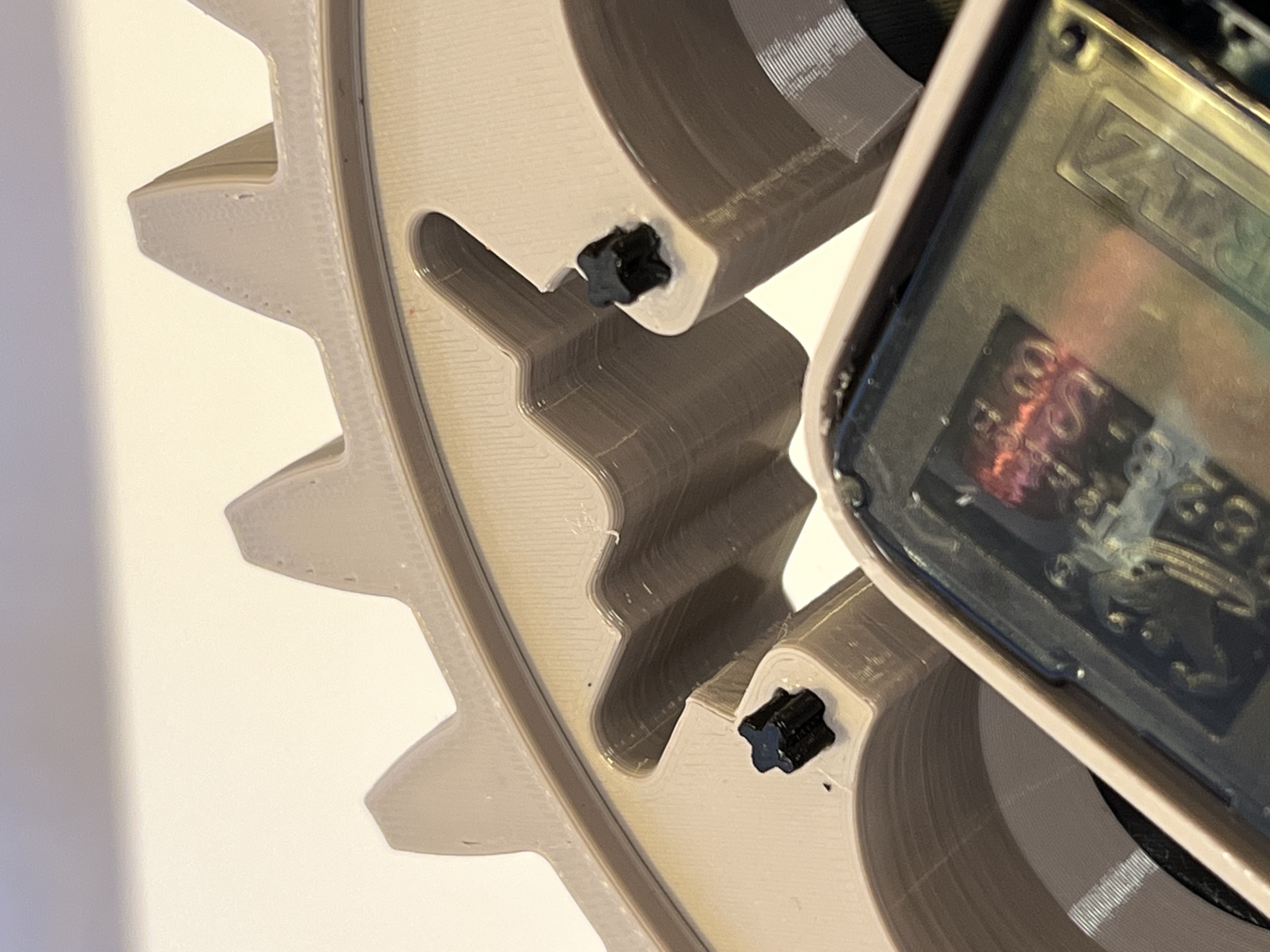 Đầu tiên tôi xoay bánh răng, để 4 lỗ trở thành vị trí hoàn hảo cho các số. Nó bất ngờ trông giống như mặt đồng hồ phổ biến trên Apple Watch. Chúng được in bằng cách thay đổi filament giữa chừng. Tôi đã thử một số loại PLA phát quang, nhưng cuối cùng tôi đã quay về với sự kết hợp đen trắng cổ điển.
