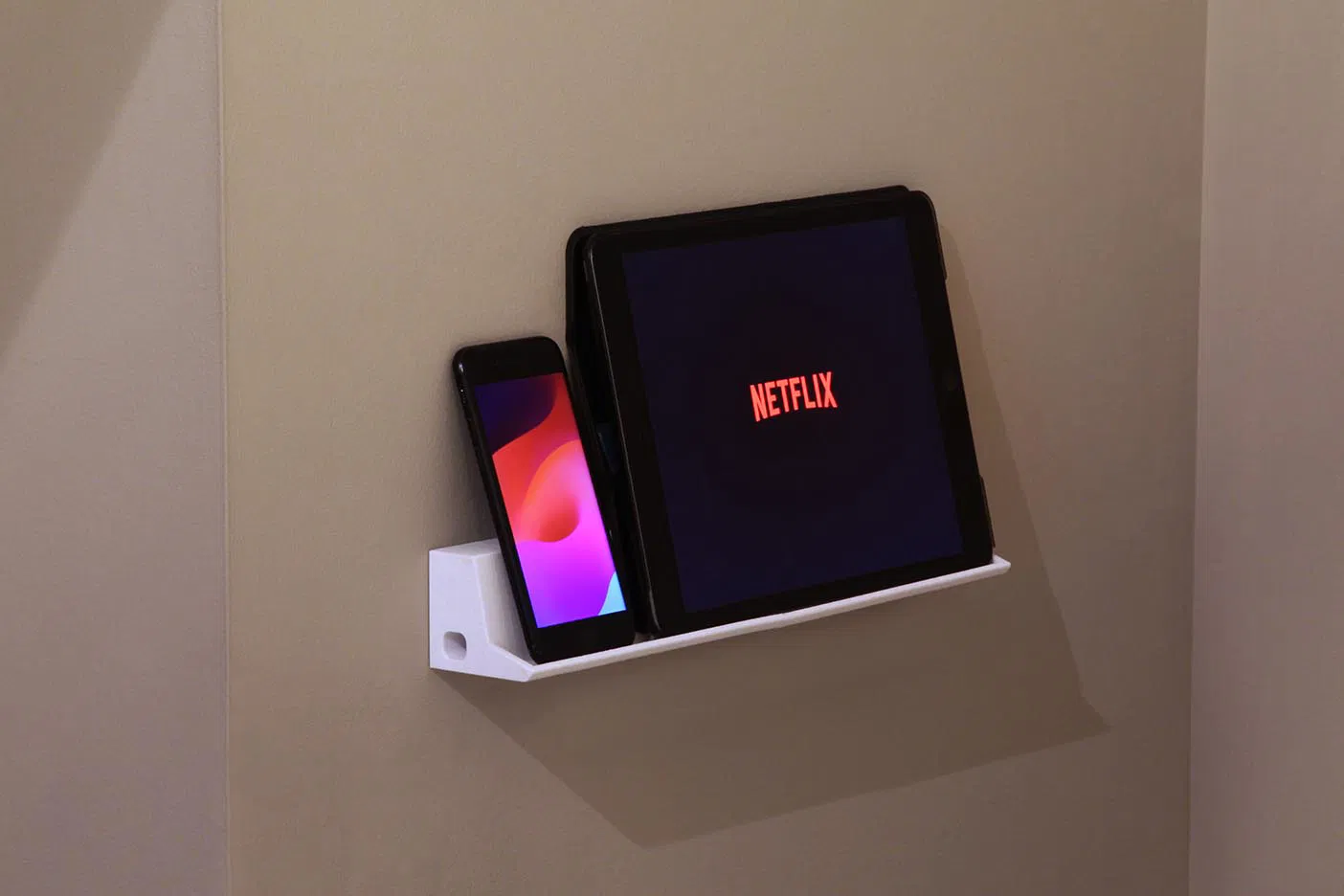 Giá treo tường cho điện thoại và máy tính bảng. Bao gồm lỗ sạc và kênh bên trong để sắp xếp dây cáp gọn gàng, giúp không gian của bạn thêm phần ngăn nắp.