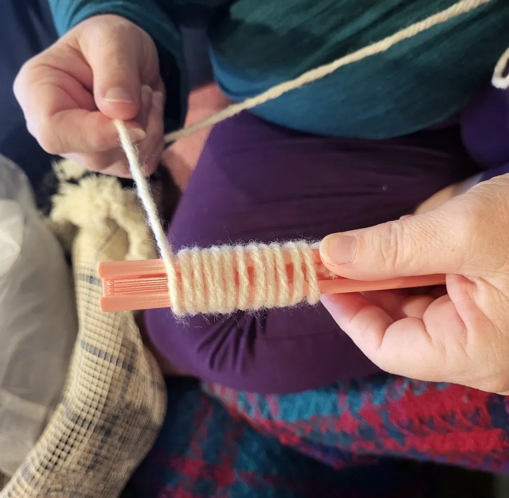 Cái dụng cụ cầm tay đơn giản này giúp bạn cắt nhanh các sợi chỉ dài 2.5 inch để làm thảm móc khóa. Bạn quấn chỉ quanh dụng cụ, thỉnh thoảng đẩy chỗ quấn xuống về phía chặn cuối. Khi đã quấn đủ, bạn dùng kéo cắt chỉ.
