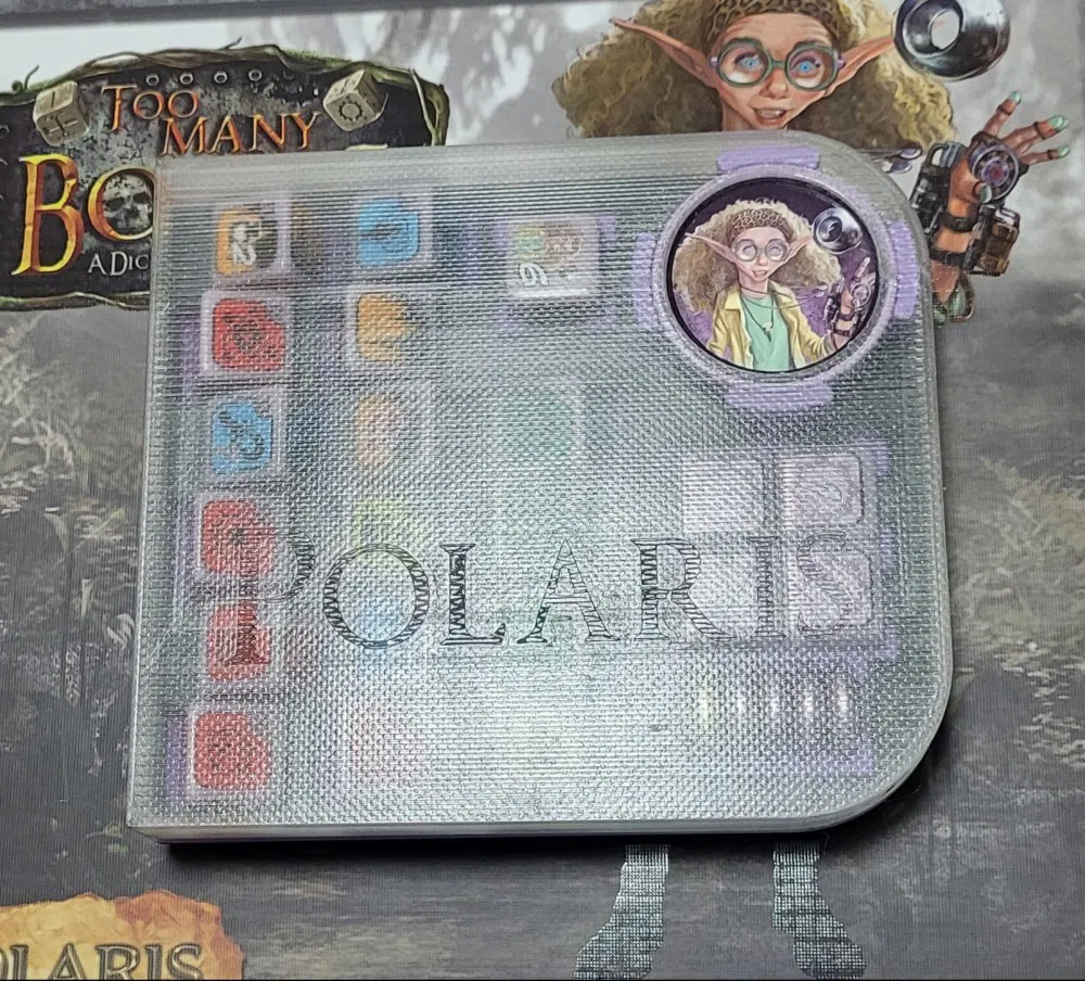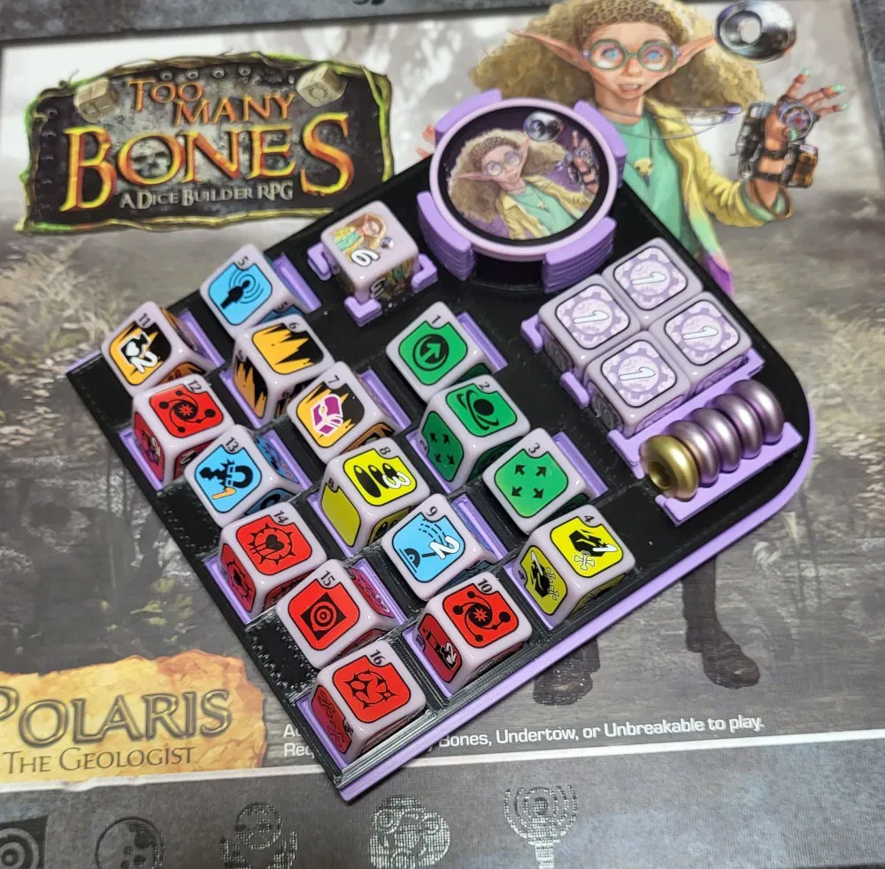 Khay đựng xúc xắc và chip cho Gearloc Polaris từ board game Too Many Bones. Phiên bản mới có khe chứa 5 quả cầu đi kèm Polaris. Có nắp trượt riêng. Được thiết kế bằng Fusion 360, xuất STL, MeshMixer. Logo "Too Many Bones" mặt dưới in bằng SVG.
