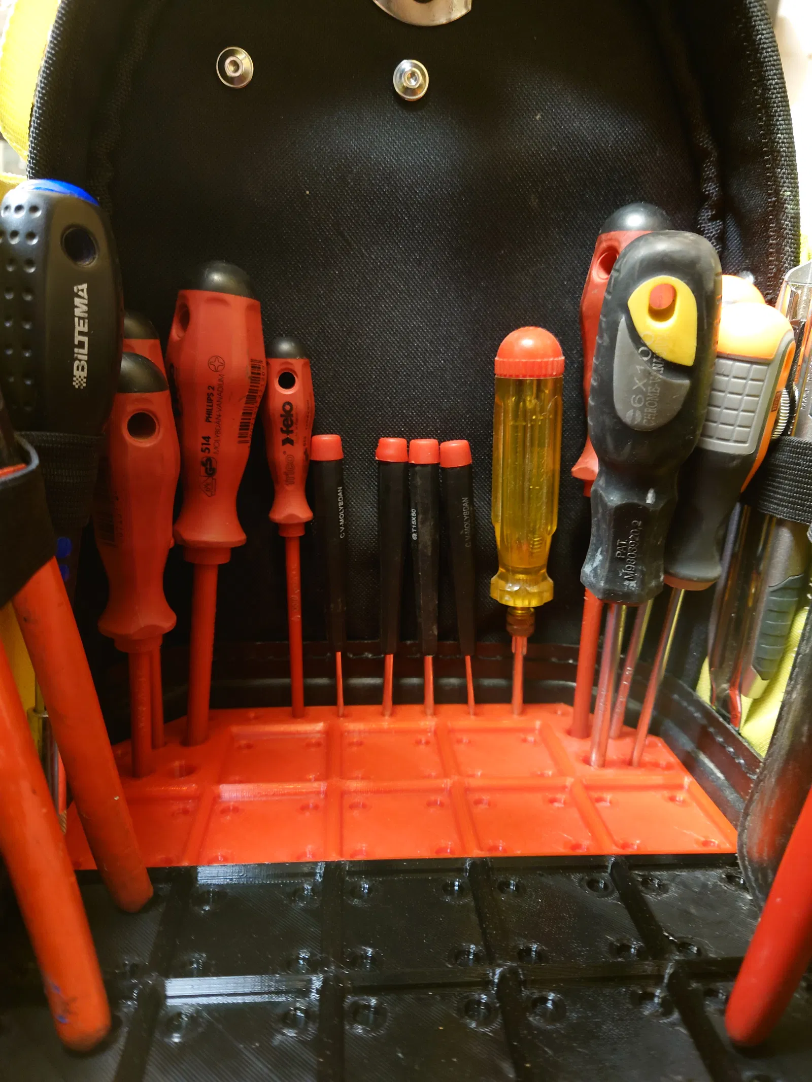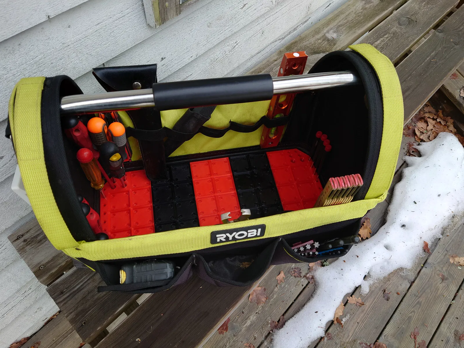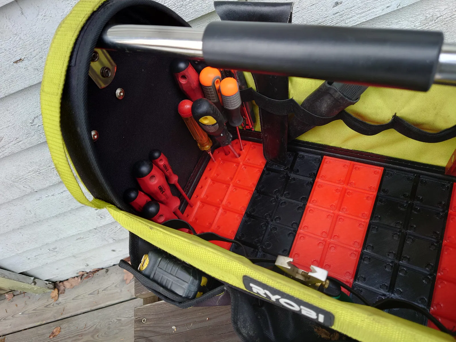 Biến túi đồ nghề Ryobi RSSLOT2J thành mâm Gridfinity! Sắp xếp ốc, vít, đồ nghề gọn gàng, không còn lộn xộn. Dễ in, không cần keo. Thích hợp cho mọi người hay làm việc ngoài trời.