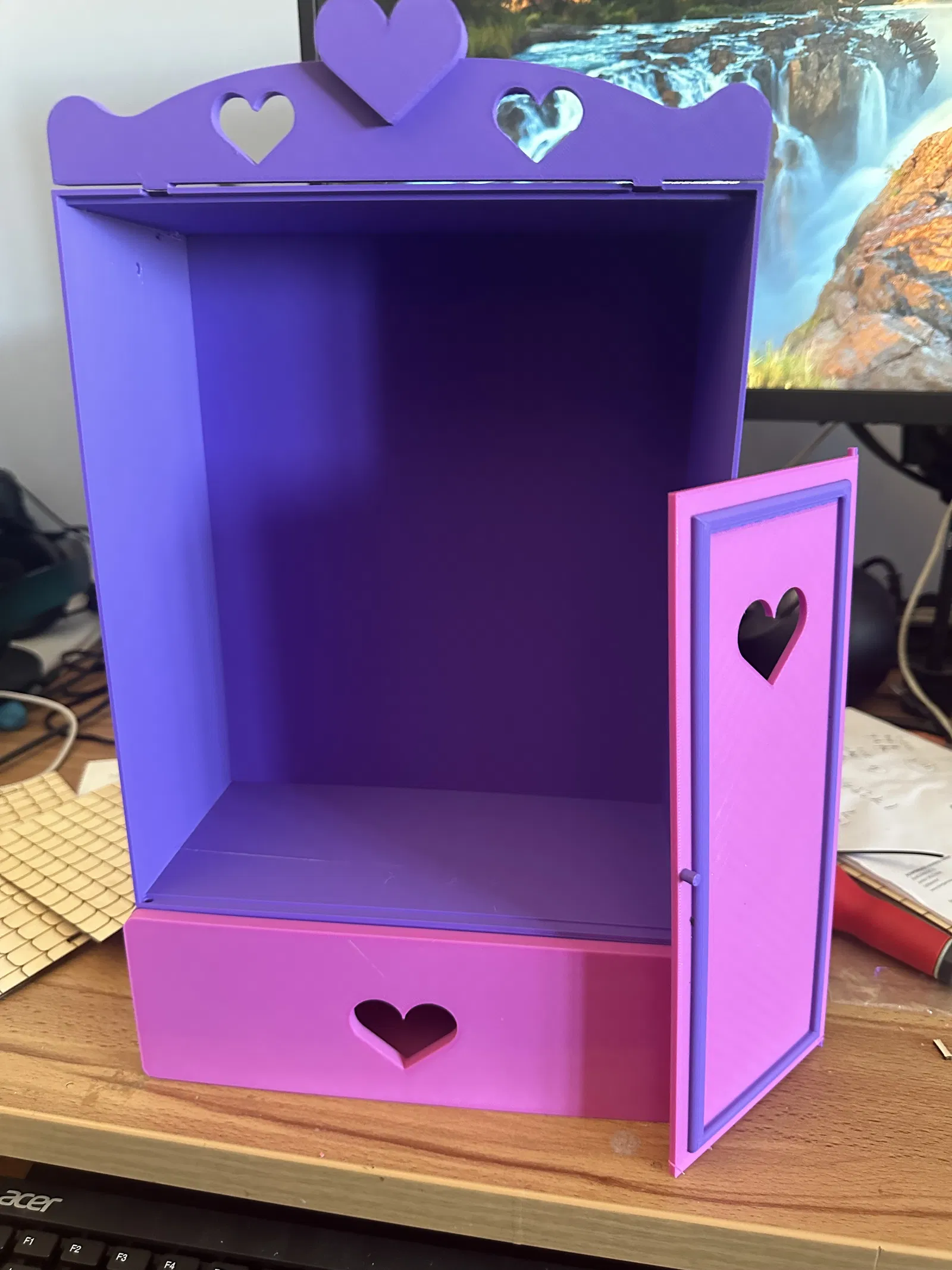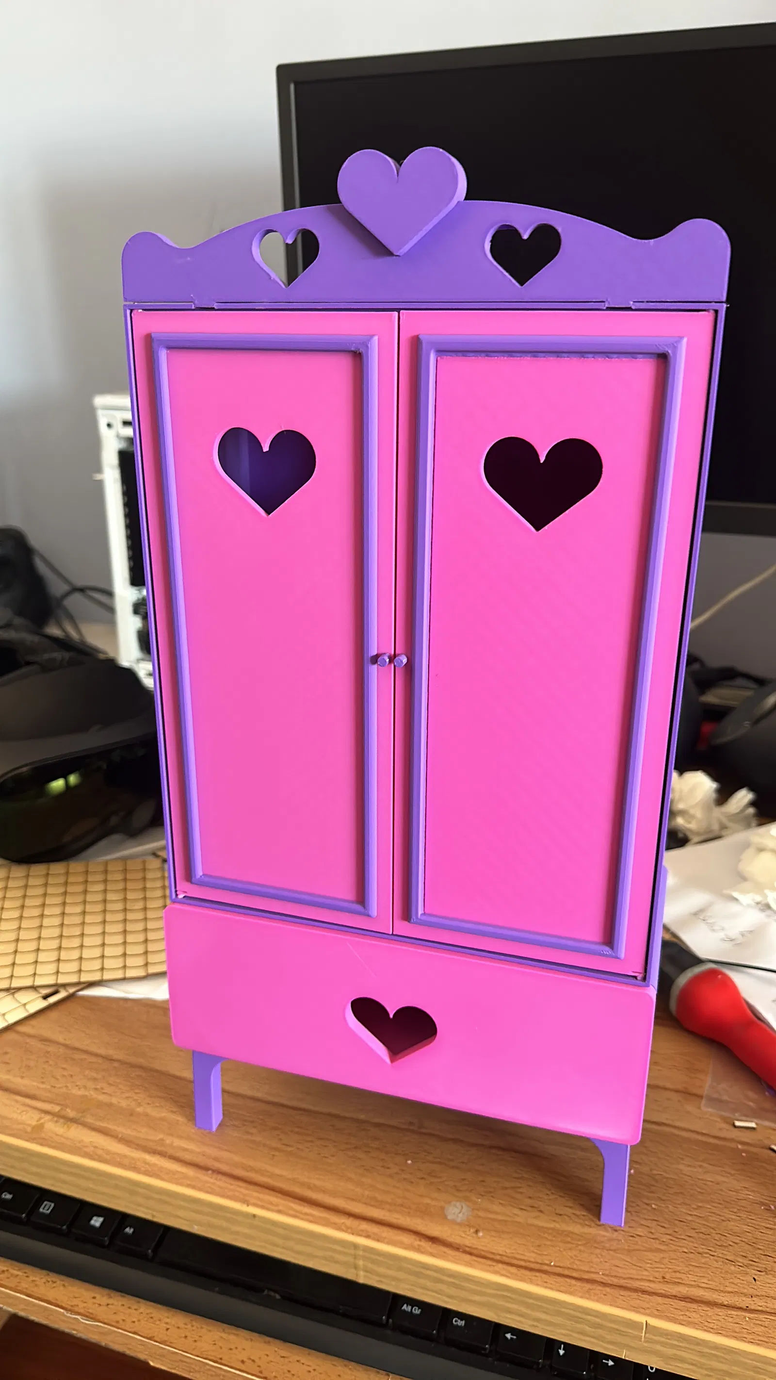 Búp bê Barbie của con gái cưng của bạn vừa đi mua sắm mà lại không có chỗ cất giữ quần áo ư? Chiếc tủ quần áo này sẽ giải quyết vấn đề đó. In bằng PLA, dùng 15% infill và các cài đặt tiêu chuẩn của Bambu Studio. Không cần AMS để in nhiều màu. Dùng que xiên để làm thanh treo đồ bên trong tủ. Các bộ phận cần dán lại với nhau. Cần cắt gọt và chà nhám nhẹ các chốt cửa để lắp vừa, đừng cố lắp khi chưa chà nhám nhé.