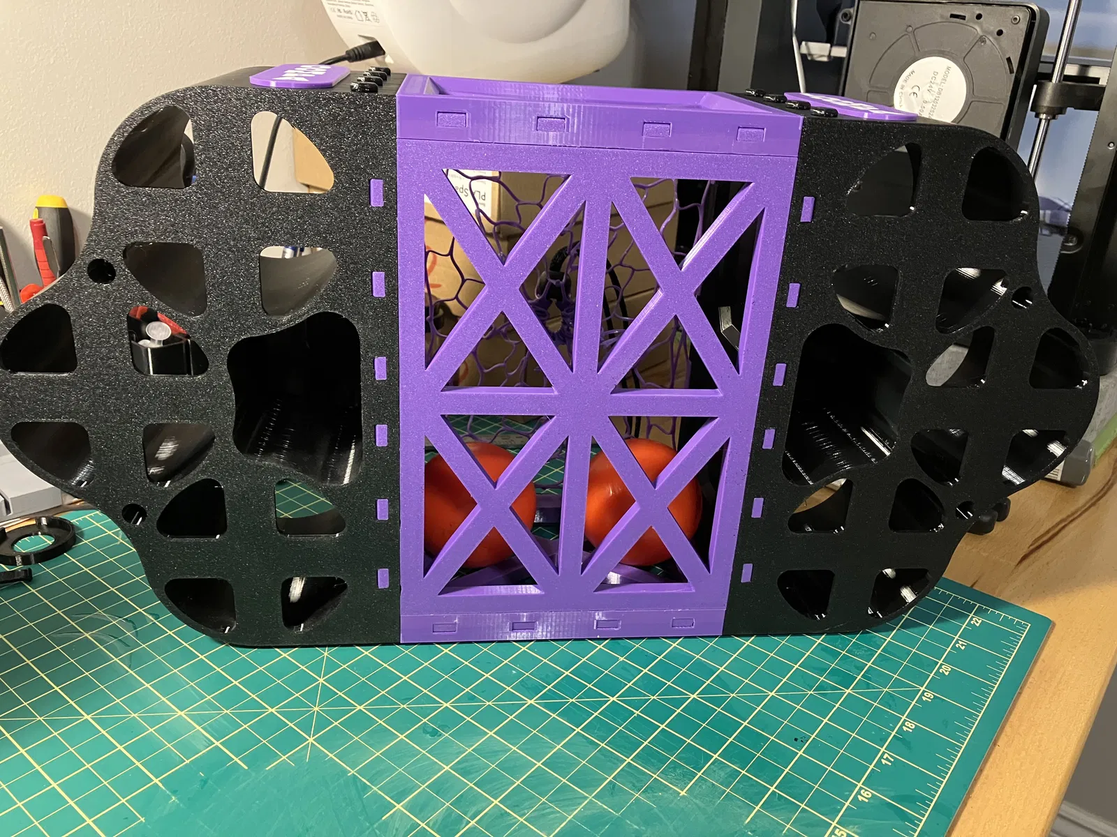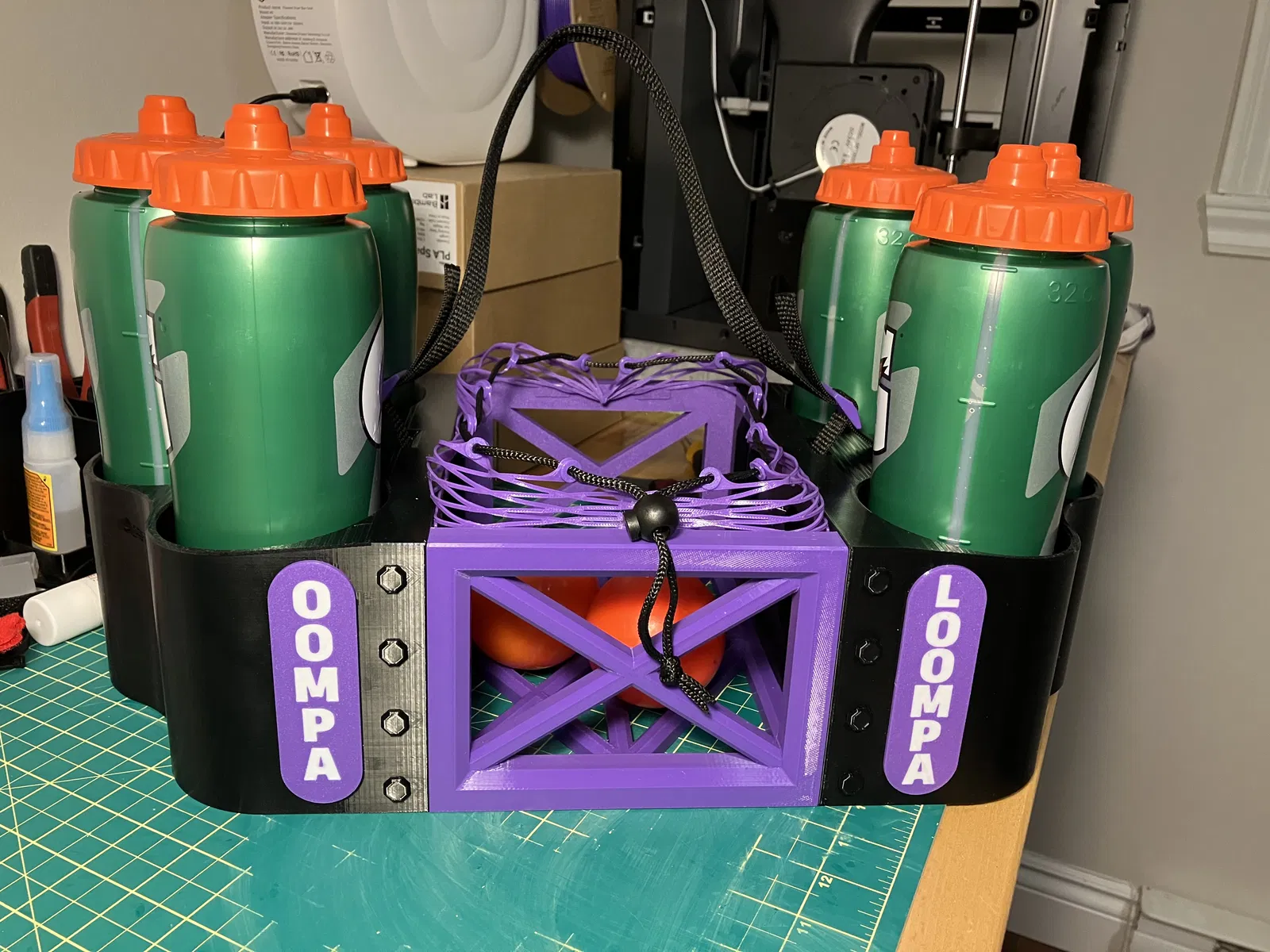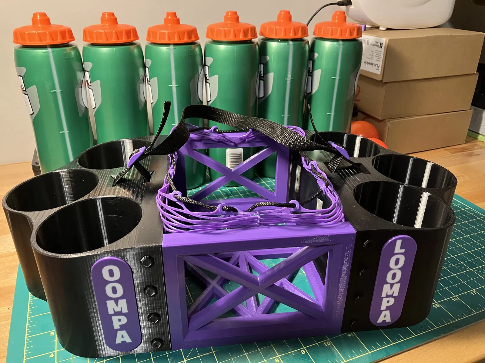 Tôi thiết kế cái này cho đội Dek Hockey của tôi để chúng tôi có thể mang cả chai nước và bóng cùng nhau trong một cái "gói gọn gàng". Nó gần như là một thiết kế hoàn toàn bằng TPU, tôi cần thứ gì đó chịu được va đập, chống mài mòn tốt và giữ được độ đàn hồi nhất định trong thời tiết lạnh, vì nó có khả năng sẽ ở trong xe hơi suốt mùa đông.
