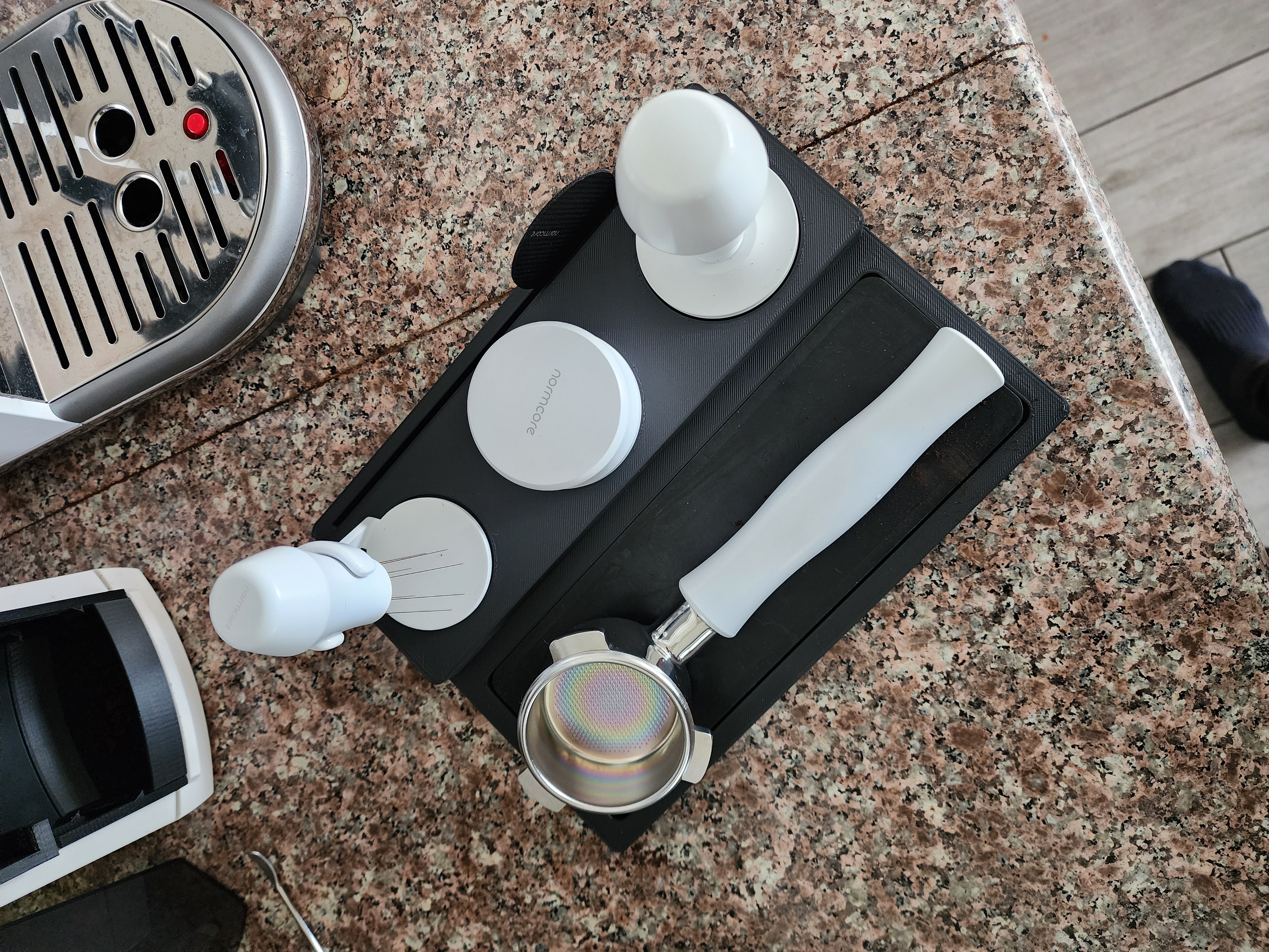 Một đế đầm cà phê espresso nhỏ gọn, thiết kế riêng cho các sản phẩm Normcore 54mm, giúp sắp xếp gọn gàng các phụ kiện như tay đầm, dụng cụ WDT và màn lọc bã.