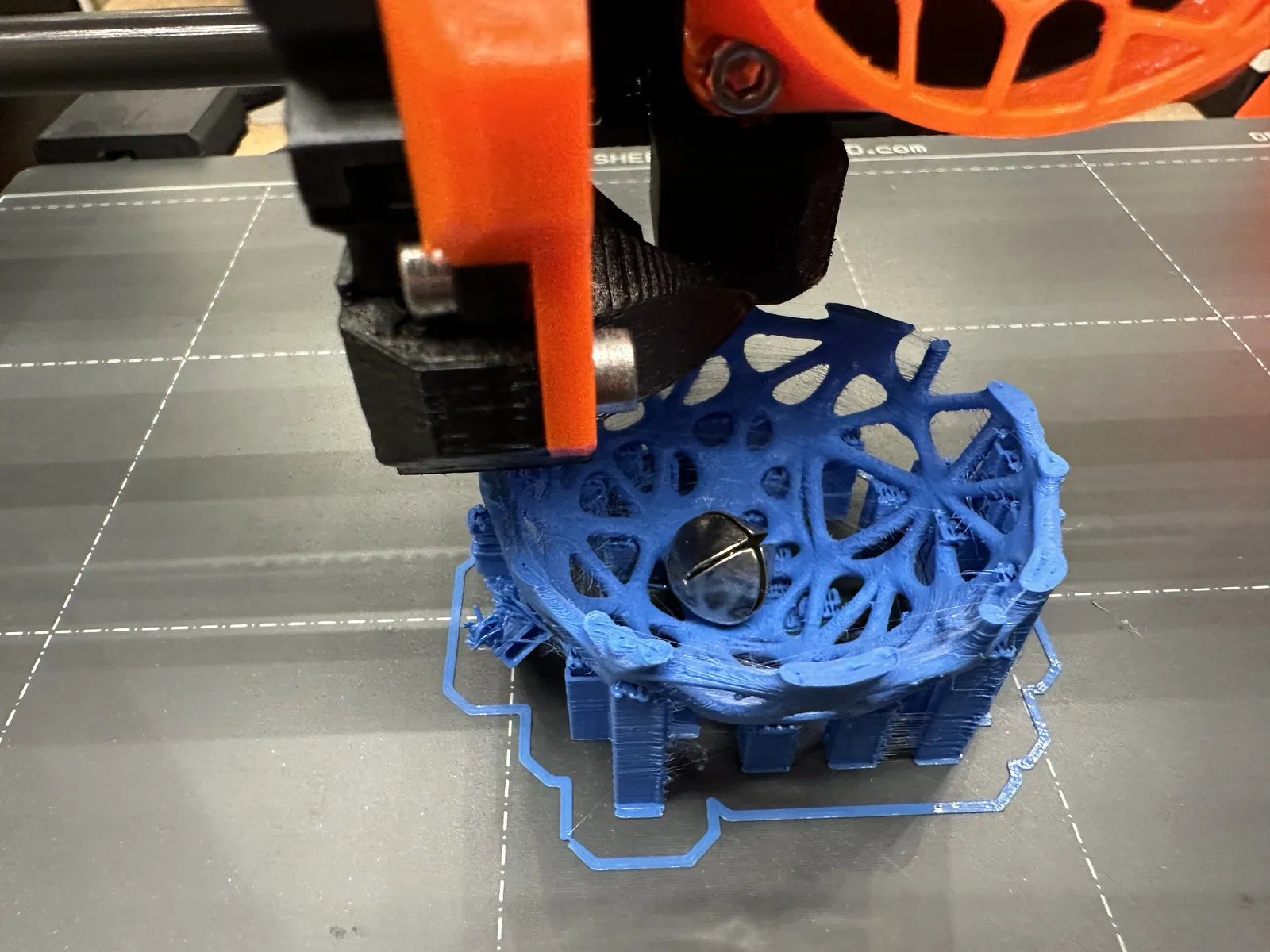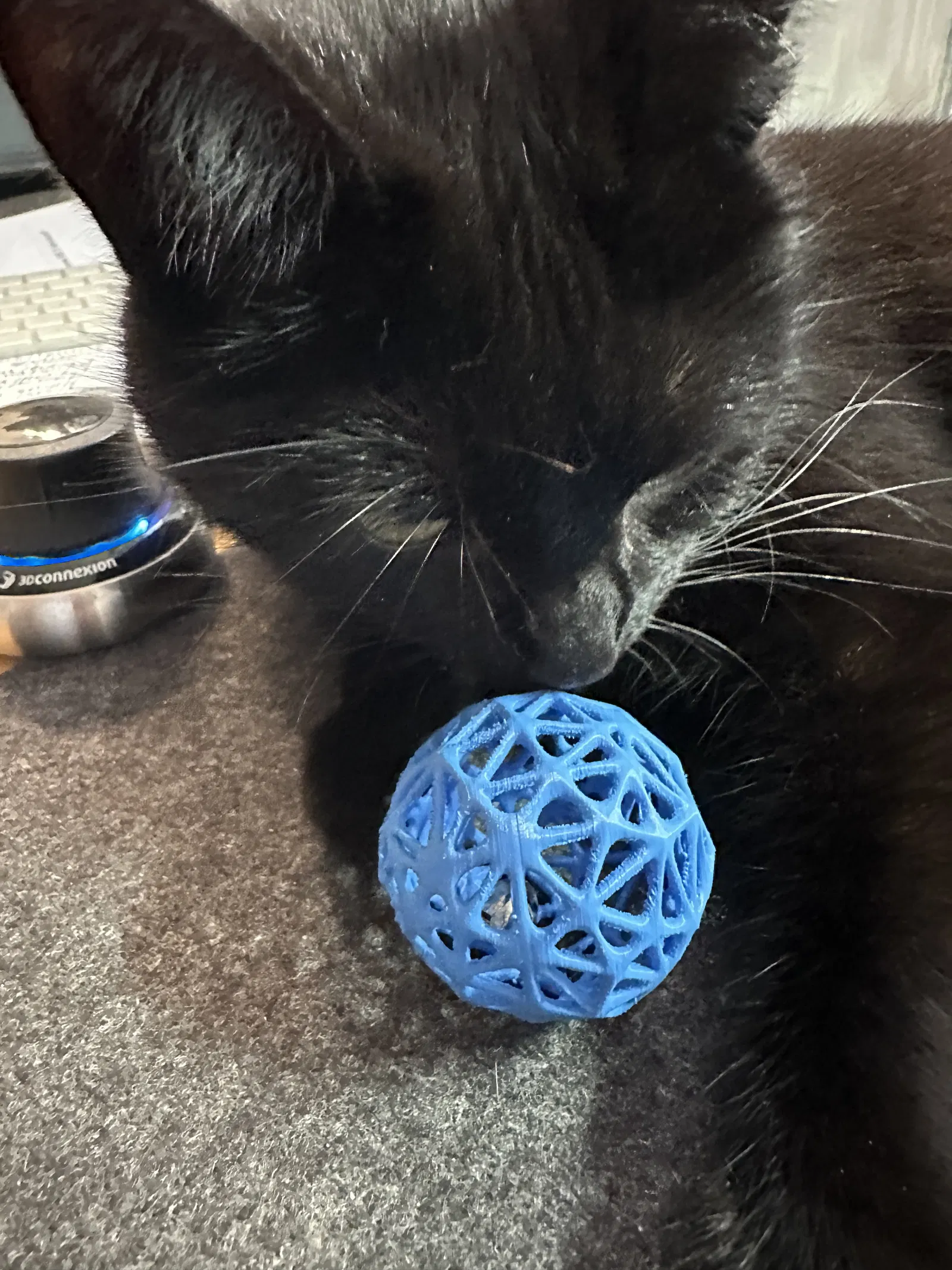 Đồ chơi cho mèo hoặc chó. Tui bỏ cái chuông nhỏ vô trong lúc in. Cần có support. Con mèo của tui có được cái hồn voronoi chưa? Chưa đâu.