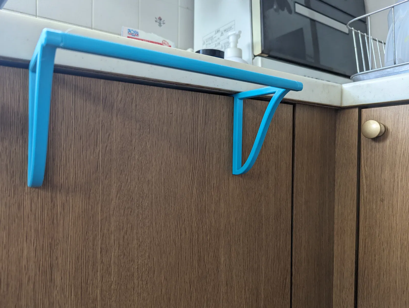 Móc treo khăn này có kích thước 20cm, cánh tay dài 10cm, rất phù hợp để treo trên cửa tủ bếp. Chất liệu PETG được khuyên dùng. Thiết kế giúp khăn ít chạm cửa, giữ vệ sinh và tránh ẩm mốc.