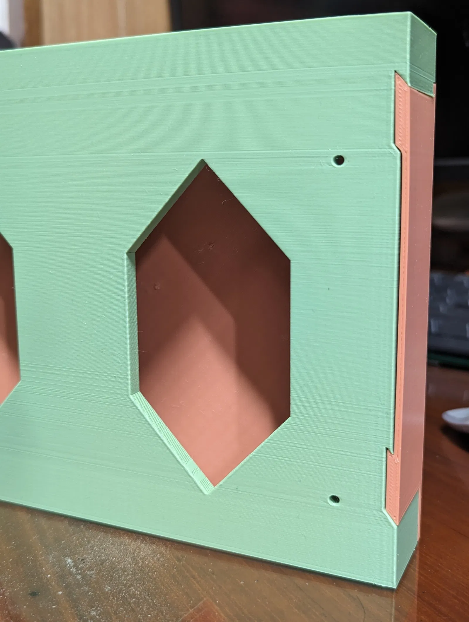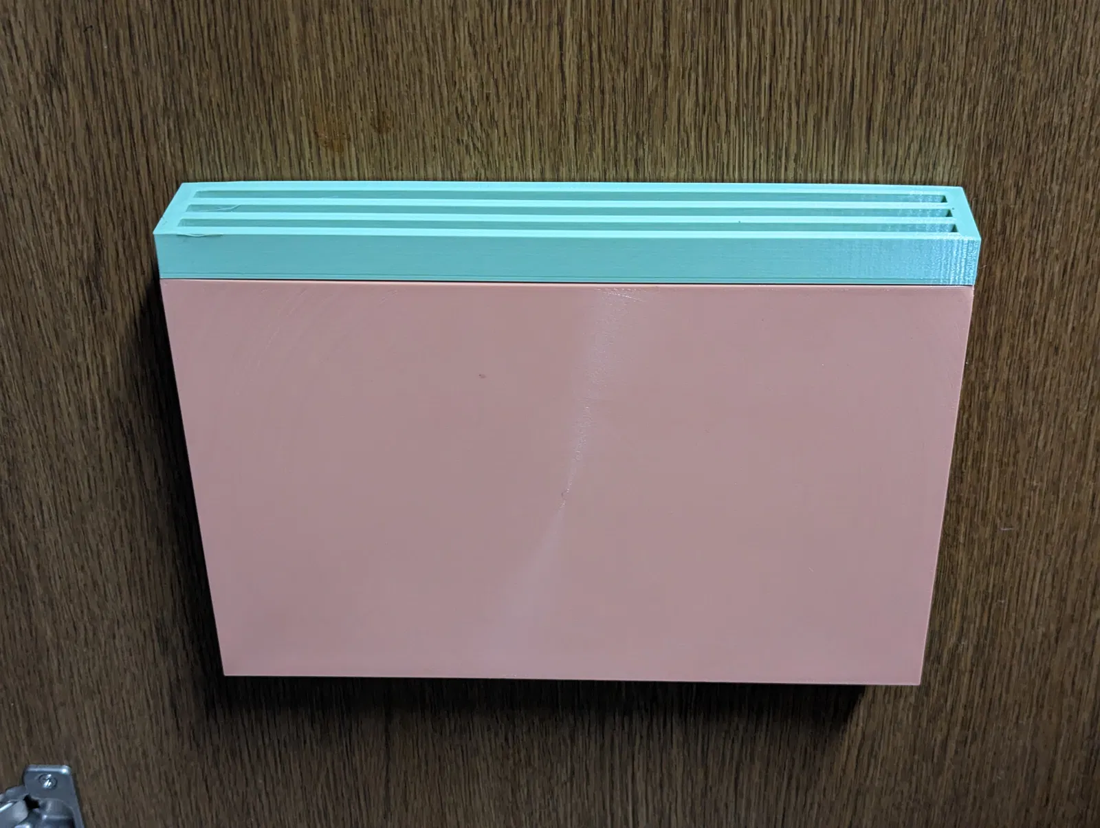 Chiếc giá đỡ trong ảnh được in bằng nhựa PETG Prusament màu Xanh Hạt Dẻ, và phần nắp được in bằng PETG Prusament màu Đất Sét Nhạt.