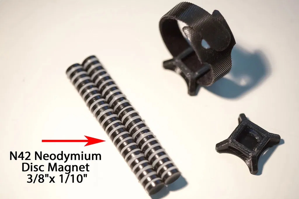 Mô hình này có đế nam châm giúp bạn quản lý dây cáp gọn gàng bằng cách giữ chặt dây đai. Chỉ cần luồn dây đai dạng velcro vào các khe trên đế là xong. Sử dụng nam châm N42 Neodymium Disc Magnets kích thước 3/8" x 1/10" để cố định.