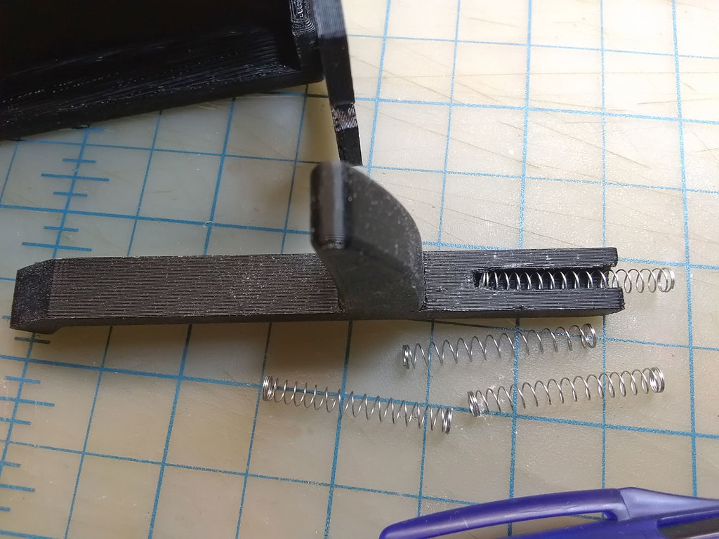 Để có phản hồi cò súng tốt hơn, tôi đã chỉnh sửa bộ phận cò súng để có thể lắp lò xo từ một cây bút bi thông thường trong nhà. Khi lắp lò xo vào và chà nhám bộ phận cò súng, cò súng sẽ cho cảm giác chính xác hơn.