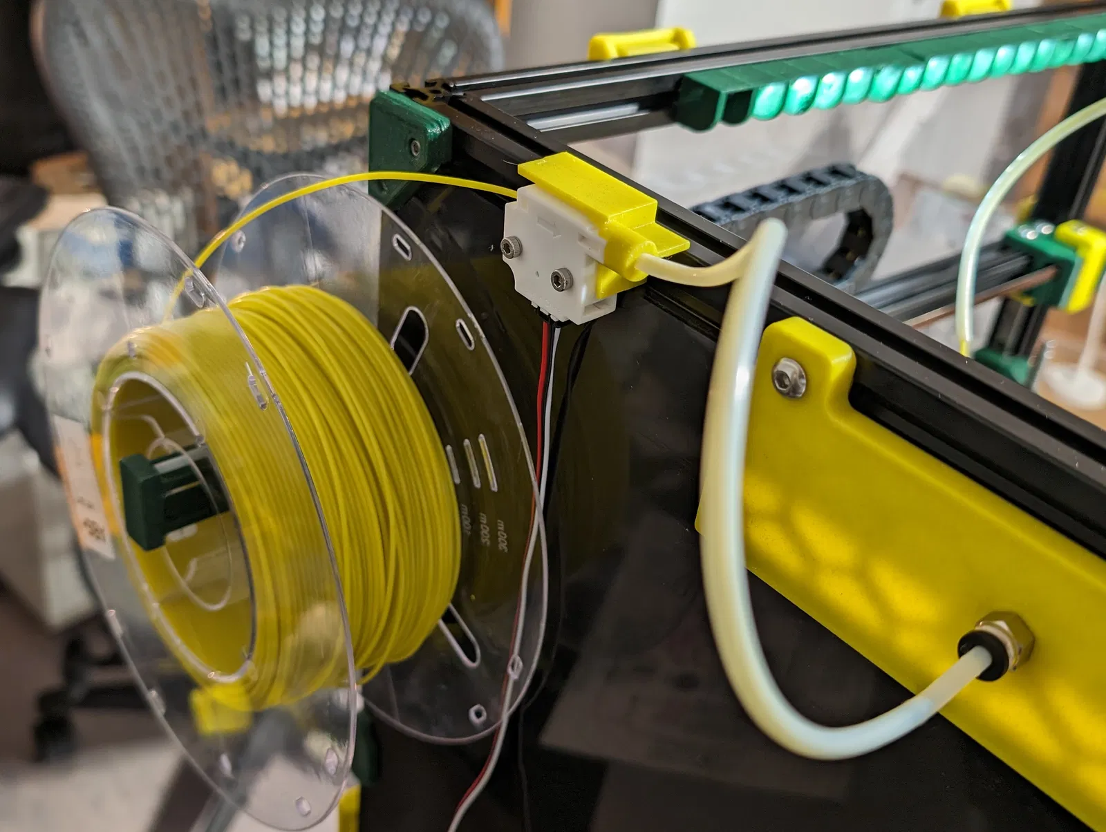 Tui đã in bằng màu nhấn Voron của mình dùng ABS nhưng loại vật liệu nào cũng được (miễn là ngoài vỏ máy) và có thể giảm infill.