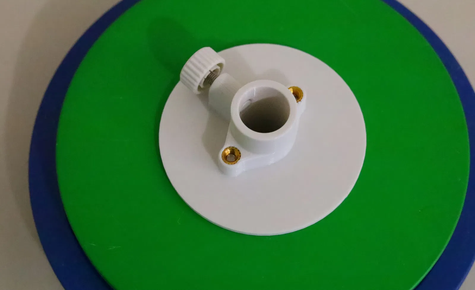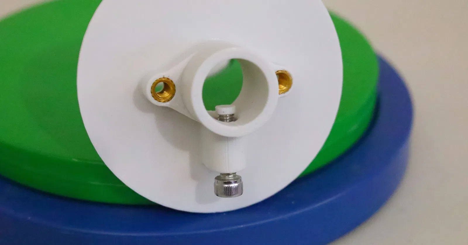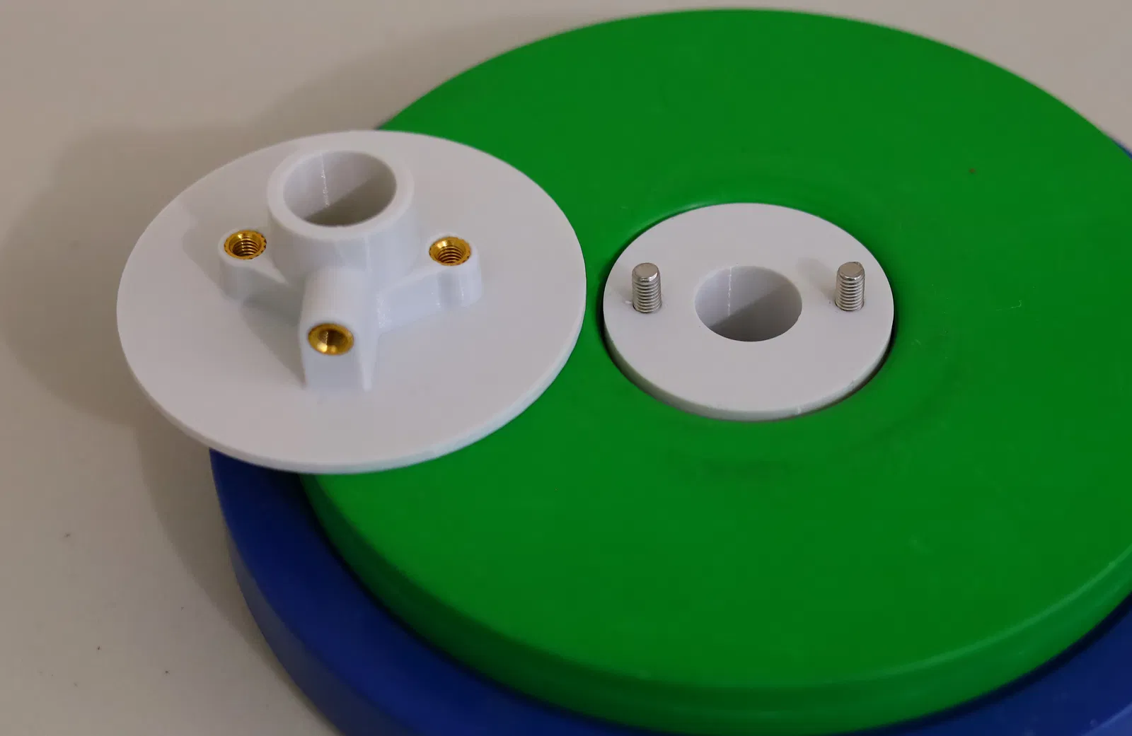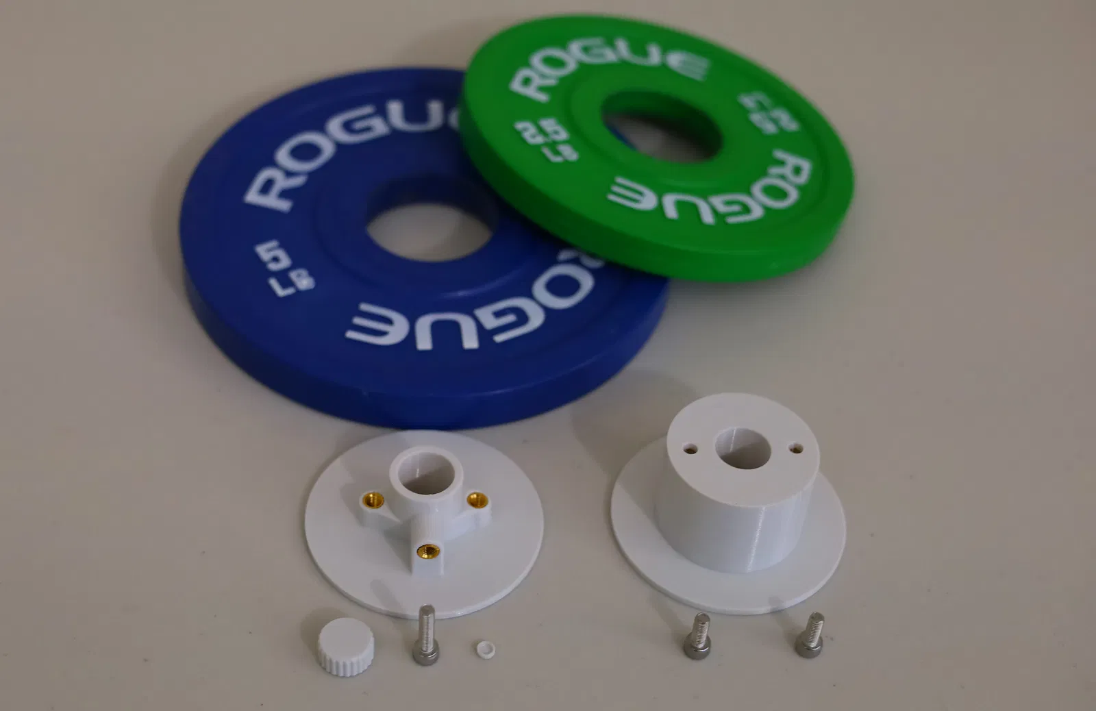 Nhập cái adapter cho đĩa tạ này. Về vật liệu cần thiết, nó dùng ba con vít M5x0.8 đầu lục giác (hai con dài 12mm, một con dài 20mm), và ba cái đai ốc ren xoắn M5 từ CNC Kitchen. Nó được thiết kế để in dễ dàng, nên không có gì bất ngờ cả.