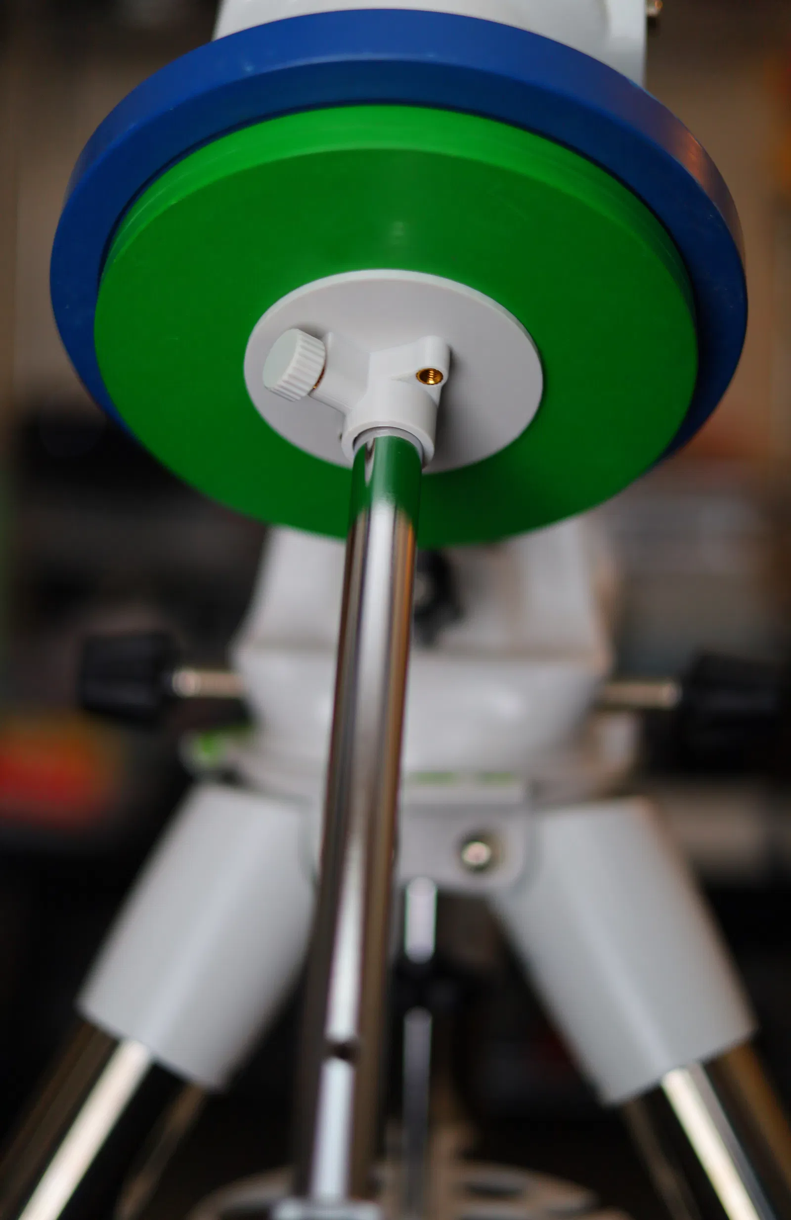 Tôi đã dùng mấy cái đĩa tạ thay đổi của phòng gym để cân bằng cho máy ảnh, và nhận ra rằng tôi nên dùng luôn mấy cái đĩa đó thay vì đầu tư thêm tạ đối trọng (mà rồi cũng sẽ quá nhẹ khi tôi thêm OTA thật vào mount). Cái adapter này có thể gắn vừa mọi loại đĩa tạ thay đổi kích cỡ Olympic.