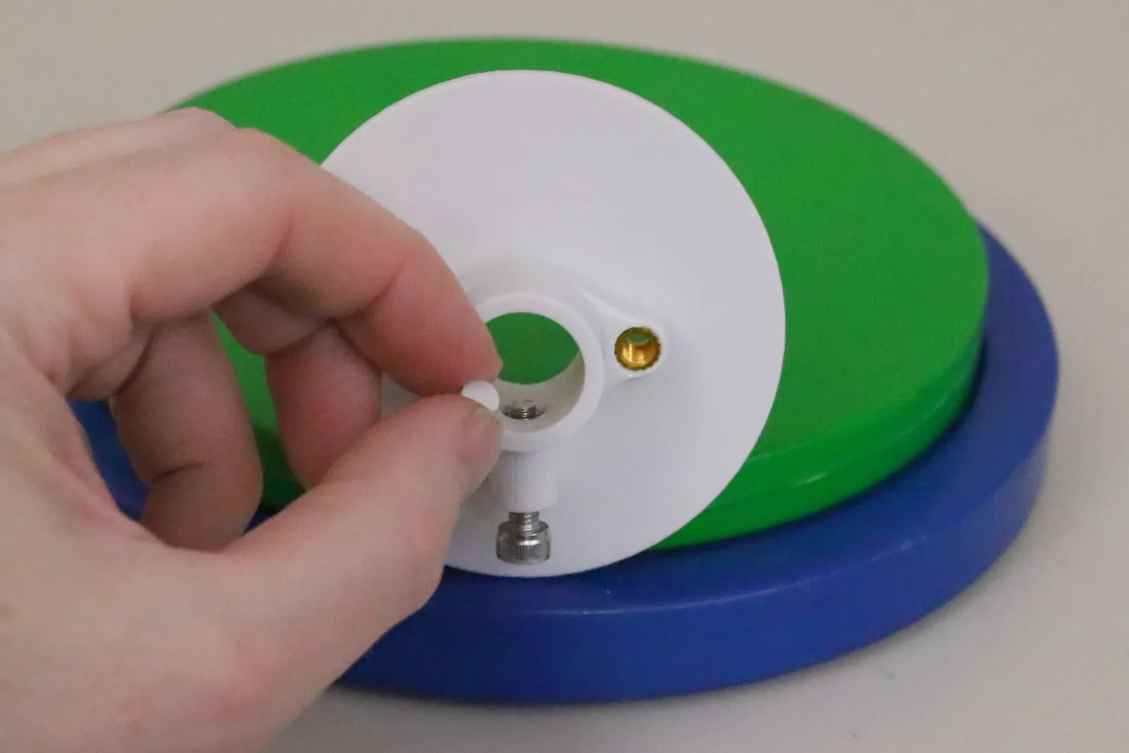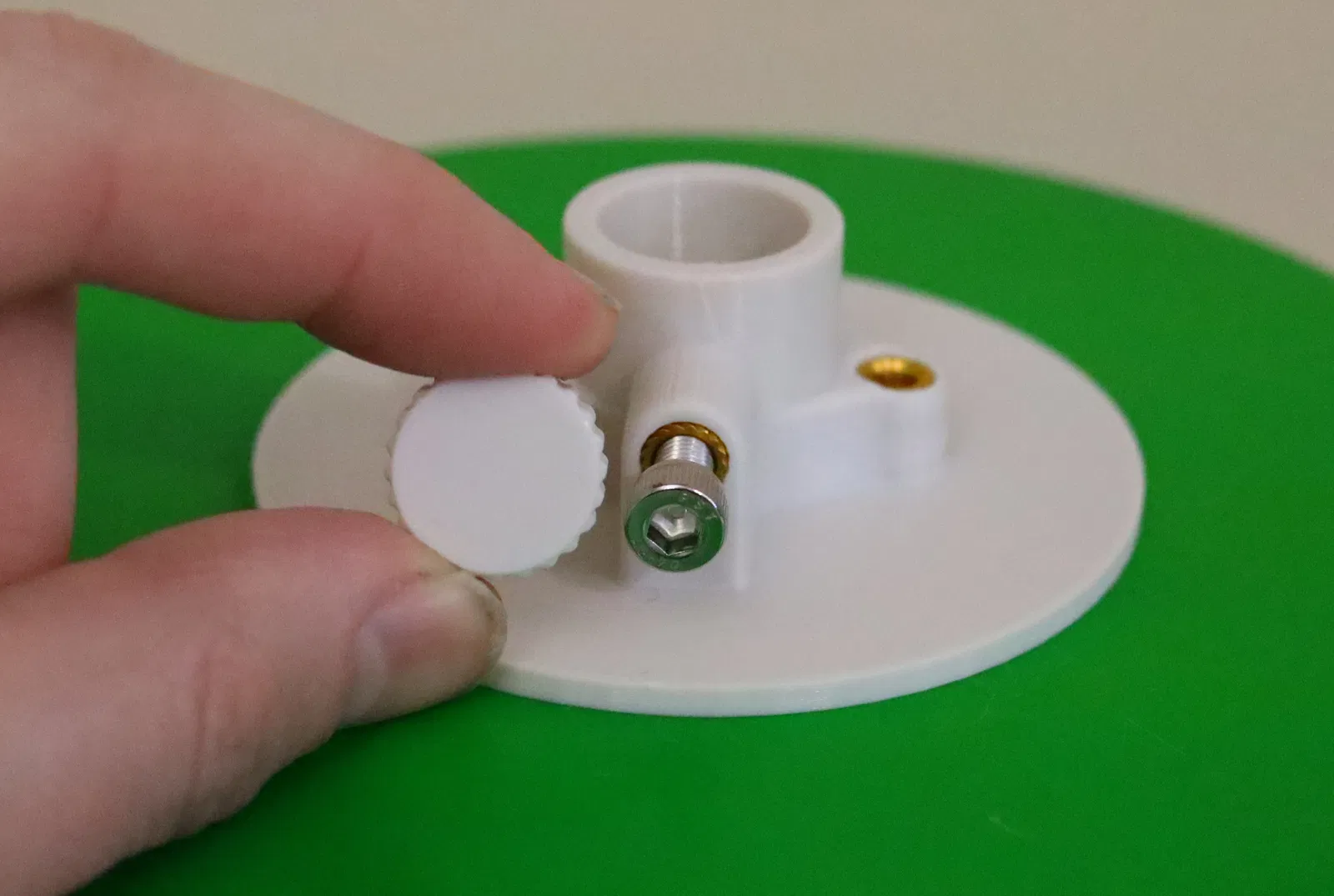 Đối với vít khóa vị trí, tôi gợi ý thêm cái “Soft end cap” để bạn không làm xước thanh đối trọng trên mount. Vặn vít khóa vào vị trí, và khi nó nhô ra khỏi lỗ bên trong, dùng ngón tay giữ phần đầu của vít không xoay theo trong khi bạn vặn vít theo chiều kim đồng hồ. Điều này sẽ làm chặt cái đầu bịt mềm vào vít. Đừng vặn vít khóa ra quá xa, nếu không cái đầu bịt này rất dễ bị bung ra. Có một khu vực lõm vào để chứa nó ở vị trí bằng phẳng trong khi trượt adapter vào thanh đối trọng của mount.