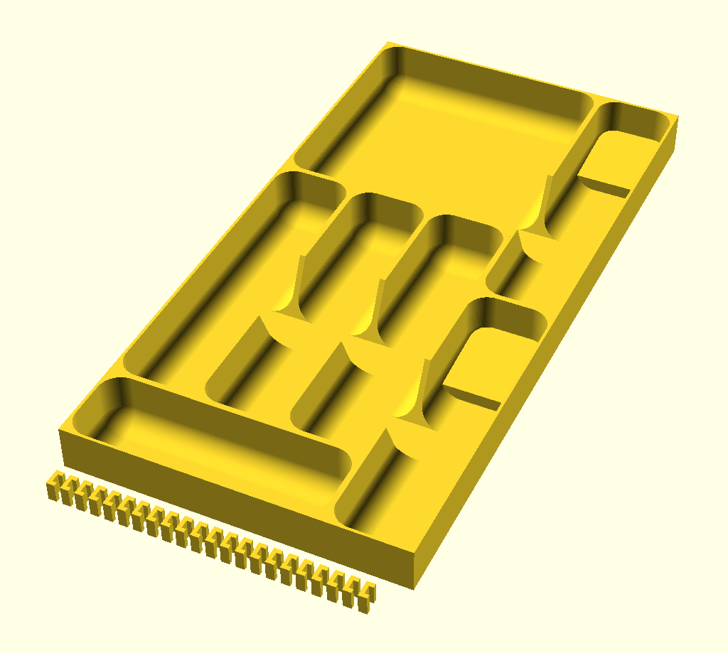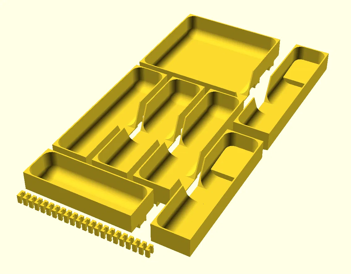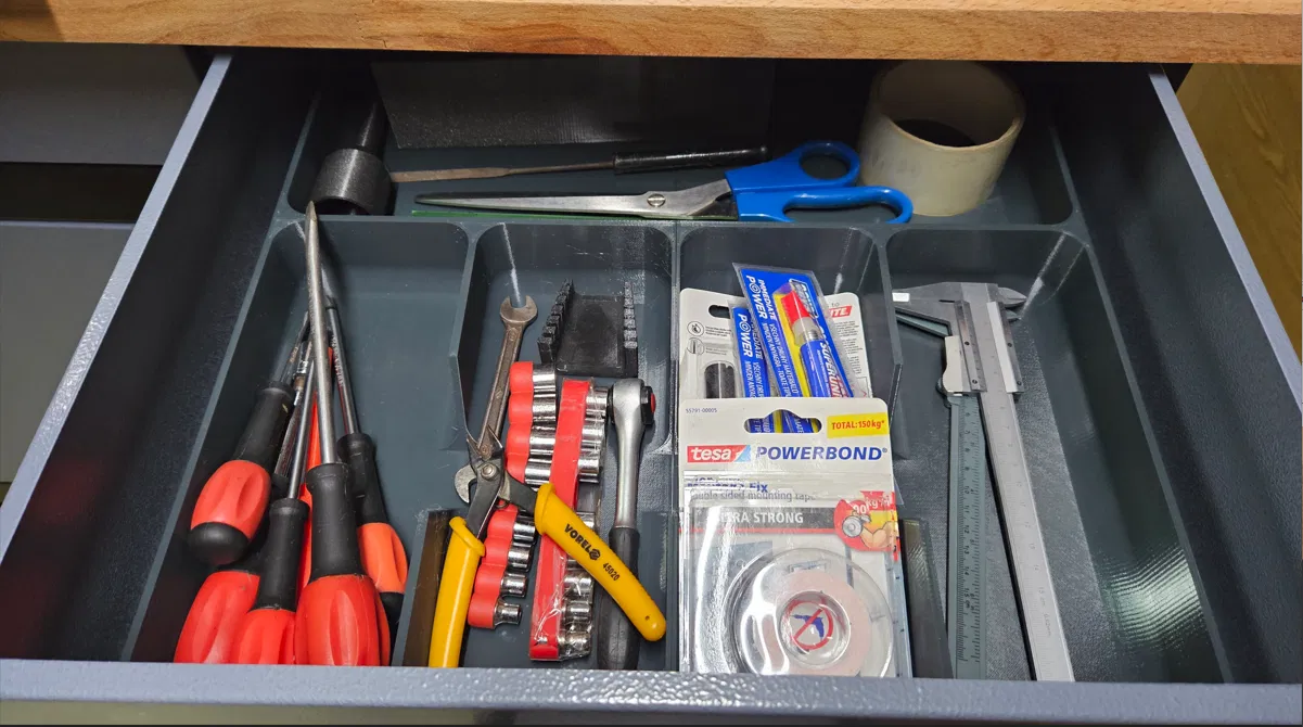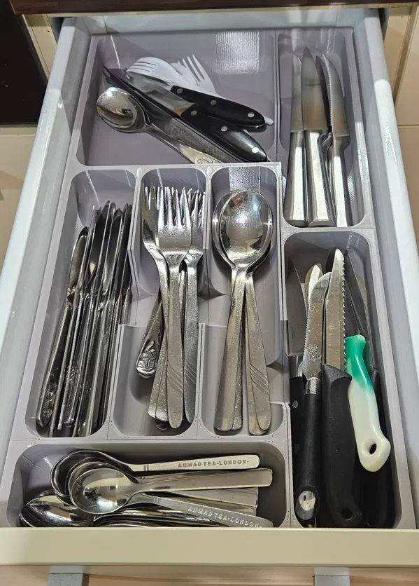 Tạo bộ sắp xếp ngăn kéo tùy chỉnh cho dao nĩa hoặc dụng cụ với các module lưới 59mm. Bộ phận có thể kết nối với nhau bằng cơ học, không cần keo. Phiên bản cập nhật bao gồm các biến thể cạnh, góc, và tùy chọn cho ngăn kéo nghiêng. Có thể tùy chỉnh bằng tập lệnh OpenSCAD.