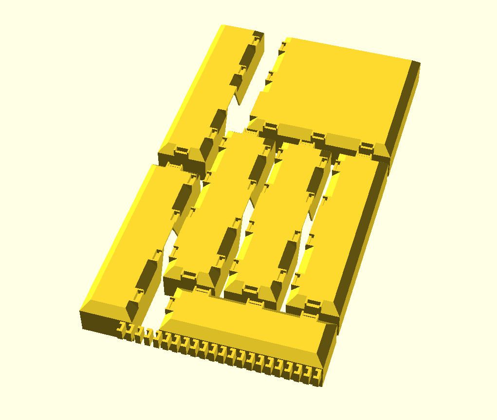Lệnh để tạo bộ phận theo tham số: section(multx,multy,openl,openr,conf,conr,conb,conl,stepb,stepf,tiltl,tiltr); // multx = nhân module X // multy = nhân module Y // openl = nhân module Y nơi nó tạo lỗ trên thành trái (0=tắt) // openr = nhân module Y nơi nó tạo lỗ trên thành phải (0=tắt) // conf = boolean, thêm các khối kết nối ở mặt trước // conr = boolean, thêm các khối kết nối ở mặt phải // conb = boolean, thêm các khối kết nối ở mặt sau // conl = boolean, thêm các khối kết nối ở mặt trái // stepb = boolean, thêm hỗ trợ ở mặt sau (lưỡi) cho dao có tay cầm rộng hơn // điều này giúp giữ dao nằm ngang và tránh bị kẹt bên trong ngăn kéo // stepf = boolean, giống như stepb nhưng hỗ trợ được thêm ở mặt trước // tiltl = mở rộng thành trái thêm tiltl mm cho ngăn kéo nghiêng hoặc lấp đầy khoảng trống // tiltr = mở rộng thành phải thêm tiltr mm cho ngăn kéo nghiêng hoặc lấp đầy khoảng trống